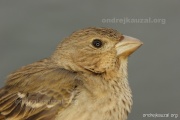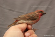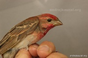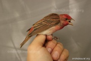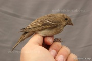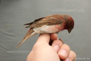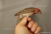 A rather interesting individual with unusual orange coloration. Such coloration is caused either by deficiency of red carotenoids in its diet and/or deficiency in the metabolic pathway metabolising red carotenoids from diet. One way or another, it would be interesting to know if this bird is "advanced" young bird (i.e. 2CY, euring: 5) or contrary an old individual of low body quality (2CY+, euring: 6). Ageing Scarlet Rosefinches apart from red/brown indiviual is not particularly easy and I am still not sure. If you have any ideas, please let me know.