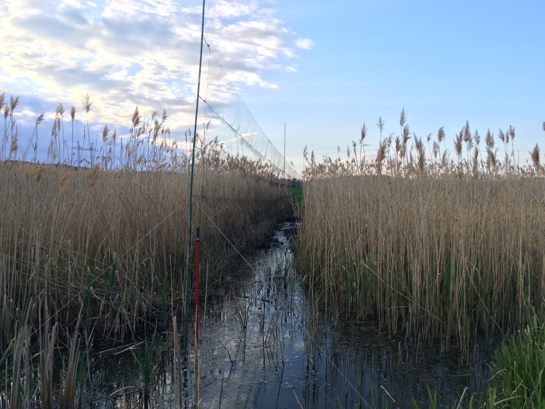 K rybníku přes, byť krátkou, ale hodně hrbolatou polní cestu dojíždím kolem šesté. Mimochodem, tahle polňačka je takový další anger management prvek mých cest do rákosí, při kterém se musím smířit sám se sebou – přes tuhle cestu totiž člověk musí opravdu místy krokem, rychleji to nejde nebo nedojede už nikam. Vystupuji z auta a zběžně kontroluji rybník. Rybáci černí zde nejsou. Dnes se nedozvím, jak reagují na nahrávku, nevadí. Navlékám tedy podřiťáky a vyrážím stavět dvě linie do rákosí. Jednu krátkou, tak akorát na jednu dvanáctku s většími oky, do užší části rákosí, ta bude na konipasy. A druhou ze tří dvanáctek do širší části rákosiny s menší lagunou, ta bude hlavně ráno na rákosníky. Tenhle průsek už je pěkně vyšlapaný a za pár let se jistě objeví i na zdejších fotomapách. V dlouhé linii jsem z bahna vyšlápl i jednu slučku, tak uvidíme, jestli se večer vrátí (nevrátila).
