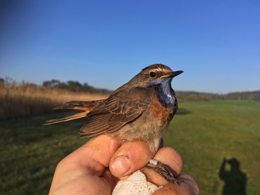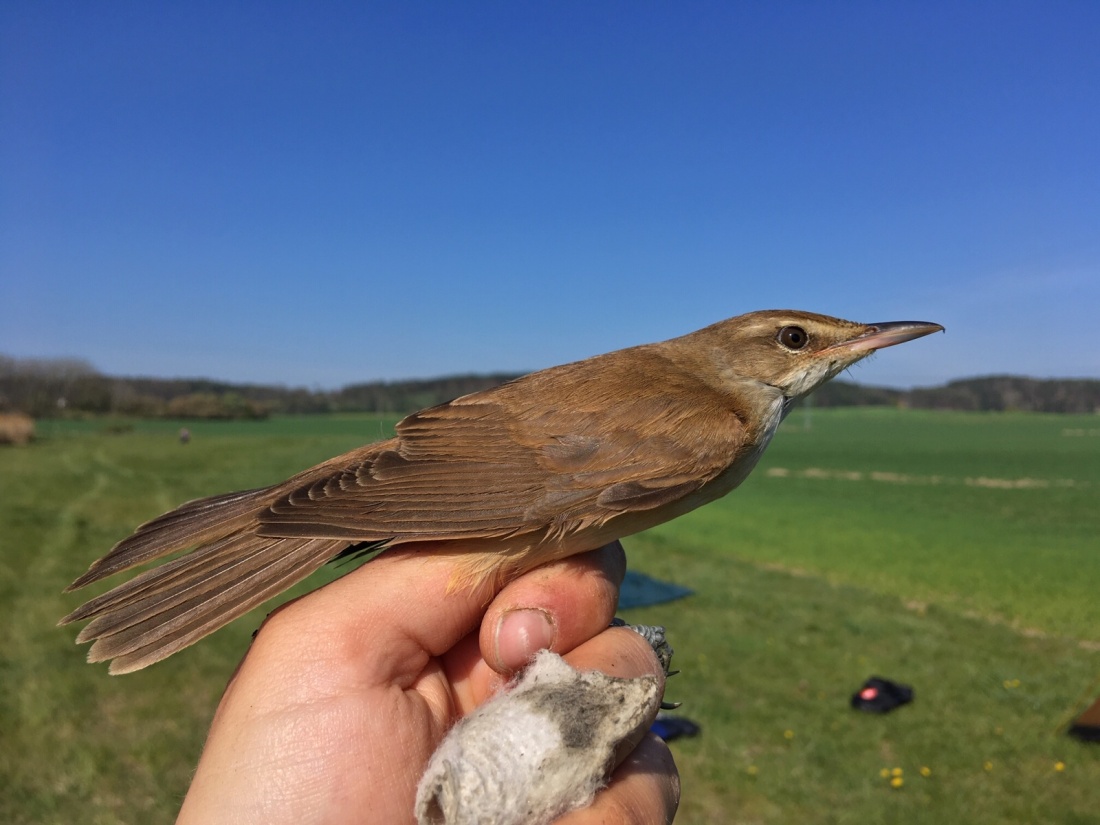 Při otevření stanu mě poněkud zaskočilo křupání tenké vrstvu ledu na tropiku. Opět jsem zapochyboval o svém rozhodnutí, ale to už jsem stál venku a nasával probouzející se rybník všemi smysly. Nazout podřiťáky a hurá do ledové vody roztahovat sítě. Do imaginárního notýsku jsem si poznamenal, že příště si mám vzít také rukavice. Slunce se naštěstí brzy vyhouplo nad kopec a rychle mne dostalo na provozní teplotu, takže první a tradičně nejbohatší kontrolu jsem prováděl už opět s pozitivně naladěnou myslí. Mezi četnými rákosníky proužkovanými i obecnými visel i jeden krásný bramborníček hnědý, letos již druhý v tomto kousku rákosí. Zcela jistě tahový, ale i tak mně baví si uvědomit, že o pár metrů dál má své teritorium nejeden bramborníček černohlavý. Ještě jeden druh mi ráno dělá radost, i když jsem s ním počítal, protože už se zde pár dní ozývá – rákosník velký. Můj oblíbený rákosník. Je to skoro rok, co jsem jej držel naposledy v ruce a opět jsem zapomněl, jaké je to vlastně monstrum.