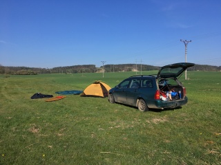 Dávám ptáky spát bezpečně do auta a odcházím za terénní vlnu postavit stan. Nechci provokovat místní v nedaleké vesnici. Noc se rychle ochlazuje, ale zůstávám pozitivní a do stanu se těším. Z protějšího břehu zpívá slavík obecný, další druh, který mne zde příjemně překvapuje, jsme přeci jen na Vysočině. Ještě jsem se párkrát vrátil do auta pro zapomenuté věci (co není v hlavě je v nohách) a kolem desáté uléhám. Ticho noci občas prořízne rosnička, ke které se brzy přidá celý orchestr kolegů. Snažím se najít pohodlnou polohu a rychle usínám.