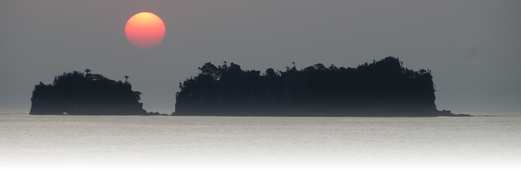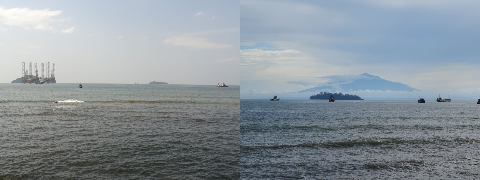 Dohlednost v tropickém parnu je mizerná. Na levé fotografii vidíte pohled z Miramare směrem k rovníkové Guinei. Zhruba 40 kilometrů tímto směrem se tyčí další vulkanický velikán, Pico Basilé (3 011 m). Že tam na obzoru opravdu je obrovská sopka člověk zjistí až v období dešťů, kdy je vzduch vyčištěn od prachu.