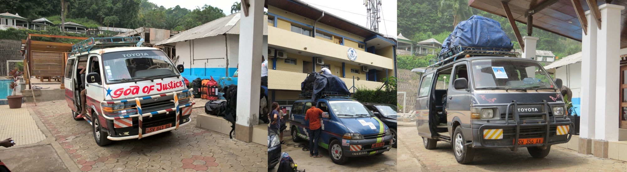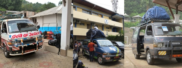 Shora/zleva: (1) Kamerunský provoz je poloorganizovaný chaos. Mezi všemožnými vraky toyot se proplétají všudypřítomné motorky. Přejít takto rušnou silnici je hrdinství srovnatelné s bojem se lvem holýma rukama (foto: MM). (2) Náš nejčastější dopravní prostředek Toyota HiAce v různých provedeních; mimochodem ten papír na čelním skle auta vpravo je parte místního doktora (koláž: TK, já).