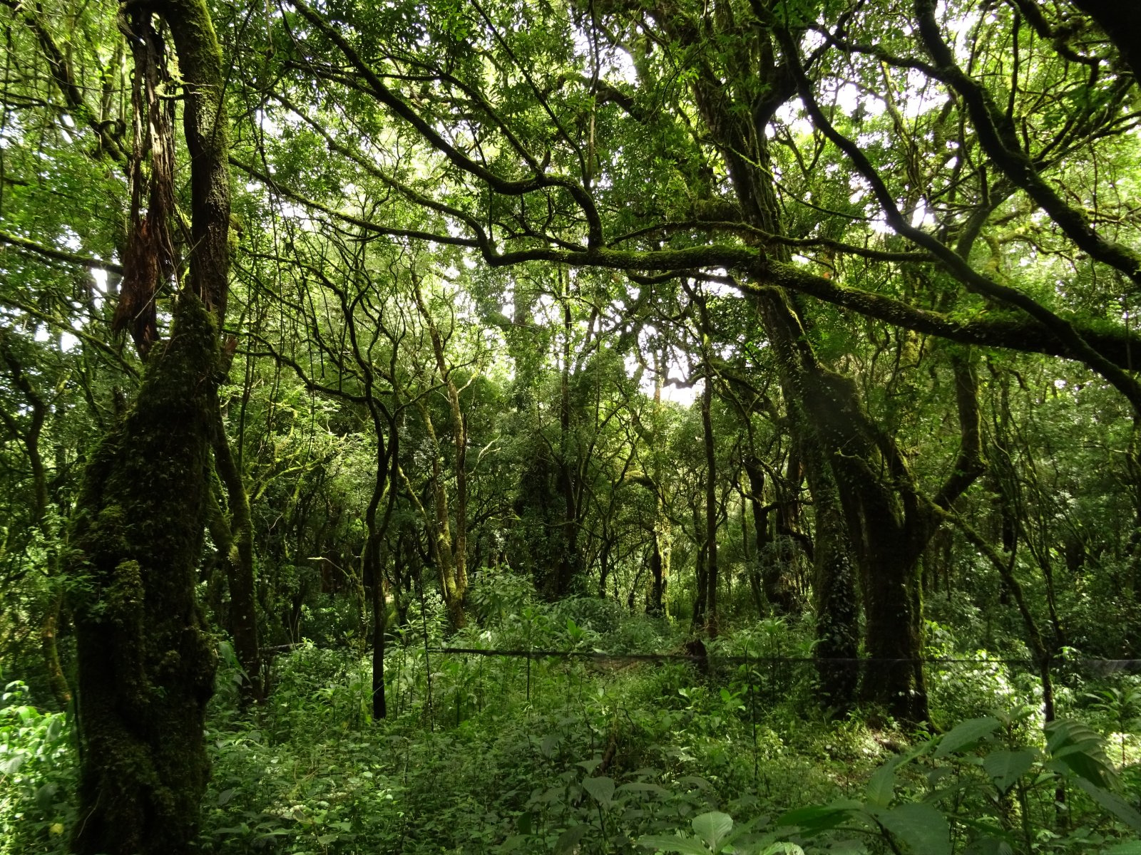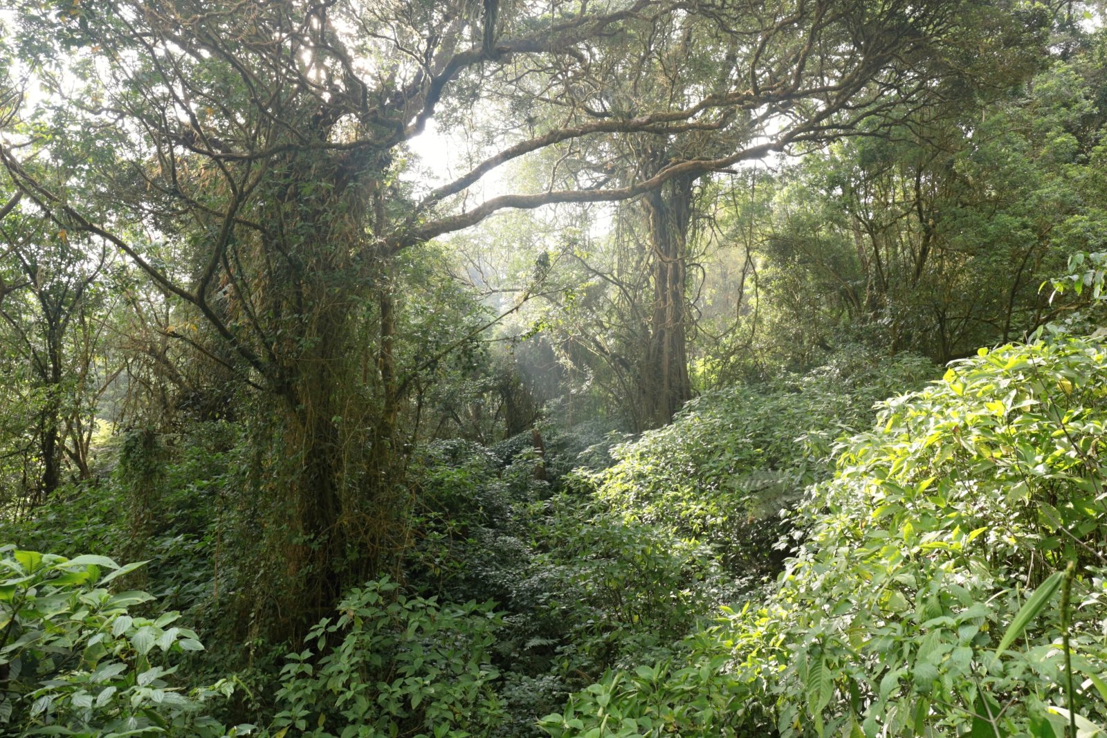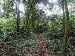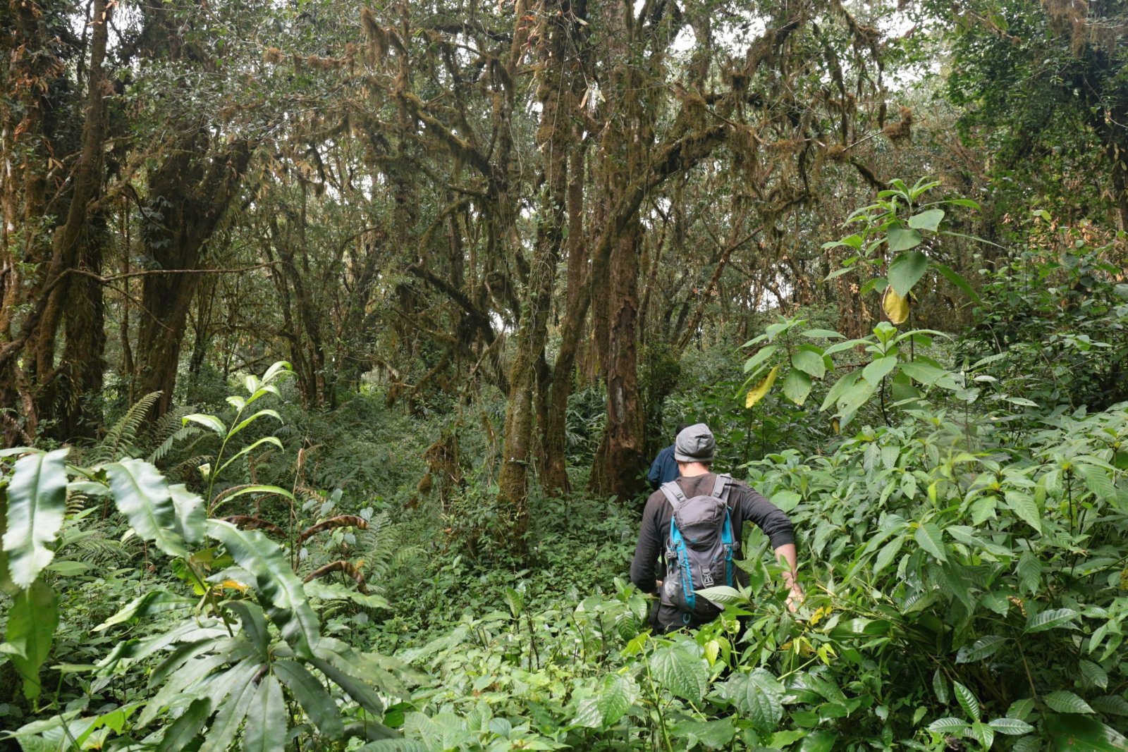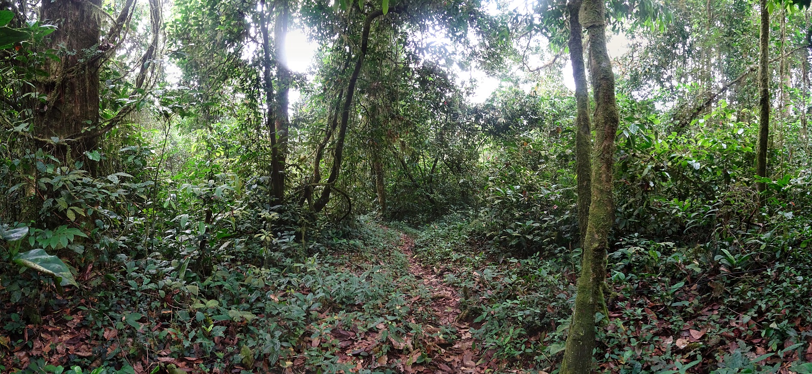 Zprvu pohodový výšlap se velmi záhy mění v úmorný stoupák složitým terénem. Teplota je takto vysoko nad mořem nižší, ale pořád kolem dvaadvaceti stupňů. Vlhkost je zde všude stoprocentní a velmi brzy jsme všichni mokří jako myši. Čeká nás asi kilometr a půl převýšení na treku dlouhém 13 kilometrů. Stoupání je nekonečné. Všichni porteři se nám brzy ztrácí a začínáme zaostávat. Nevadí, cesta je pořád nahoru a není kam odbočit. Já ji znám, tak jdeme sami. Notnou dobu procházíme sekundárním porostem – znovuobrozeným pralesem na bývalých polích. A někdy i na stále používaných, těžko říct. Tropické zemědělství boj s plevely totiž nezná. Vše roste tak nějak samo, bují a po čase se prostě „jen“ sklidí. Postupně ale pole řídnou, místní lidé ubývají a my se ocitáme ve skutečném pralese, v tom tzv. primárním, člověkem nenarušeným. Je temný a překvapivě tichý. Ptáci se teď ozývají jen málo a většinu zvuku produkují otravné cikády. Mezi ptáky po hlase rozeznávám některé druhy nebo alespoň čeledi. Hlasitým robotickým vřeštěním se ozývají ťuhýkovci černolesklí (Laniarius poensis; v podstatě endemit této části Kamerunské vysočiny), jako stehlík na steroidech prozpěvuje některý ze strdimilů (Nectarinidae) a flétnovými hlasy prozpěvují bulbuli (Pycnonotidae). Tenkým stoupavým nápěvem z jednoduchých tónů zpívá lesknáček rudobrvý (Platysteira cyanea) a z křoví se ozývají všelijak různé prinie (Cisticollidae). Podle hlasu mezi nimi rozeznávám hlavně pěnicovce olivovohřbetého (Camaroptera chloronota). Jeho zpěv je totiž velmi charakteristický. Je to nesmyslně dlouhá, přímo nekonečná i několik minut trvající kaskáda jednoduchých hvizdů, každý o malinko nižší než předcházející[4]. To vše slyším, ale v podstatě nevidím. Část ptáků je vysoko v korunách, část naopak ukrytá v neprostupném křoví. Nevadí, tam „nahoře“, kam máme namířeno, to bude lepší.