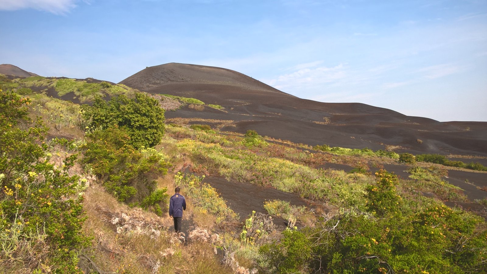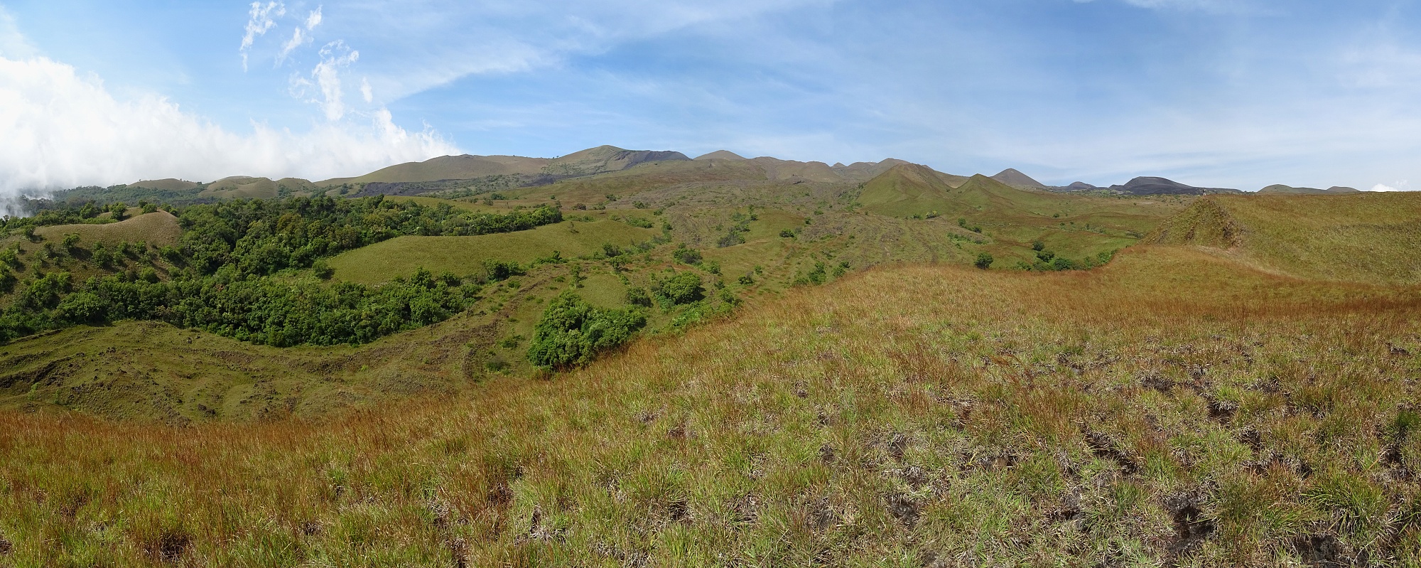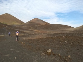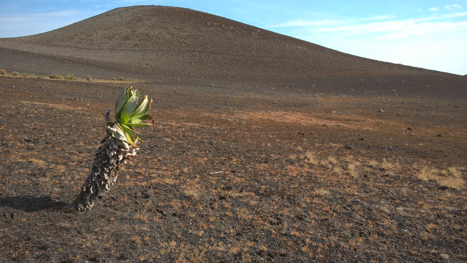 Jsme asi ve dvou kilometrech nad mořem a teplota klesá k příjemným asi 18 stupňům. Vlhkost je pořád velmi vysoká, ale na rozdíl od pralesa zde na savaně dost fouká, takže je nám velmi rychle zima – propocené oblečení rychle odvádí tělesné teplo pryč. Další asi 3 kilometry jdeme převážně touto horskou savanou, která je zcela nepodobná ničemu, co jsem do té doby viděl. Zleva pořád sledujeme hranici lesa, která je ostrá, jako by ji někdo nakreslil tužkou. Chvíli jsme blíž, chvíli dál, ale do pralesa už v podstatě nezavítáme. Sopečná krajina je plná neskutečných tvarů. Překonáváme neustále jeden sopečný „fald“ za druhým, a občas procházíme kolem zpola zasypaných lávových tunelů, kde hnízdí místní horské vlaštovky kamerunské (Psalidoprocne fuliginosa; endemit Kamerunské vysočiny a Bioka). Překonáváme i jeden nebo dva lávové proudy vzniklé během relativně nedávných erupcí. Mimochodem, tato část Mt. Cameroonu je díky jednomu opravdu velkému lávovému proudu ušetřena vlivu slonů a prales je zde hustý a s bohatým podrostem. Sloni tyto hromady ostrého čediče nedokážou překonat a tak si můžeme užívat poměrně bezstarostného bloumání po okolí.