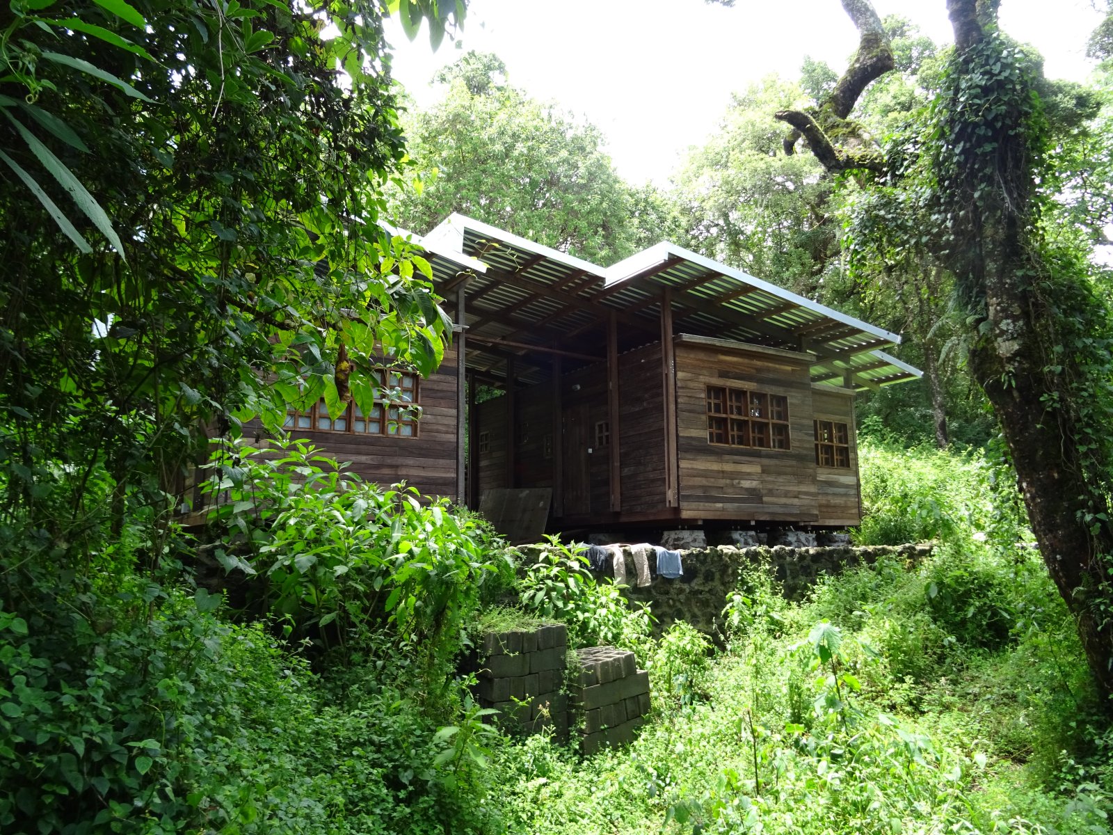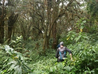 Shora/zleva: (1) Horský mlžný les nejvyšších poloh. (2) Jedna ze skupin chatek, ve kterých jsme zde bydleli. Část jich byla v lese, část na savaně.