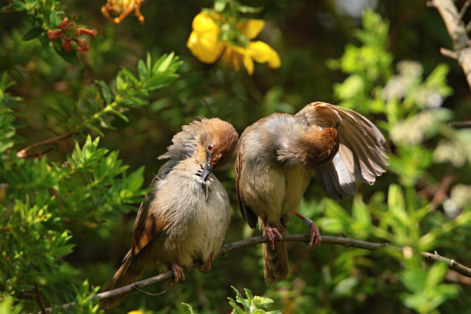 Z těch méně běžných druhů pak stojí za zmínku například mechově zelený „čurolajs“, tedy prinie zelenohřbetá (Urolais epichlorus), tvarem těla podobná mlynaříkovi, nebo můj vůbec nejoblíbenější z odchycených druhů – strnad Emberiza goslingi (nemá zatím české jméno[6], dříve to byl poddruh strnada skalního, Emberiza tahapisi). Podařilo se nám postupně odchytit celý pár, krásná náhoda. Podobně jako u jiných strnadů i u tohoto druhu je samička trochu vybledlejší kopií samečka. Ten připomíná zbarvením nejvíce asi strnada viničného, abych použil příklad, který si středoevropský ptáčkař asi nejlépe představí. Jinak je samozřejmě podobný všem ostatním strnadům z tohoto druhového komplexu – tedy celý rezavý se světlounce šedou černě pruhovanou hlavou. Zároveň je to strnad vskutku maličký, i ti nejmenší strnadi rákosní jsou větší. Rozkošnost sama. Mimochodem, děravé znalosti o místní avifauně ilustruje dobře třeba právě i tento druh strnada – podle map by zde neměl vůbec žít, stejně jako například zvonohlík mozambický (Crithagra mozambica), na kterého jsme narazili dole v Limbé.