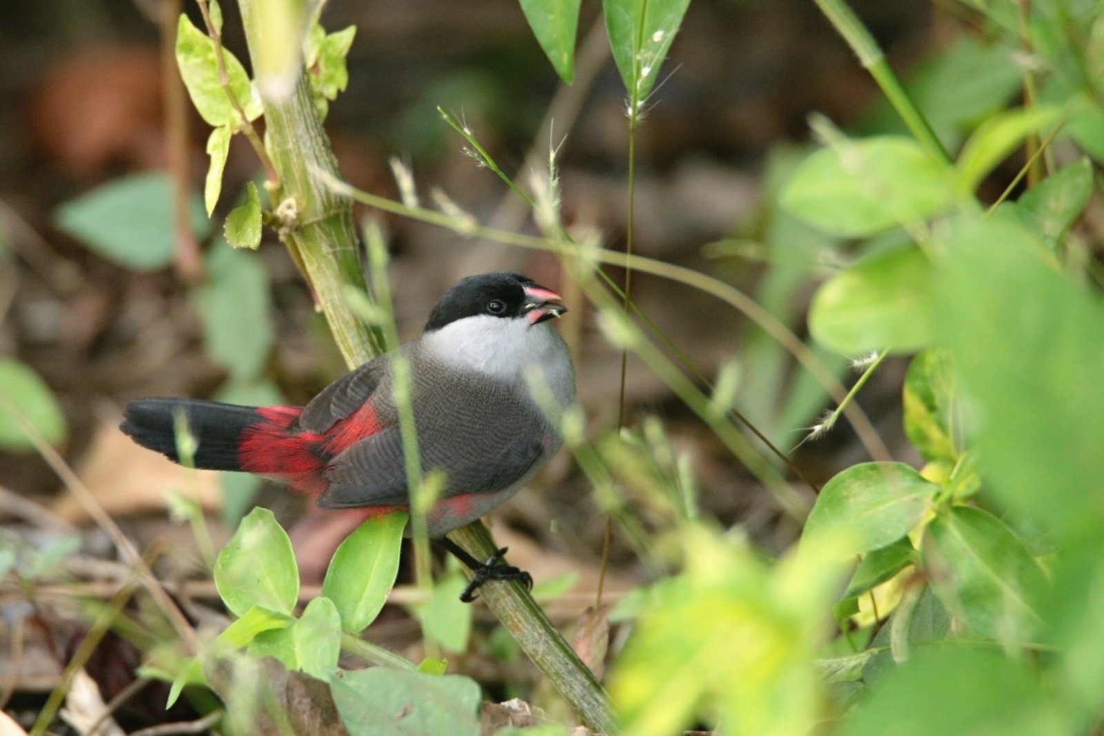 A co že to tedy celý den chytáme? Ponejvíce je to trojkombinace euplekťák–rajchle (tedy Cinnyris reichenowi)–budníček větší. Hned v závěsu je místní překrásná obdoba zvonka – stehlíkovec oranžovozobý (Linurgus olivaceus). Sameček je celý zelenožlutý s černou hlavou a mrkvově oranžovým zobákem. Tito ptáci nejsou v pralese skoro vidět, ale v sítích jich máme tolik, že je přehazujeme vidlemi. Hodně se nám chytají i již zmínění bulbuli horští a drozdi afričtí. Zato ťuhýkovec je vždycky druh hodný oslavy. Radost mi vždy udělají i drozdíci horští (Oreocossypha isabellae; opět endemit), docela velcí horští „muscikapidi“ – oranžoví zespodu, šedí na zádech a na hlavě, s frajerským bílým nadočním proužkem. Docela se daří odchytávat i další místní endemity, a to tentokrát opravdu echt endemita, který žije pouze v úzkém prstenci horského lesa kolem vrcholu této sopky. Je jím kruhoočko kamerunské (Zosterops melanocephalus). Na rozdíl od ostatních kruhooček, která jsou většinou zelená s bílým kroužkem kolem tmavého oka, tento vypadá jako nějaká ptačí opička. Je celý uhlově šedý se světlým okem a bílou maskou na obličeji. Nohy i zobák mají barvu neopálené bělošské kůže, odtud asi onen opičí vzhled. Z dalších relativně hojněji odchytávaných druhů je to třeba další strdimil – strdimil kamerunský (Cyanomitra oritis; opět endemit Kamerunské vysočiny), zvaný oritiska se zeleným tělem a kovově modrou hlavou, nebo již zmíněná cetie podrostní a timálie mniší či bramborníček. Mezi všemi těmito ptáky pak vyčnívá, nebo spíše zaniká, jeden úplný prcek. Prcek proti kterému je králíček hotový obr – astrild černotemenný (Estrilda nonnula) – malinkatý astrild, celý šedý s černou čapkou a červenými ocasními krovkami. Při manipulaci s takovým drobkem si připadám jako agent Jé, když dostal poprvé do ruky hlučnýho cvrčka. Občas se chytne i místní obdoba dlaska – zvonohlík tmavý (Crithagra burtoni), který má s ostaními zvonohlíky rodu Crithagra (dříve Serinus) společného snad jen to jméno. Je to masivní pěnkava se zobákem, který si s naším dlaskem v ničem nezadá. Jeho štípnutí je možná ještě nepříjemnější, spodní okraj jeho čelisti je totiž jemně, ale velmi citelně, zubatý.
