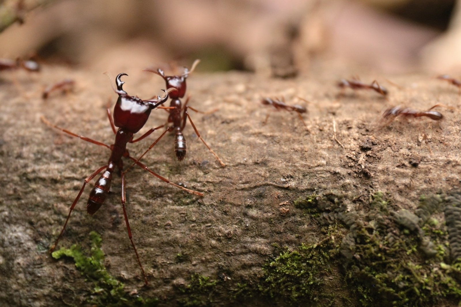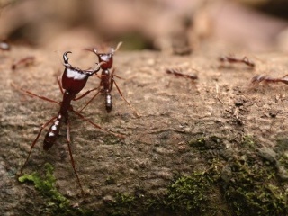 Jeden den se jdeme podívat k místům, kde vranule hnízdí. Jsme ale zelenáči a brzy se nám to vymstí. Ke korytu sice dojdeme, ale vranuli nevidíme. Rozhodneme se čekat. Jenže čekáme zrovna v místě, kudy štráduje dálnice mravenců. Velmi brzy poskakujeme téměř nahatí po pralese a sundáváme ze sebe tyto malé bestie. Naštěstí zdejší druhy nájezdních mravenců nemají žihadla a brání se tak jen kusadly. Bolí to také, ale na rozdíl od žihadel jen chvíli. Mravenci jsou vůbec nepříjemnou součástí nížinného pralesa. Kamkoli člověk jde, musí koukat pod nohy. Mravenci se prohání po pralese všemi možnými směry a často kříží naše pěšiny. Většinou má jejich nájezd podobu cca 30 cm široké řeky z rezavých tělíček, ale narážíme i na asi 4 metry širokou dálnici. Nezbývá nám nic jiného, než se prostě rozběhnout a snažit se je přeskákat co nejméně skoky. Nájezdy mravenců pokračují i v noci a běda tomu, kdo nezavře na noc svůj stan (ano stan, v nížině žádné ubytovací kapacity nejsou a v pralese tak prostě kempujeme a laborku máme vklíněnou mezi kořeny stromů). V noci mravence lákají hlavně neuklizené hrnce a zbytky jídla, především olej. Po tom palmovém (jiný se tu sehnat nedá, mimochodem ten červený nerafinovaný je chuťově naprosto vynikající) se mohou utlouct. Nicméně to pravé mravenčí peklo začíná až v období dešťů, kdy si mravenci vytvářejí zásoby na období sucha. To po celém dni v dešti člověk přijde na místo, kde rozbije tábor, staví kuchyň, stany, skládá vybavení na hromadu, suší co jde a když je vše hotovo, celý znavený padne večer vysílením do křesílka a pak to začne. Z každé díry v zemi vylezou mravenci a pokryjí celý kemp souvislou vrstvou kousajících červených hajzlů. Bojujeme s nimi nekompromisně – benzínem. Poléváme jím samotné mravence a vytváříme kolem kempu smrdící ohradu. Brzy celý kemp voní jako ropná havárie, ale je to jediný způsob, jak proti nim bojovat. Ještě, že tu nikdo nekouří. Další noci už jsou útoky mravenců lépe zvládnutelné a podaří se nám mravence vždy koncentrovat na nastraženou louži oleje. Zbytek kempu tak nechávají relativně bez povšimnutí.