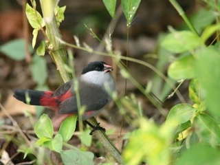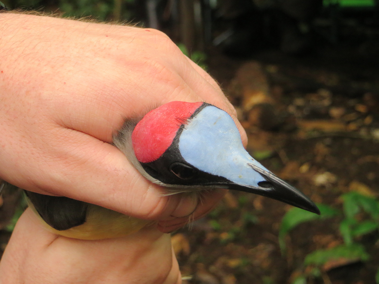 Nížinný les je pak místo, které se velmi špatně vnímá. Člověk je zvyklý uvažovat v zásadě v jedné „hladině“, ale tady se vše odehrává v několika vrstvách, od země po koruny stromů, které jsou navíc do velké míry světy samy pro sebe. Celou řadu korunových druhů ptáků člověk nespatří jinak, než jako vzdálené siluety kdesi nahoře v ostře kontrastním světle proti světlé obloze. Typickým zvířetem, které člověk takto vidí jsou místní druhy žluv. V nížině hlavně žluva lesní (Oriolus brachyrynchus) – taková méně barevná verze naší žluvy. I její nápěv, ač stejně plný, flétnový a melodický, je přeci jen o trochu jednoduší. Na tyhle korunové ptáky můžeme v sítích zapomenout, na ty se musí pověsit sítě do korun a ty my s sebou nemáme. Zblízka si však užíváme celou řadu druhů, které se pohybují i v podrostu. A i zde je na co koukat. Běžní jsou dva druhy drozdíků, drozdík hnědoprsý (Chamaetylas poliocephala) a hnědavý (Alethe castanea). Dospělci jsou každý jiný, ale určovat jejich mláďata je skutečná výzva. Naštěstí brzy objevujeme rozdíly v morfologii (a doma pak podle fotek i ve zbarvení). Skutečnou výzvu ale představuje místní plejáda bulbulů – často jednobarevně olivově šedozelených ptáků, které je velmi těžké od sebe odlišit. V tom nám nejsou moc platné ani určovací příručky. Na ty kroužkovatelské můžeme rovnou zapomenout, ale ani ty pro dalekokuky nejsou v mnohých případech příliš užitečné. Pro místní oblast existují v podstatě jen dvě a ani jedna není bezchybná. Někteří ptáci jsou pak vyloženě zpackaní, jiní jsou namalováni podle lépe známých poddruhů, které ovšem vypadají trochu jinak a žijí jinde. Obrázky a popisy mláďat často chybí zcela. Nevadí, alespoň bude moje galerie k nějakému užitku! Jeden z takových rodů, jehož zástupci jsou neuvěřitelně geograficky variabilní ve zbarvení jsou lejskovci. V pralese se setkáváme běžně s lejskovcem rudobřichým (Terpsiphone rufiventer) a je to jedno z nejsympatičtějších zvířat, které chytáme. Barevně se jedná o vyloženě fešáka. Oranžové břicho, šedá záda, křídla i dlouhý ocas, modročerná hlava a jasně modrý zobák a oční kroužek. A počkejte, když vám takový lejskovec vynadá a otevře zobák! Jeho vnitřek má totiž barvu zeleného zvýrazňovače! Podobně sympatické je každé setkání s místní obdobou červenky, s červenkou pralesní (Stiphrornis erythrothorax). Velice mě těší také setkání s medozvěstkou skvrnitou (Indicator maculatus), mou první medozvěstkou vůbec. Je to zajímavé i z praktického hlediska. Silná kůže medozsvěstky chrání před včelím bodnutím. Úplně stejně dobře funguje ale i na injekční jehly. Velkými hvězdami jsou hlavně pralesní druhy ledňáčků. Běžne odchytáváme hned dva prcky (a to dokonce vůbec ty nejmenší ledňáčky na světě) – ledňáčka nejmenšího (Ispidina lecontei) a trpasličího (I. picta). Velikostně jsou to takoví budníčci, ale s obrovskou hlavou a zobákem. A co dělají zde, na vulkánu, kde není voda v období sucha žádná (porézním podložím odteče všechna dolů na úpatí, kde pak vyvěrá)? Tito ledňáčci vůbec neloví ryby, ale hlavně hmyz. Není to vlastně nic zvláštního. Těsná ale přeci jen většina ledňáčků totiž vůbec na vodní biotopy vázaná není. Co se raritnosti týká, největší špek je asi odchyt vranule šedokrké (Picathartes oreas), které hnízdí v převisech nad vyschlými říčnímy koryty. Staví si uplácanou misku z bláta, kterou lepí zespodu na skálu. Samotná vranule je naprosto bizarní pták. Ač pěvec, vypadá jako vyhublá slepice. Její trojbarevná hlava je lysá a jakoby poprášená pudrem. Aby bizarností nebylo málo, na hlavě má tři ostny – peříčka bez postranních větví – která vypadají jako švy spojující jednotlivé barevné části hlavy k sobě.
