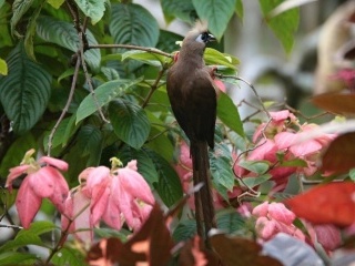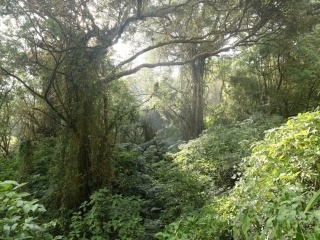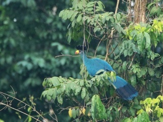 Ale zpět na kráter, užívám si samotu, ticho. To narušuje jen „kobylkový“ zpěv již zmíněných euplekťáků. Sem tam se ozve další z Evropy povědomý zpěv a cvakání, jako když o sebe tlučou dva kameny. To jen další pár bramborníčků varuje u hnízda. Tito hnízdí někde pod skalním převisem u vrcholu kráteru. Chvilku hnízdo hledám, ale nenacházím, škoda. Hnízdní biologie místních druhů je žalostně děravá. O afrických ptácích (mimo JAR) se téměř nic neví. Na vrcholu kráteru mě pak překvapuje druh, o kterém jsem ani neměl ponětí, že tu žije – linduška pastvinná (Anthus cinnamomeus). Dvakrát spatřuji pár na místě, kde rád sedávám, ale jejich přítomnost je naprosto náhodná. Na přehrávku hlasu, stejně tak jako většina tropických ptáků, vůbec nereagují, i tak mám alespoň při druhém setkání příležitost si je lépe prohlédnout. Je to vlastně úplně obyčejná linduška, ne nepodobná méně skvrnité lindušce luční. Jsem z ní ale nadšen. Hlavní důvod, proč ale chodím na vrchol kráteru je večerní seance turaků žlutozobých (Tauraco macrorhynchus). Vždy před západem slunce se tito překrásní zelenomodří ptáci začnou svolávat takovými hrdelními skřeky. A pak, když už jich je asi dost, spustí svůj chorál jako banda excitovaných fotbalových fanoušků. Ještě působivější jsou chorály jejich větších příbuzných, turaků velkých (Corythaeola cristata). I oni se svolávají hrdelními skřeky. Ale takovými naříkavými, melancholickými. Jejich zpěv je pak daleko se nesoucí hluboké jódlování. Jeden turako začne a další se přidá, pak další, na druhé straně údolí jiný, až se rozeřve celý les, který pak ještě dlouho zní ozvěnou jejich hlasů. Vskutku zážitek. Pak už jen zbývá seběhnout z kráteru dolů než se úplně setmí a nezlomit si u toho nohu a hurá na večeři. V šest je tma jak v pytli a tak v deset večer člověku připadá, že už to táhne do tří do rána a jde spát. Horský mlžný les je v noci na rozdíl od toho nížinného docela tichý a nepůsobí tak strašidelně. No a další den zas budíček v šest a takhle pořád dokolečka.