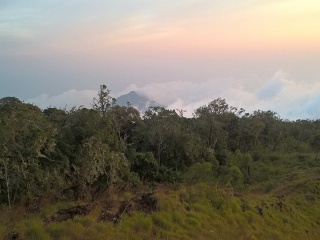 Každé odpoledne, když dochytáme, míří většina z nás na jeden starý sopouch, obrovský kráter, který se tyčí hnedka nad naším kempem. Jednak zde lze chytit (naprosto bídný, ale alespoň nějaký) signál, druhak je to krásné místo s úžasným výhledem. Chodím si tam trochu vyčistit hlavu, napsat domů a tak. Kráter je veliký, na jeho vrcholku se vždycky rozprostřeme a užíváme si chvilku samoty. Vzduch je v této výšce už přeci jen řidší a vyškrábat se nahoru dá docela práci, zvláště než si na nižší saturaci kyslíkem zvykneme. Ale ta odměna! Směrem k moři vidíme jen nekonečnou hradbu mraků, onen první prstenec, který začíná zhruba sto metrů pod námi a halí tak horský prales do věčné mlhy. Stromy jsou zde nižší, pokroucené a porostlé lišejníky. Les je to na pohled velmi estetický. Pohled na druhou stranu nabízí docela jinou podívanou. Nekonečná savana zvlněná sopečnými depozity přechází do zcela pusté krajiny nedávno vyhaslých postranních sopouchů. Jsou to navršené homole kamenů a popela. Celá ta krajina vypadá jako z jiného světa. Tohle krátké volno před brzkým západem slunce je vlastně také jediná chvíle, kdy si za celý den člověk může vzít dalekohled a zkusit nějaký ten poctivý birdwatching. Při stoupáni na kráter se chvilku dostávám do úrovně korun okolního pralesa, kde žijí zase jiné druhy ptáků, které na zem do podrostu v podstatě nelétají. Mezi takovými korunovými druhy najdeme i celou řadu snovačů, např. snovače hnědočapkového (Ploceus insignis) – sympatického celožlutého „vrabčáka“ s černými křídly a hnědou čapkou, který čile prohledává lišejník na holých větvích.