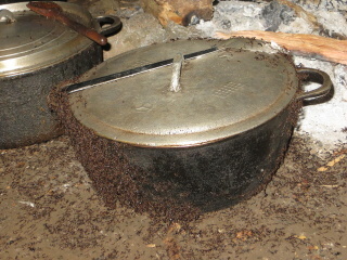 Shora/zleva: (1) Zmar a hnus období dešťů. (2) Jeden z mnoha zdejších druhů mravenců, který podniká nájezdy. V popředí vojáci střežící pochodující dělníky (foto: MM). (3) Každovečerní klasika v podobě hrnců obalených mravenci (foto: TK).