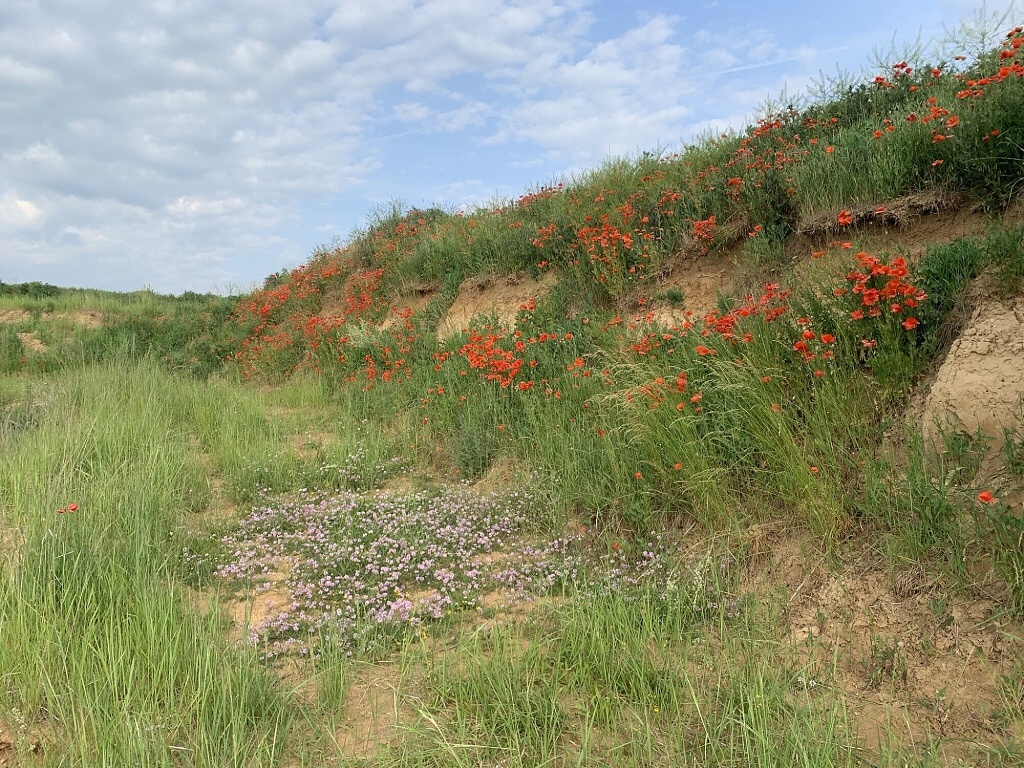 Další den vyrážíme znovu do Horek nad Jizerou, opět projíždíme makovým Balkánem, ale dnes už to tolik neprožívám, myšlenkami jsem jinde. Vítáme se s paní vrátnou a trochu napjatí se vydáváme tentokrát už mazácky přímo ke kolonii. Dnes jsme tu sami a… A tak trochu nám spadl kámen ze srdce. Chvíli přemýšlíme, kde rozložíme naše sezení, abychom nebyli úplně vypečení, ale žádné místo ve stínu tak, abychom neseděli příliš blízko nějaké noře, nenacházíme. I dnes tedy budeme vypečení. Až dnes si také můžeme pořádně prohlédnout, kam jsme se to dostali. Jsme opět v nějaké zřejmě bývalé pískovně, která je z jedné strany ohraničena poměrně nevzhlednou skládkou stavební suti. S tím ostře kontrastuje úžasně barevný koberec pionýrské vegetace, kterou pískovna pomalu zarůstá – žluté štírovníky, fialové čičorky, a hlavně záplava makové šarlatové. Nevypadá to úplně jako místo, které je staré 15 let. Nikde není ani jedna náletová dřevina, pouze pár keříků bezu po hraně této díry. Ale třeba se o toto místo někdo poctivě stará a všechny stromy vytrhává. Pár stromů pro vlhy by tu ale vyrůst nechat mohl, nemají zde příliš mnoho míst, kam sedat. Kromě tedy těch pár suchých ščagélů zapíchaných na fotogenická místa :)