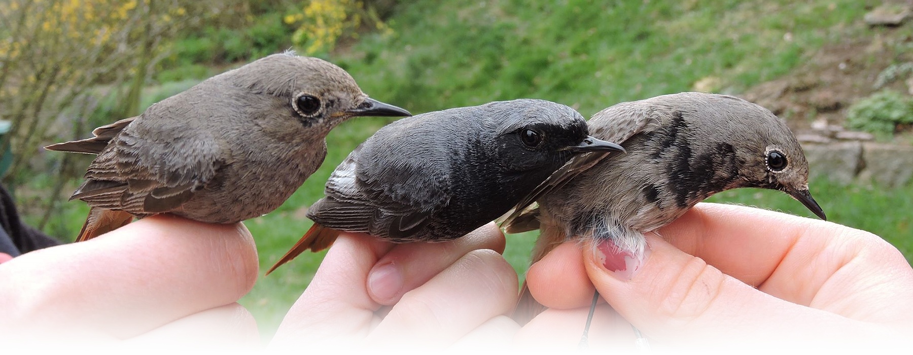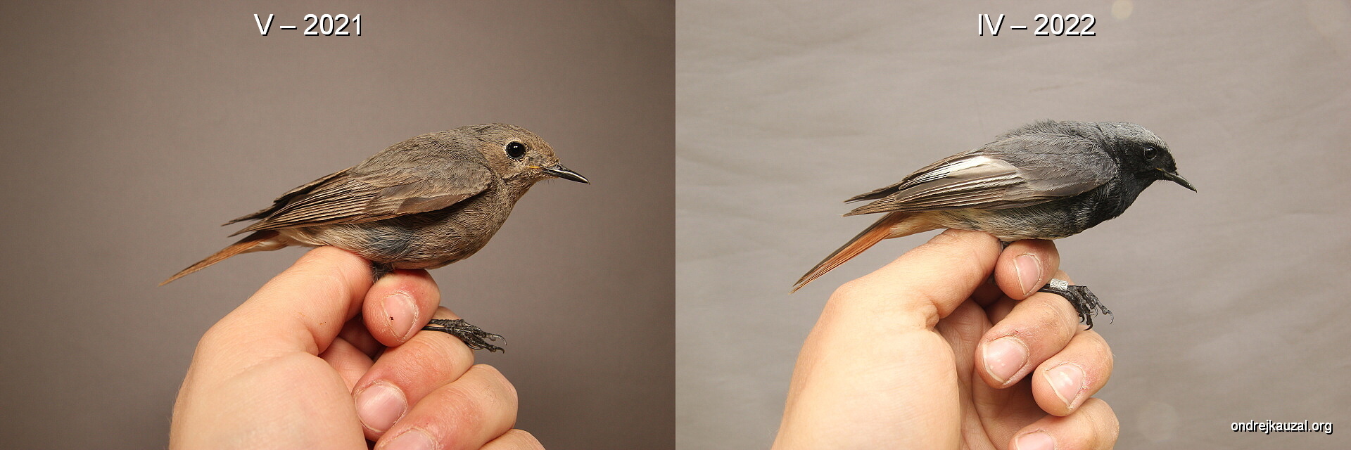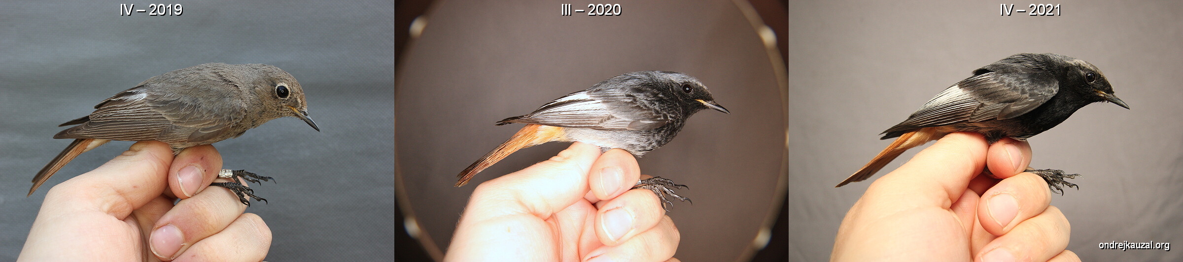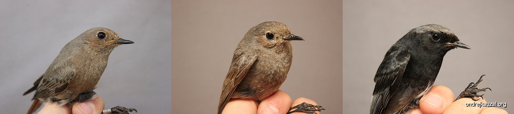Tzv. delayed plumage maturation u rehka domácího evropského (Phoenicurus ochruros gibraltarensis), vlevo: samice (CZEP21-169), uprostřed: samec v prvním roce života v šatu, který je k nerozeznání od samičího (CZEP21-139), vpravo: starší samec v plně vybarveném typickém šatu (CZEP21-064).