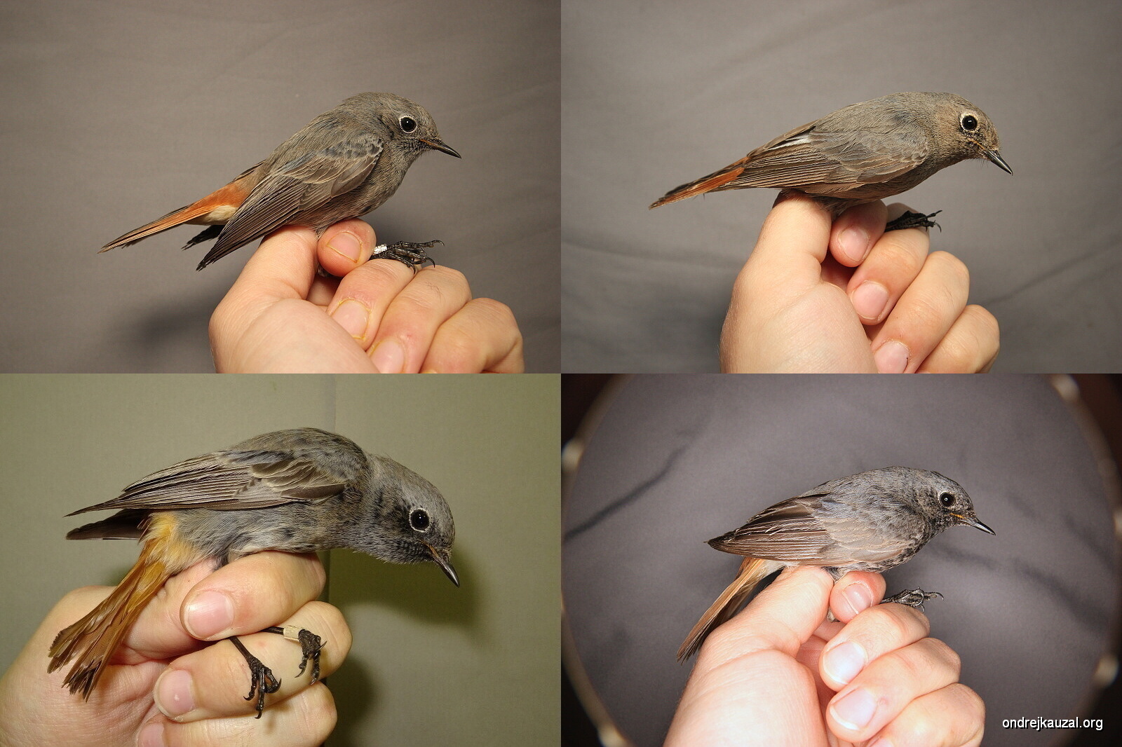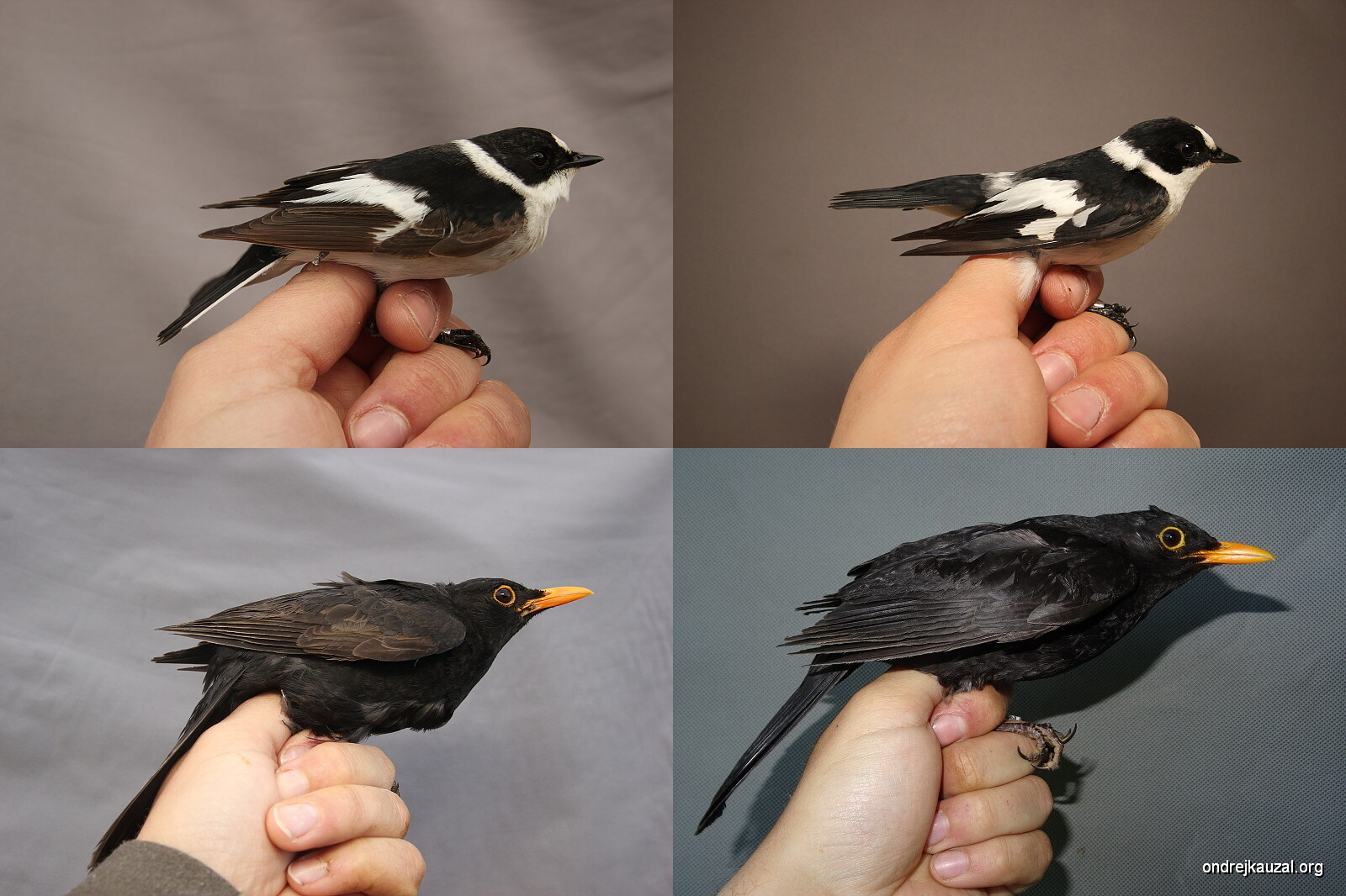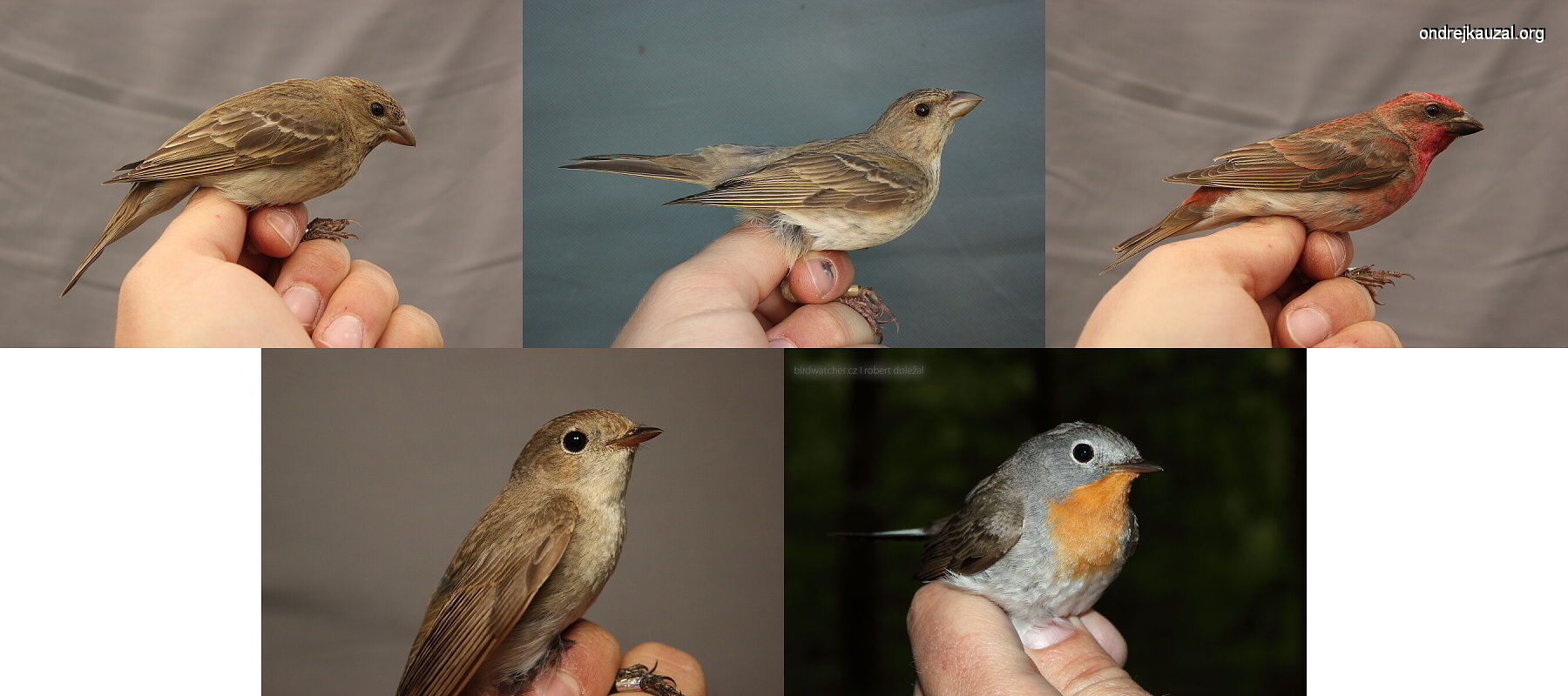 Ve spodní řadě jsou dva samci lejska malého (Ficedula parva). Vlevo jednoletý samec v šatu, který je k nerozeznání od samic (CZEP21-209); vpravo: starší samec, který ukazuje typickou oranžovou skrvnu na hrdle a prsou a šedou hlavu (fotografie použita s laskavým svolením Roberta Doležala, birdwatcher.cz).