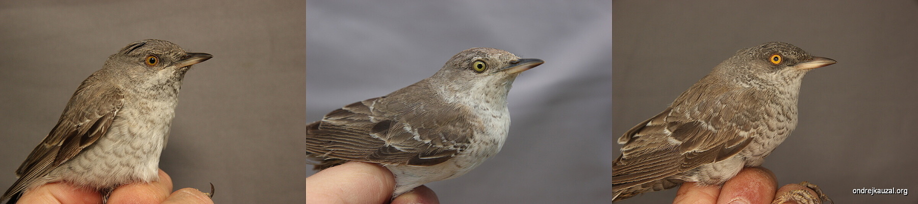Ukázka delayed plumage maturation u pěnice vlašské (Curruca nisora), vlevo: samice (CZEP20-208), uprostřed: samec v prvním roce života (CZEP21-232), vpravo: starší samec (CZEP20-110).