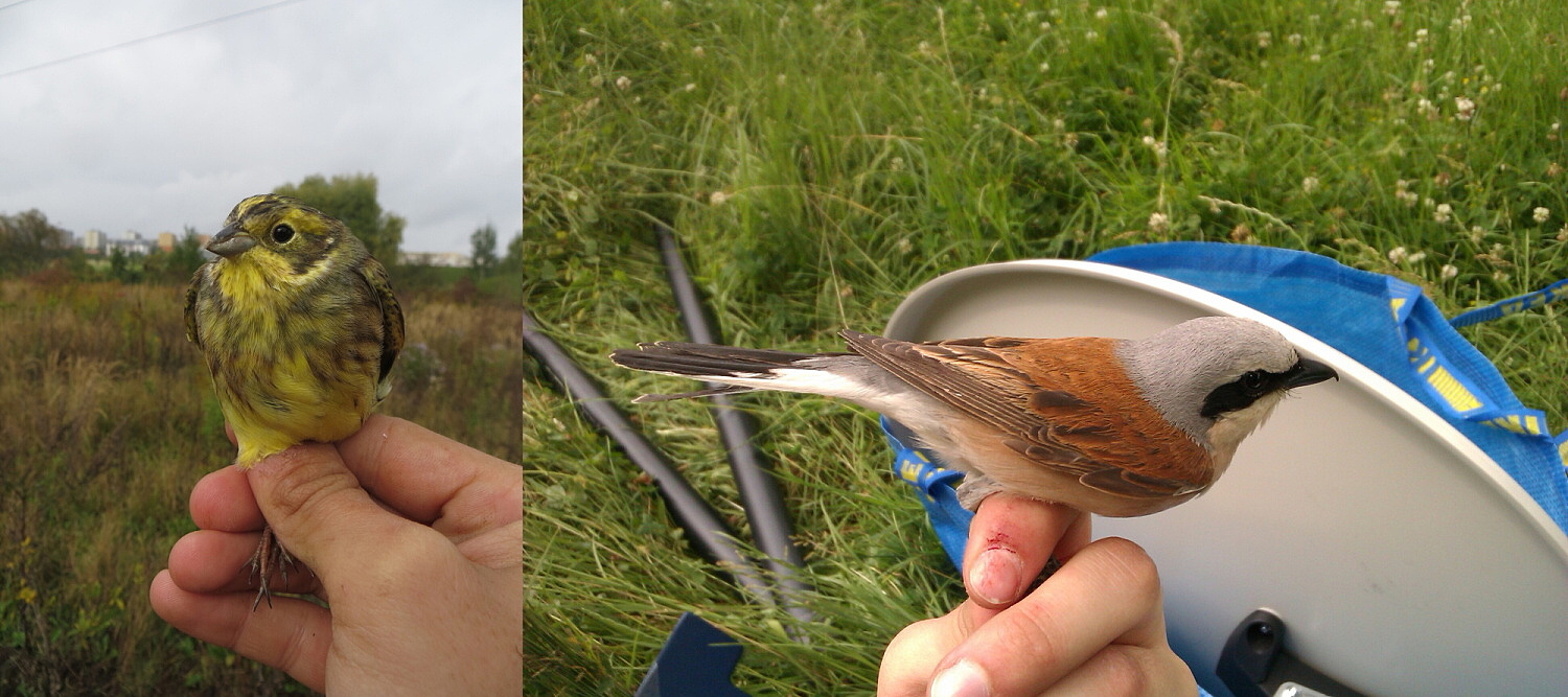 Vlevo: Strnadi obecní se na dlouhou dobu stali mou úhlavní nemesis na cestě za úspěšným dokončením magisterského studia. Vpravo: Vzpomínka na vůbec prvního ptáka, kterého jsem vymotával a kroužkoval úplně sám samotinký. Kdo někdy měl v ruce ťuhýka, dovede si představit, že to byla celkem výzva. V pozadí můžete vidět můj samodomo vyrobený parabolický mikrofon pro nahrávání hlasů strnadů. Fungovalo to překvapivě dobře (viz např. tato nahrávka strnada rákosního ).