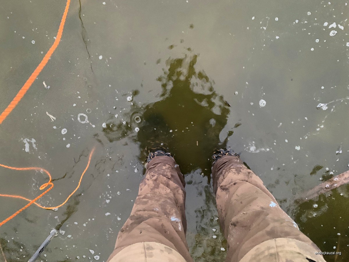 Tak jako tak, přijíždím chvíli po čtvrté, což už v tuhle roční dobu začíná být docela pozdě a tak není čas ztrácet čas. Z kufru beru tyčky, síť a přehrávače a chvátám k průseku. Chci si ukrátit cestu opět přes spuštěné dno, spěchám přes louku a krátkou cestičkou úzkou rákosinou a— a neomylně vbíhám do vody. Hergot, tak hladina poskočila víc, než se mi z auta zdálo. Rybník není plný, ale voda dostoupala až k rákosí. Chvilku stojím ve vodě a zpracovávám tuhletu informaci. Přemýšlím, jestli se vrátit nebo to prostě projdu mělkou vodou. Během pár vteřin mám jasno. Moje fajnové, ale hrubě podudržované pohory začínájí propouštět vodu a tak nemá smysl vybíhat ven a zdržovat se obcházením malého lesíka cestou k průseku. Dneska holt půjdu vodou. Pohory jakž tak drží, snažím se jít mělkou vodou, ale v jednu chvíli neodhadnu hloubku a zahučím do vody do půli lýtek. Voda studí a hrne se do bot i shora, čo už! Za chvíli jsem u průseků. Ten je téměř celý suchý. Kdybych šel rovnou po břehu, rozhodně jsem si dneska mohl tohle máčení nožiček ušetřit. Ten poslední metřík nad vodou bych prostě oželel. Horší je, že neslyším žádné strnady, z rákosí se ozývají pouze hordy úpolínů, kteří už evidentně mají v plánu jít spát.