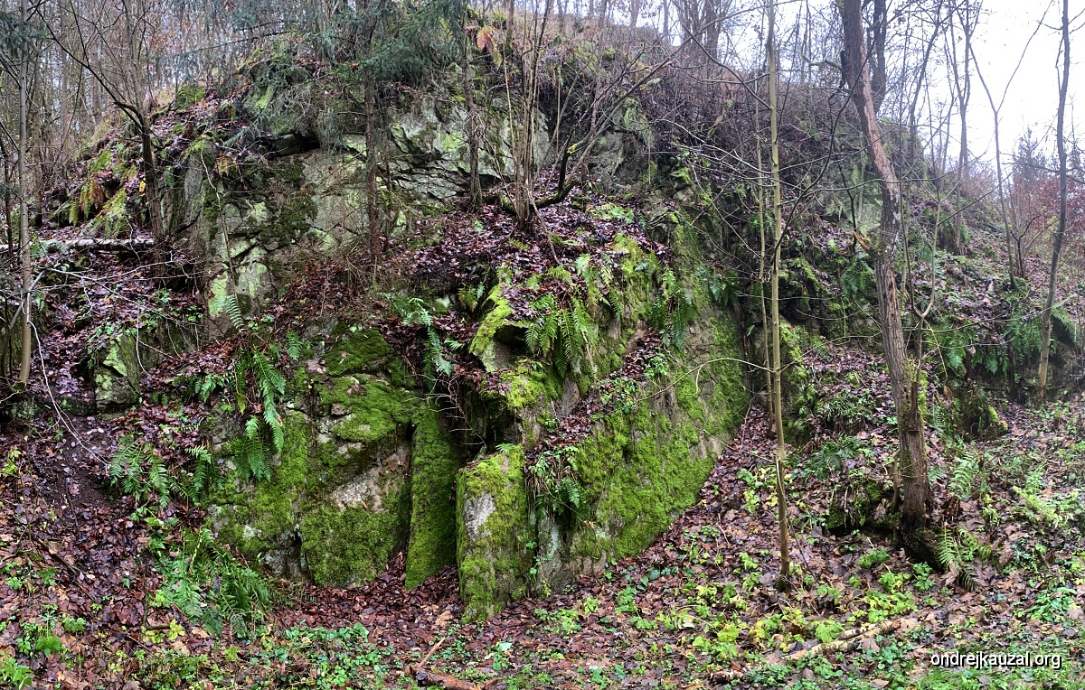 Pokračuji proti proudu potoka pořád dál, mírně do kopce. Nad hlavou mi teď občas přeletí sem tam nějaký pěnkavoid, ale jinak je docela klid. Brzy míjím poslední zdejší domeček a vše utichá, ptáci jakoby zmizeli. Dívám se alespoň po okolí. Překvapivě i zdejší docela chladné a dosti zařízlé údolí dohnala smrková kalamita posledních let a i zde padly smrky za oběť suchu a následně lýkožroutovi. Z okolních svahů se ozývá řev motorových pil a kolem cesty se válí hromady dřeva. Z kolmých řezů prýští smůla a krásně voní. Les ale úplně nezmizel, naštěstí zde roste řada buků a habrů, jen občas tu a tam prořídl. Alespoň se mýtinami otevírají výhledy na obrovská skaliska porostlá mechy a kapradím.
