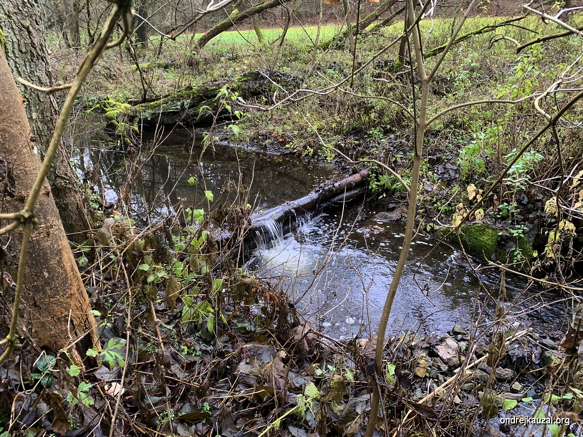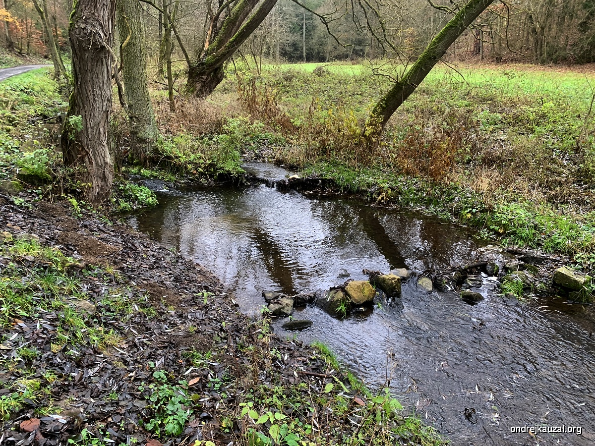 I samotný potůček mi poskytuje dostatek potěšení. Někdo tady nevím proč, asi aby zpomalil proud a zvýšil zasakování, asi, postavil co pár metrů malý jez, každý trochu jiný, některé ze dřeva, některé z kamení, některé časem povolily a jsou z nich spíše takové malé peřeje, ale všechny jsou vlastně velmi estetické a navíc všechny zurčí a zvuk padající vody je uklidňující a krásně zapadá do toho veškerého ticha. Místy se v korytě válí docela pěkná hromada balvanů a tak všechno fotím jako japonský turista.