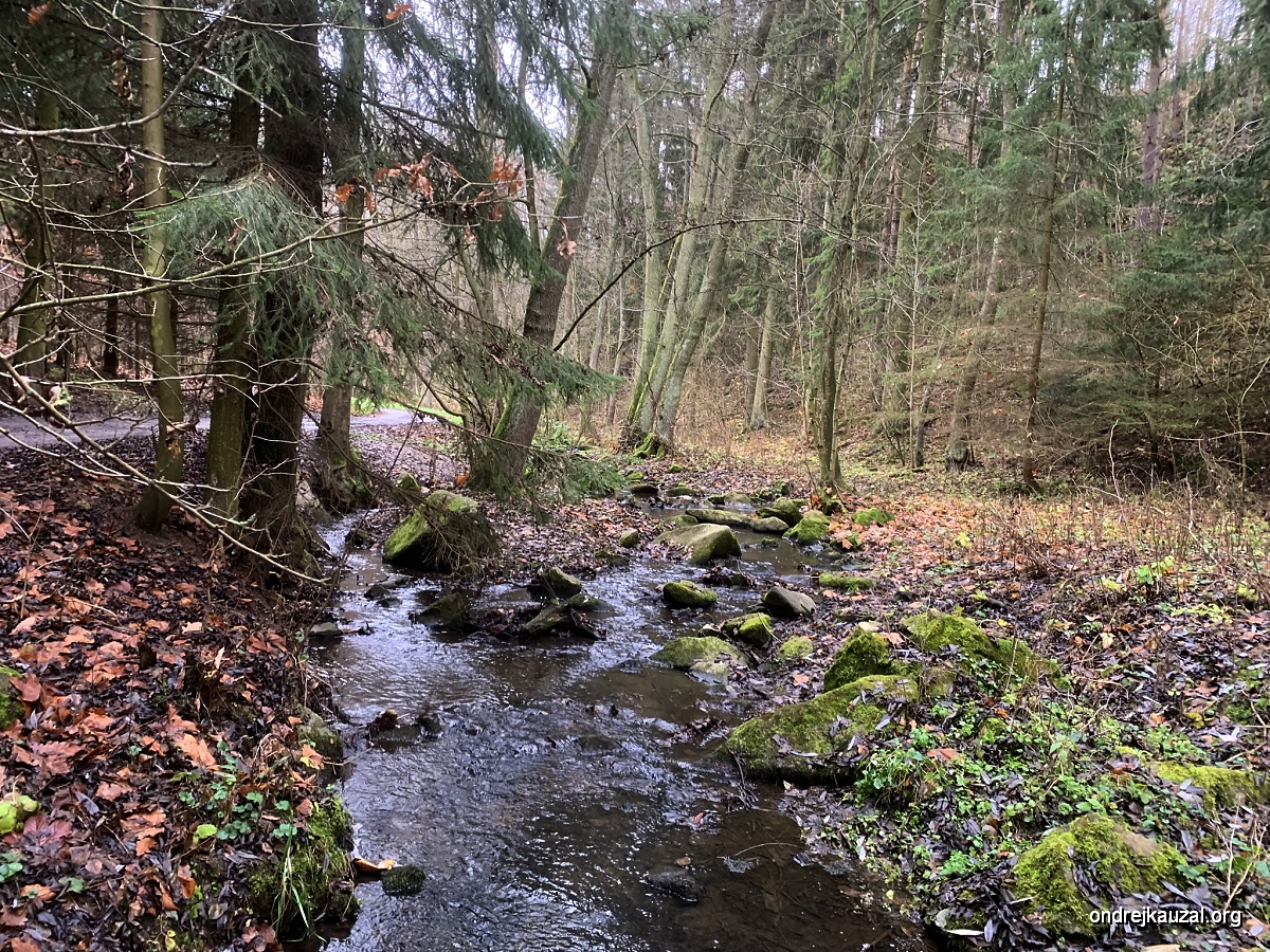 Fotky samozřejmě stojí úplně za hovno, protože si můj mobil s tou všudypřítomnou šedou, hnědou a zelenou nedokáže úplně dokonale poradit. Koukám se na potůček a přemýšlím, zdali by tu mohl žít skorec. Potok je sice docela malý, ale krásně zurčí. Skorce jsem tu ale nikdy neviděl. Přemítám, zda jde o nedostatek hnízdních příležitostí nebo je potok, poté co proteče mezi velkými širými lány příliš eutrofní. Na Jihlavě, která často vypadá a smrdí spíše jako řeka někde v Indii a kam potok vtéká, skorci jsou, ale tady ne. Určitě by to tu měli o dost hezčí. Z rozjímání mě náhle vytrhuje pracovní telefonát, ale v zařízlém údolí je signálu poskrovnu, tak je to docela rychle vyřešeno.