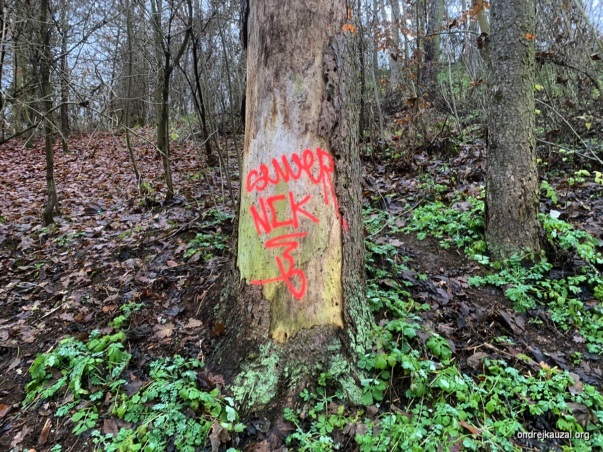Místní omladině zřejmě došly kolmé plochy k posprejování v celé Třebíči, tak vezme zavděk i odkorněným kmenem.