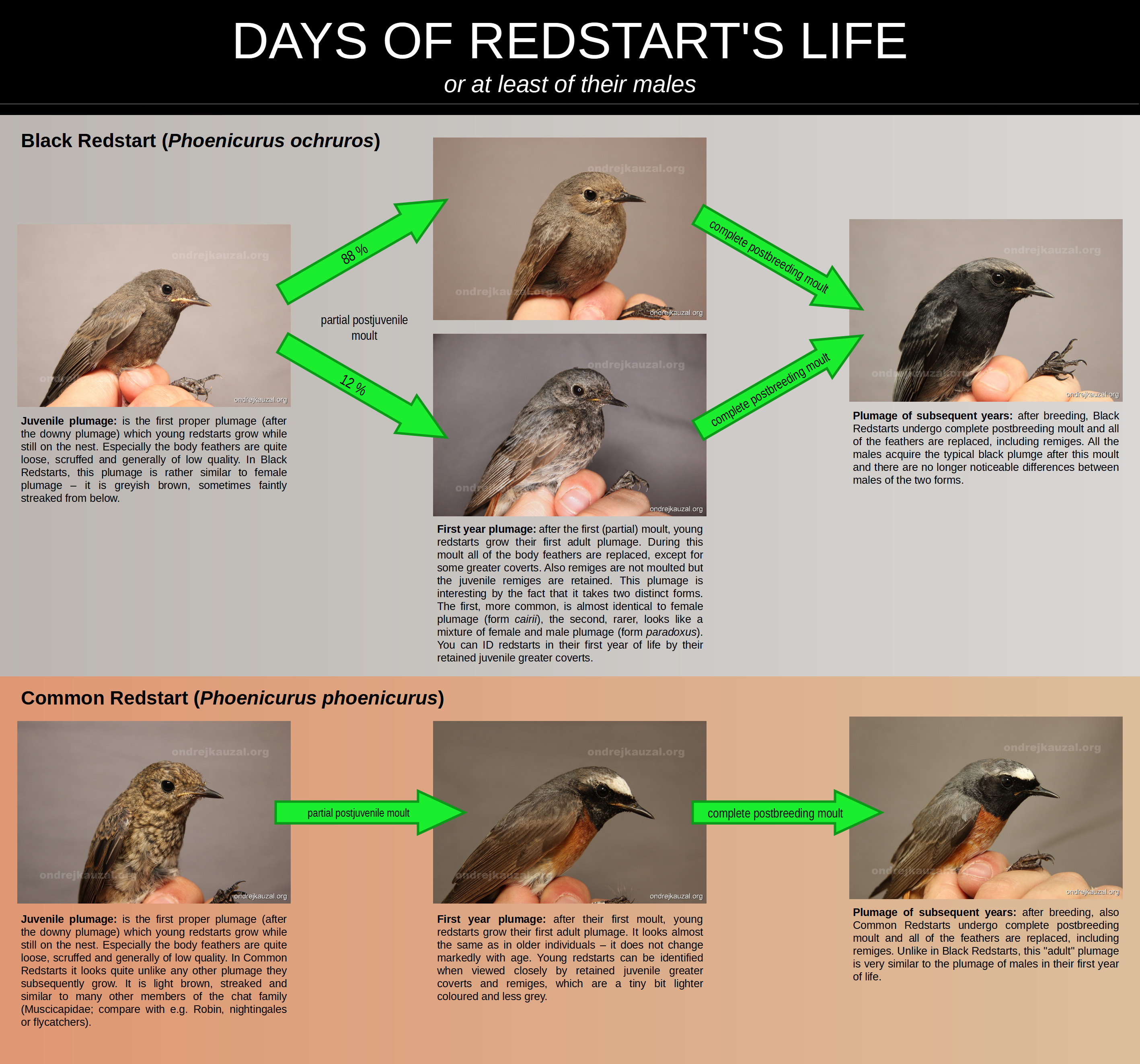 It is said that one picture is worth a thousand words, and with the next picture I tried to summarize how the Black Redstart plumage changes over time. As an example of a species that does not show DPM, I chose its relative Common Redstart.