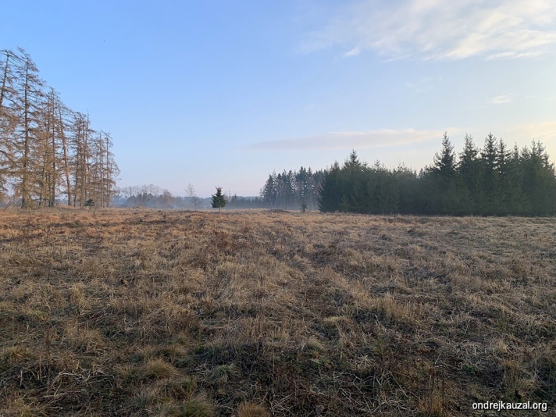 A habitat of Woodlark. It likes to breed at the forest edges, steppes and pastures with mature trees or orchards, and, like here, at places where the mature forest has been chopped down recently.