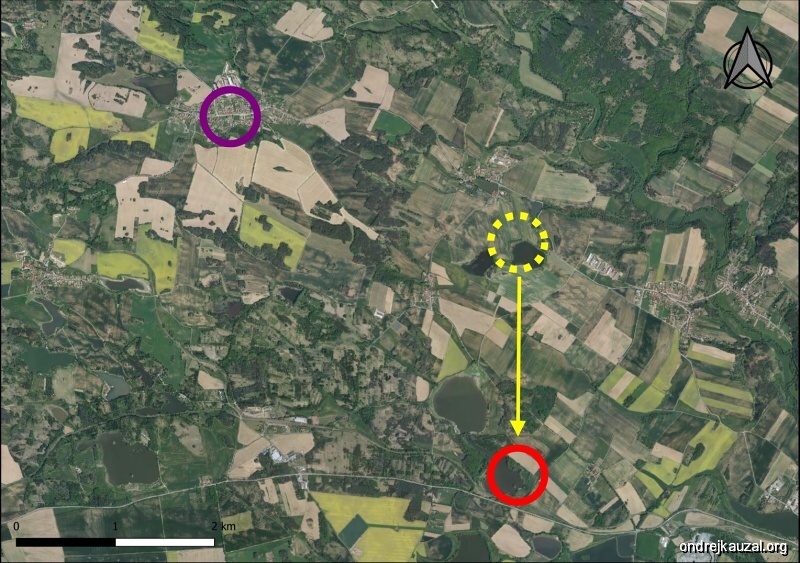 Red circle is the place I trap wagtails on their autumn migration, violet is the approx. location of the recovery from yesterday, roughly 5 km northwest but still in the general area. Yellow dotted line is the place of ringin of the other wagtail I mentioned in the text, which was recovered two weeks later on my "main" spot where I trap autumn wagtails.