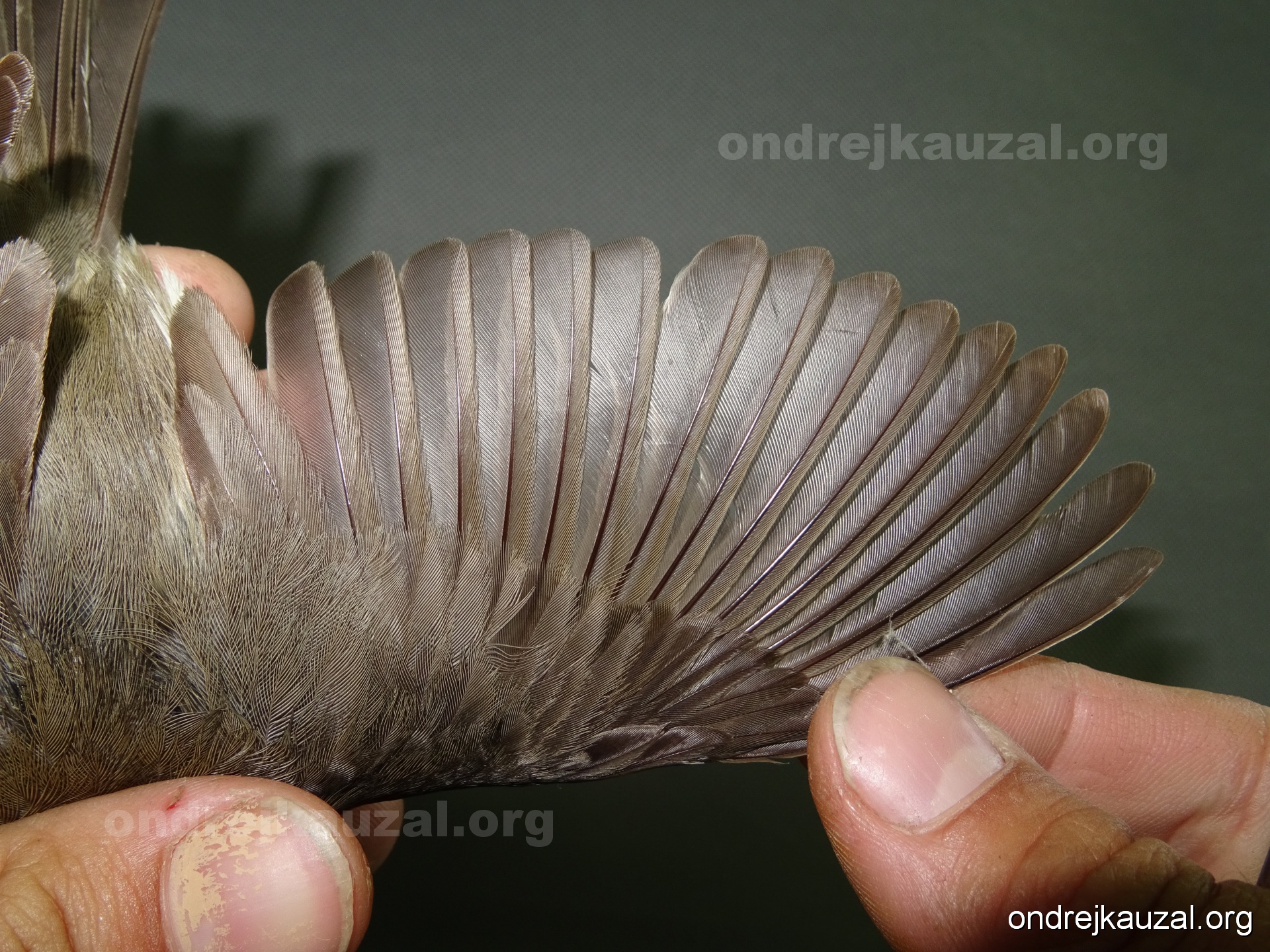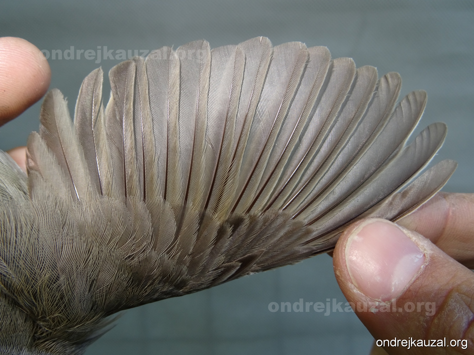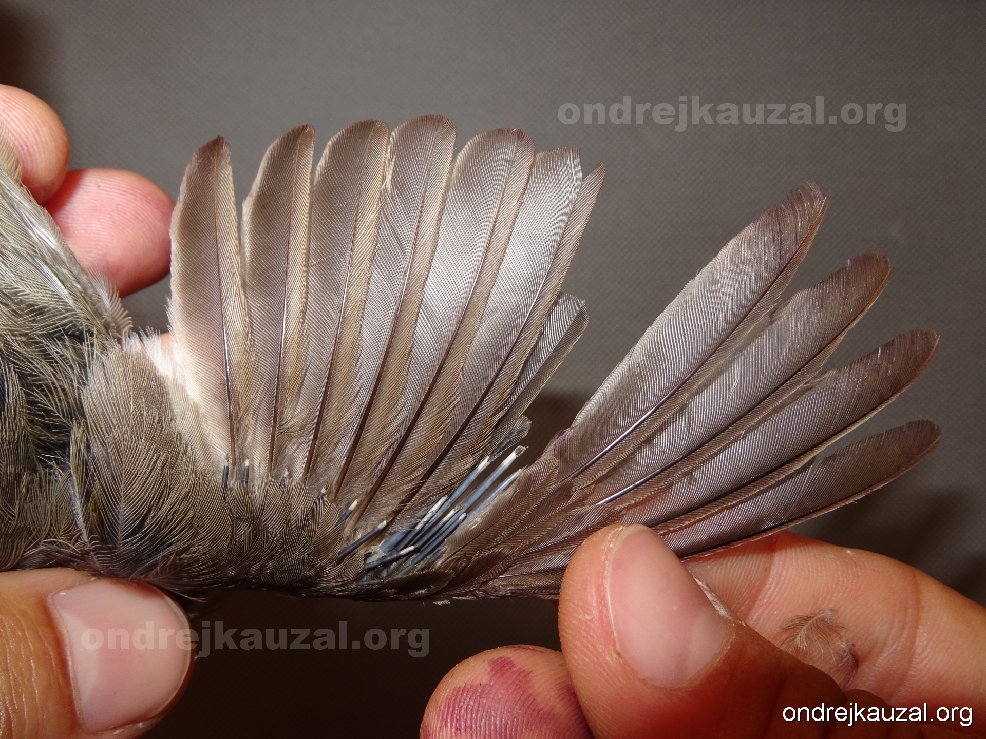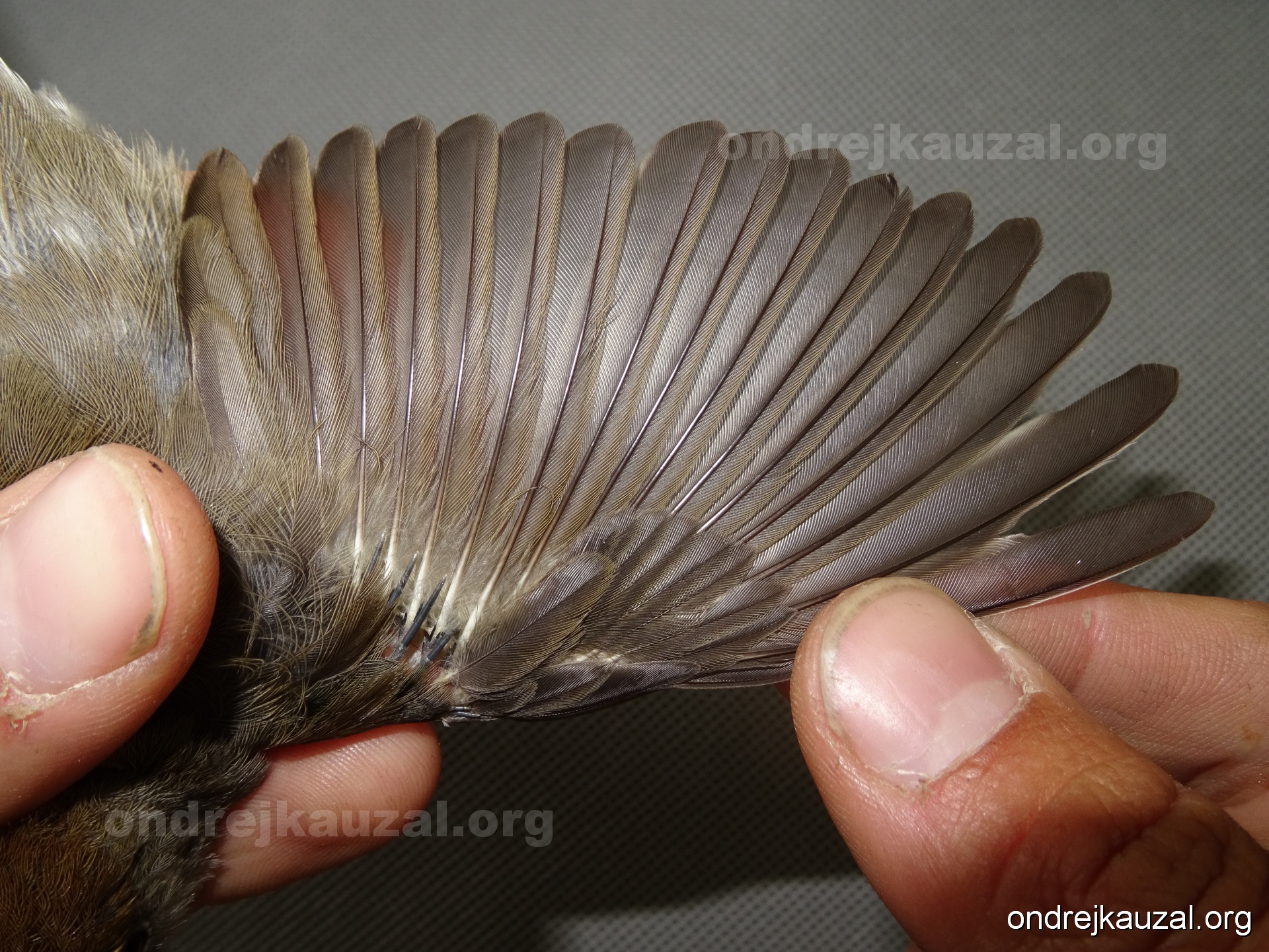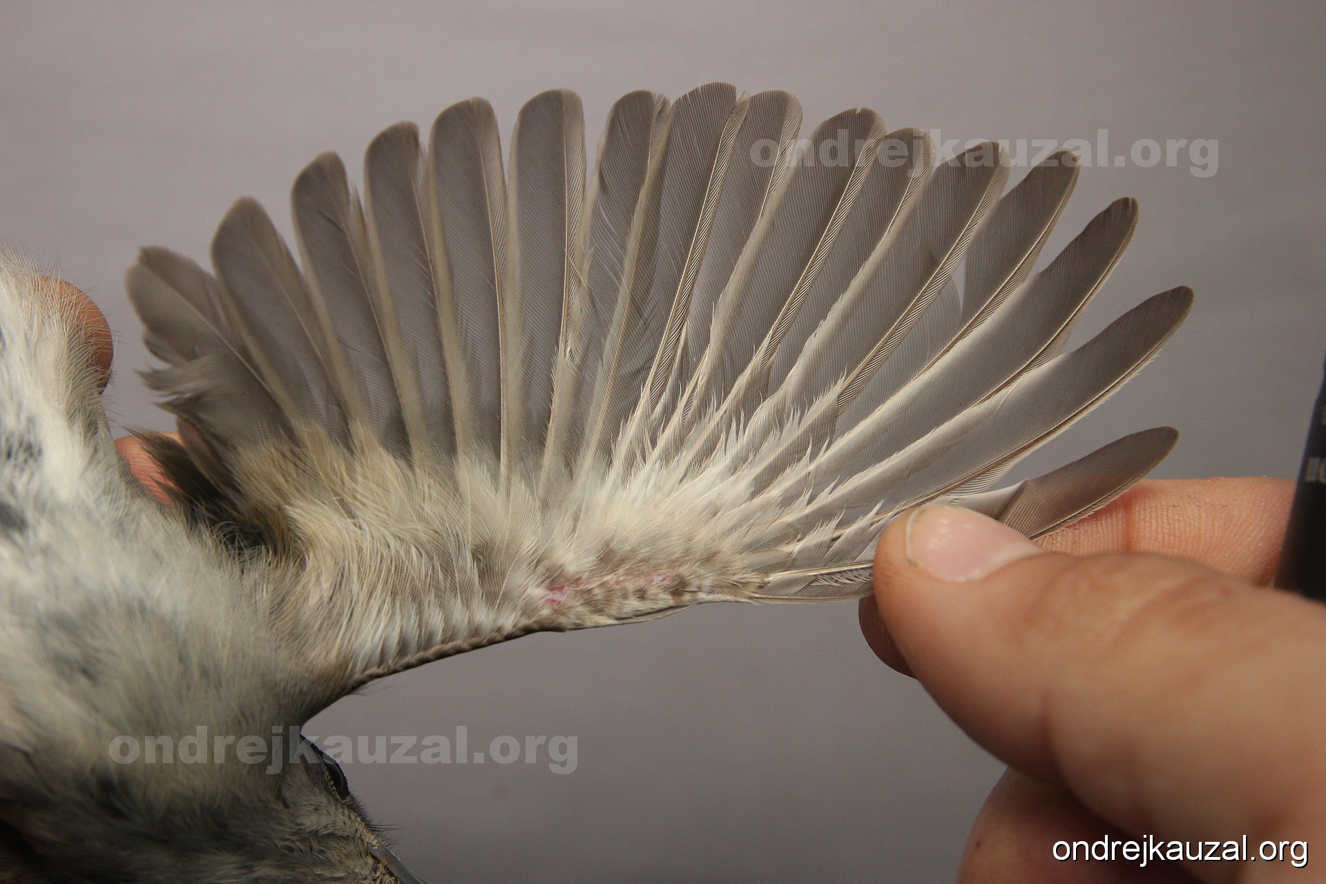 A bird showing nice fault bar across its remiges. While definitely not a good thing for the bird itself, such phenonema can aid in ageing. The uniform position of this bar from the wing indicates the wing feathers grew at the same time, i.e. on nest suggesting this bird is a young individual.