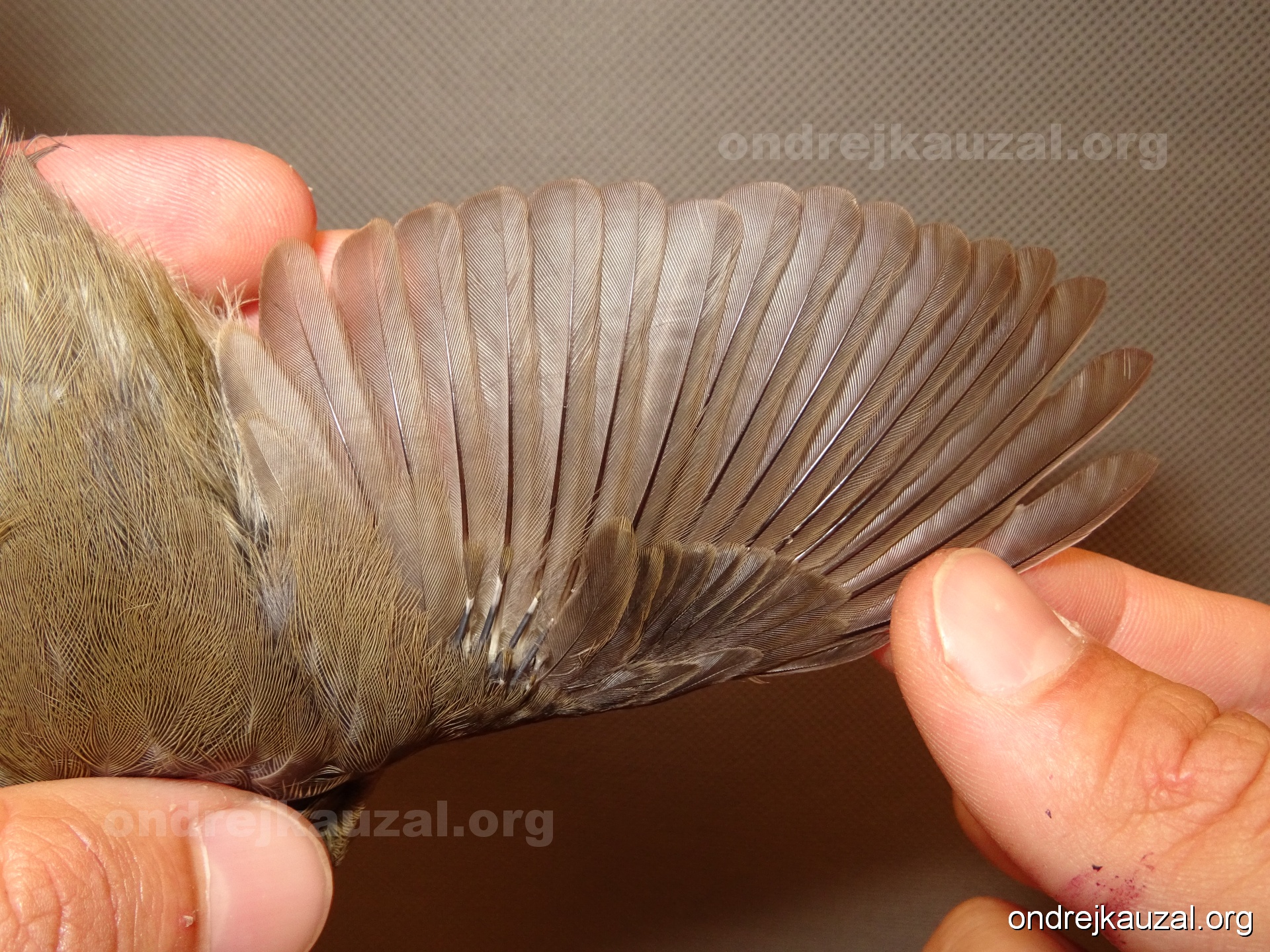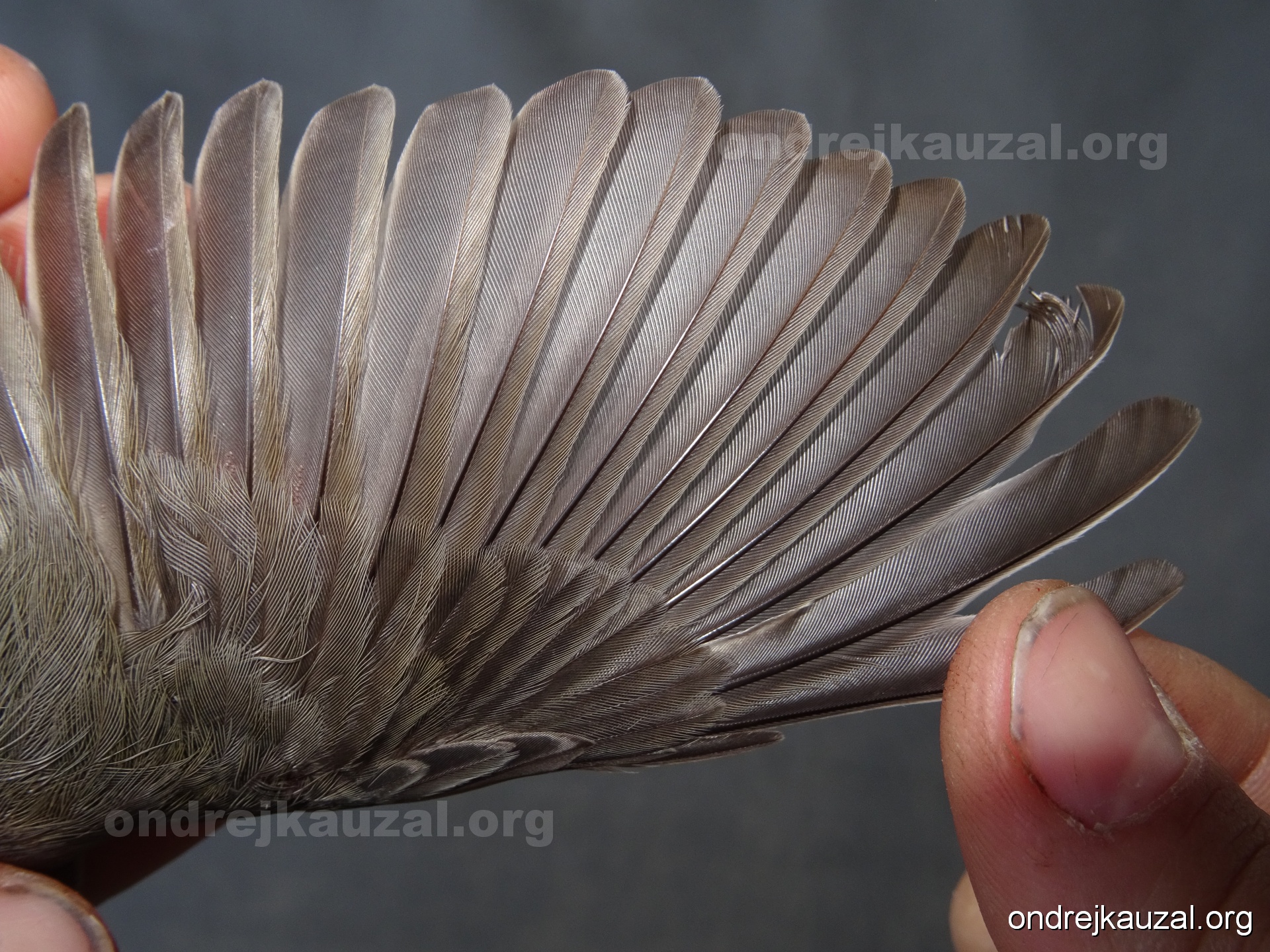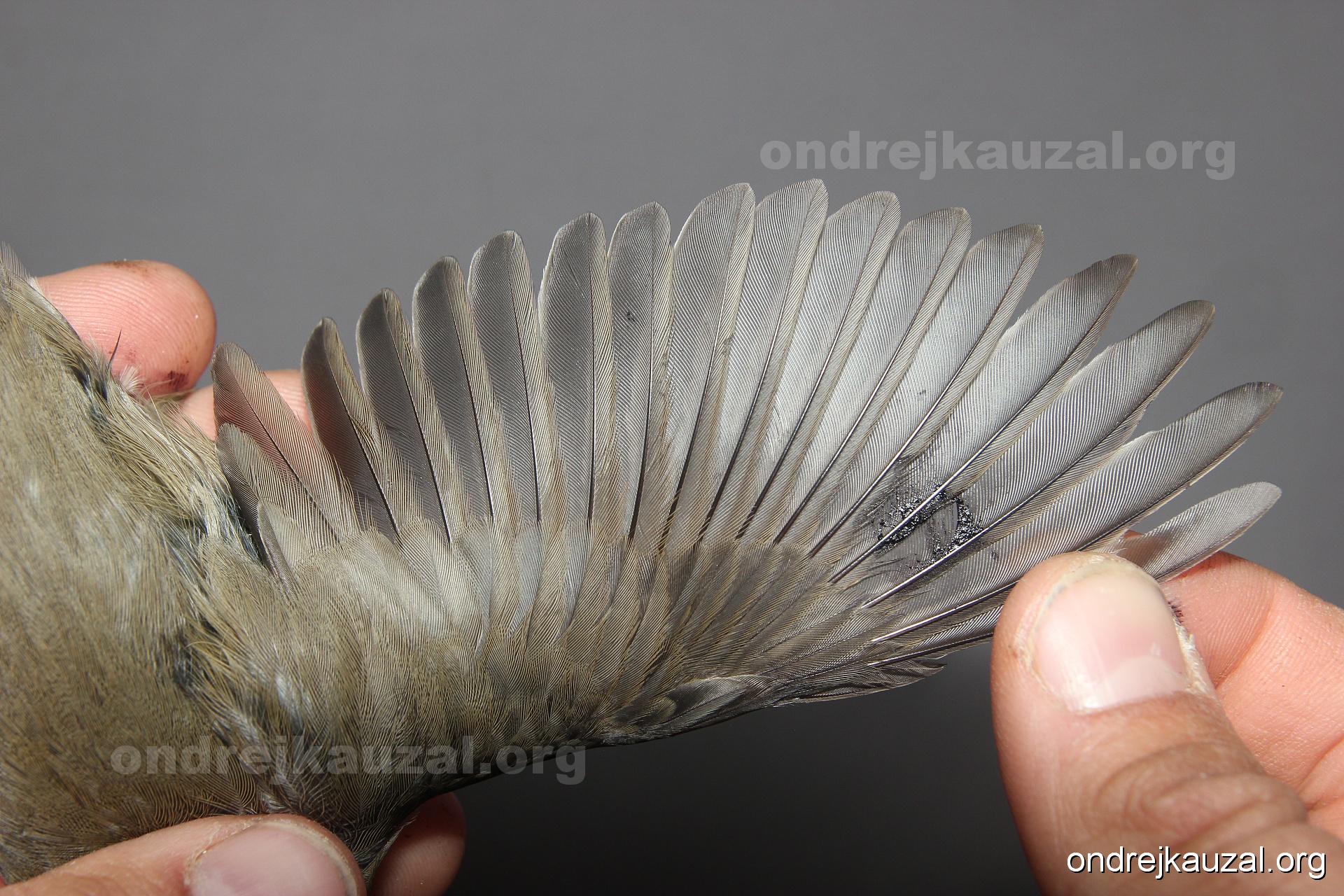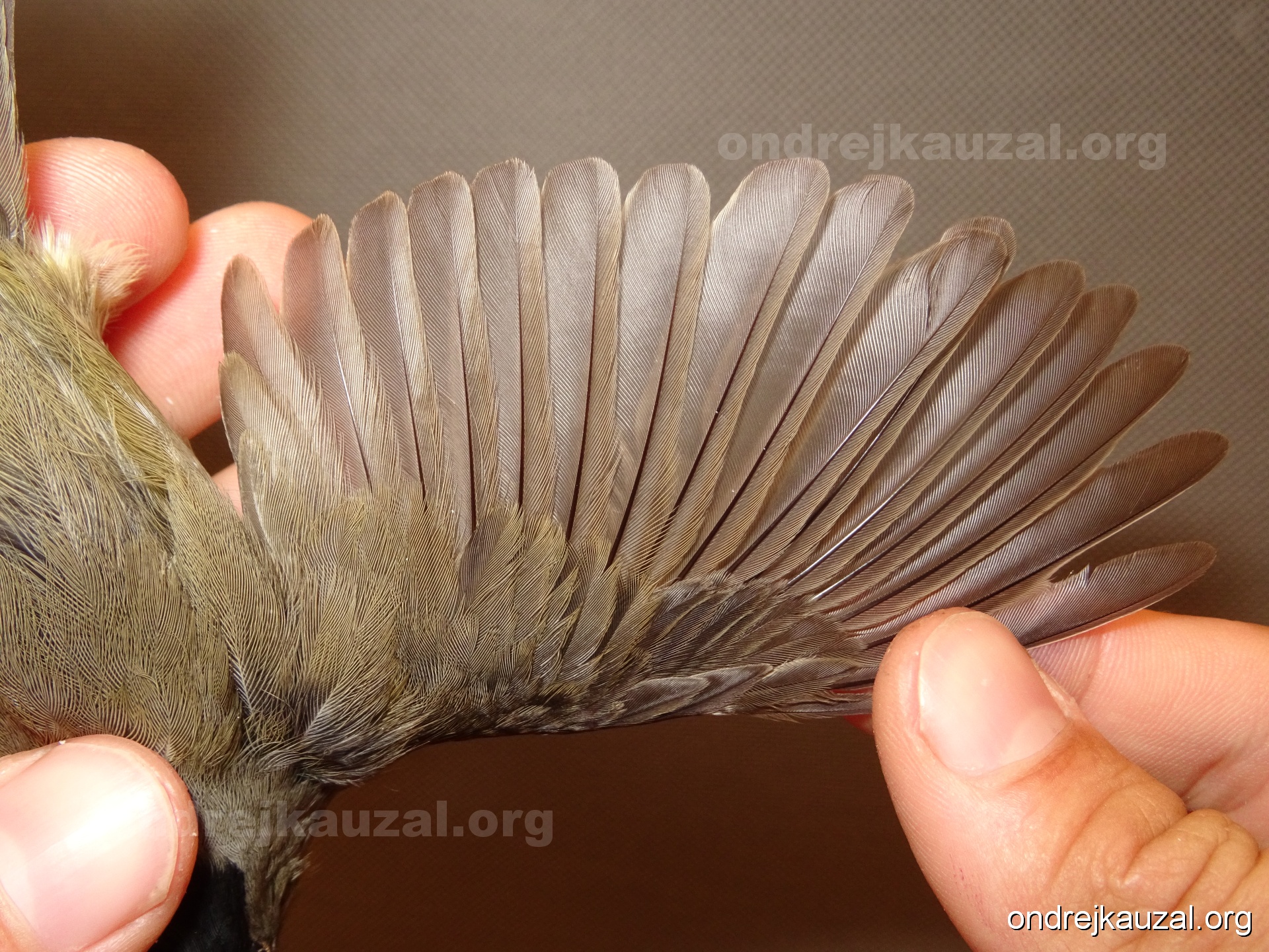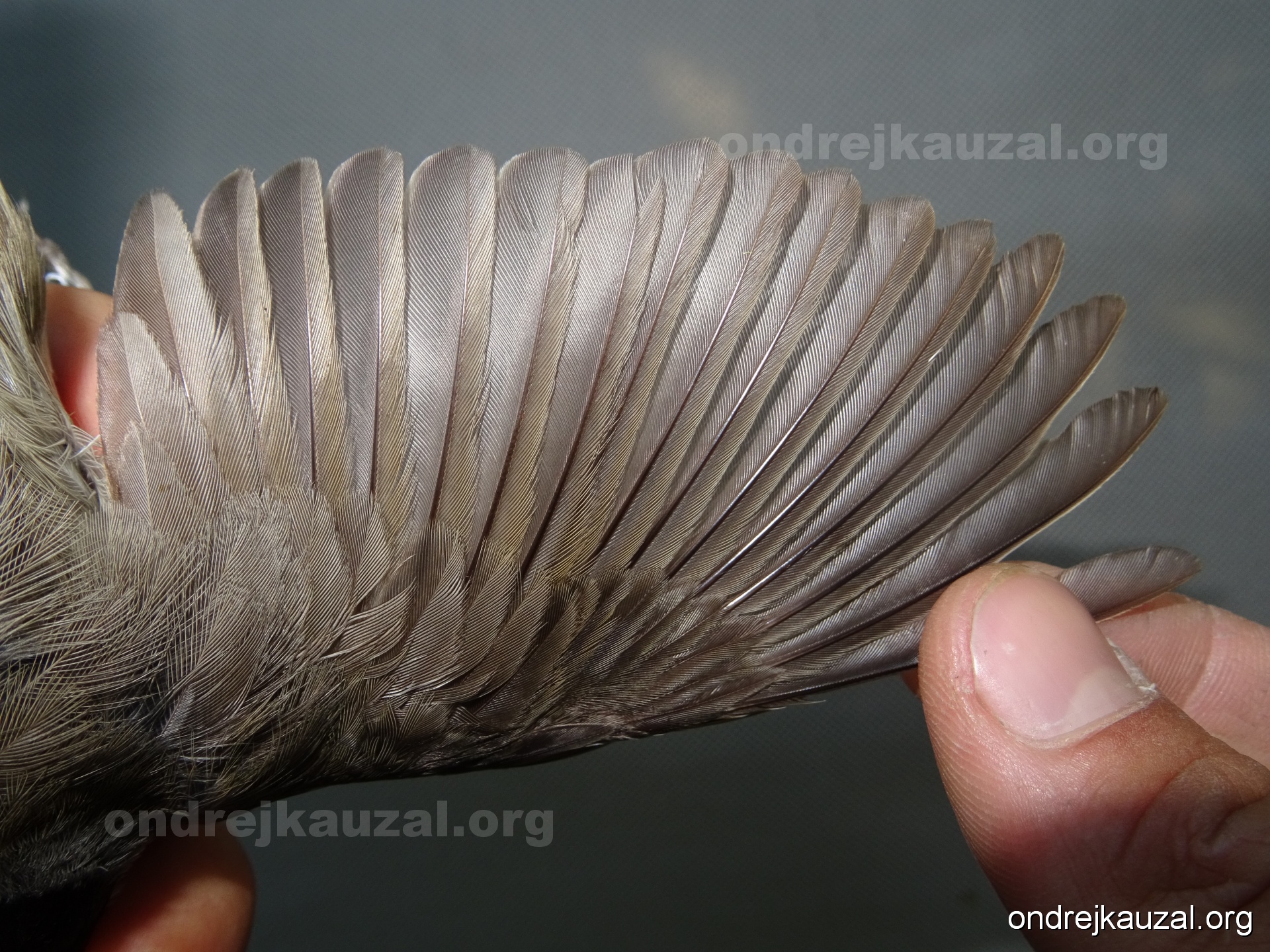 A bird showing nice fault bar across its remiges. While definitely not a good thing for the bird itself, such phenonema can aid in ageing. The uniform position of this bar from the wing indicates the wing feathers grew at the same time, i.e. on nest suggesting this bird is a young individual.