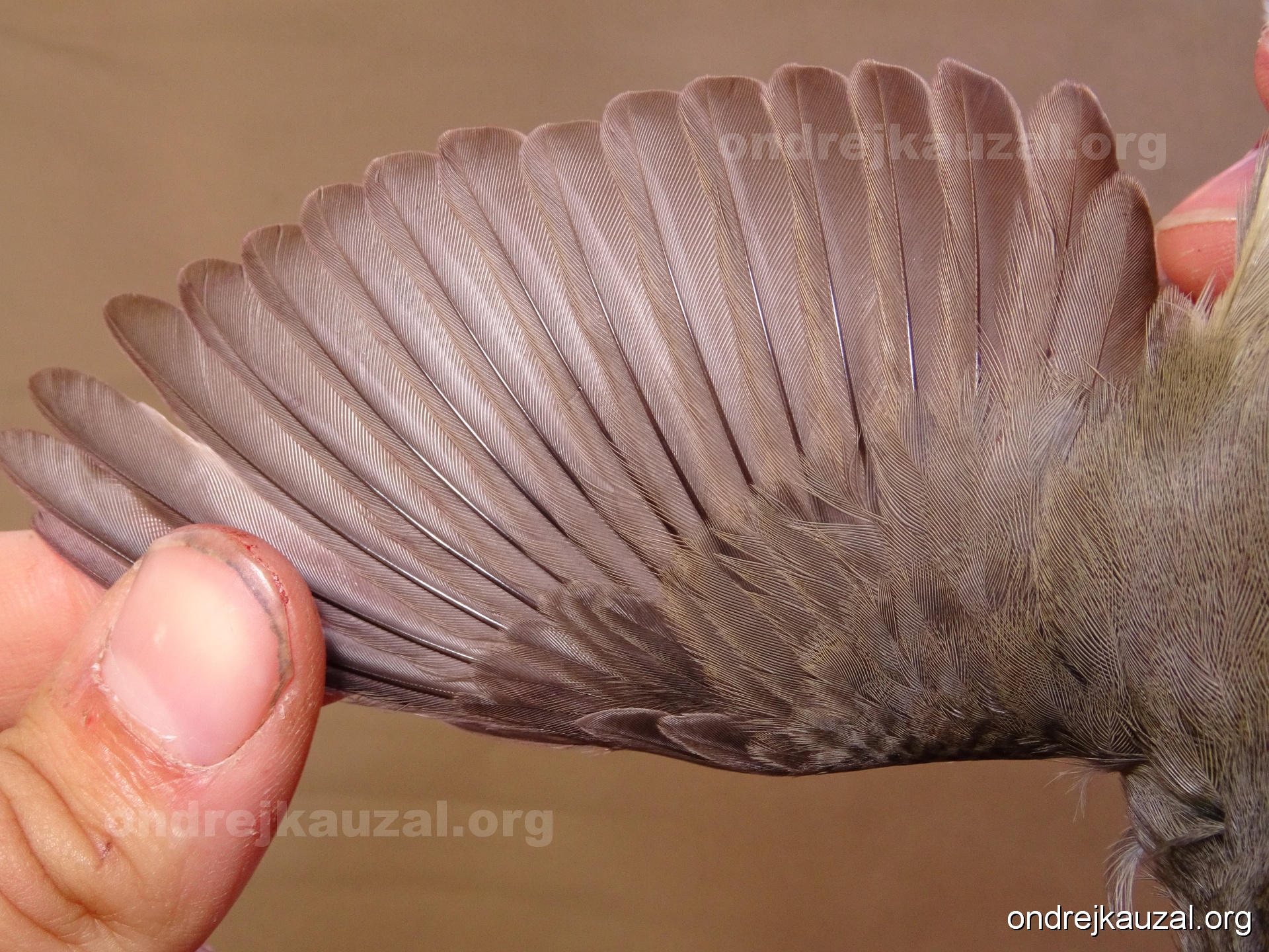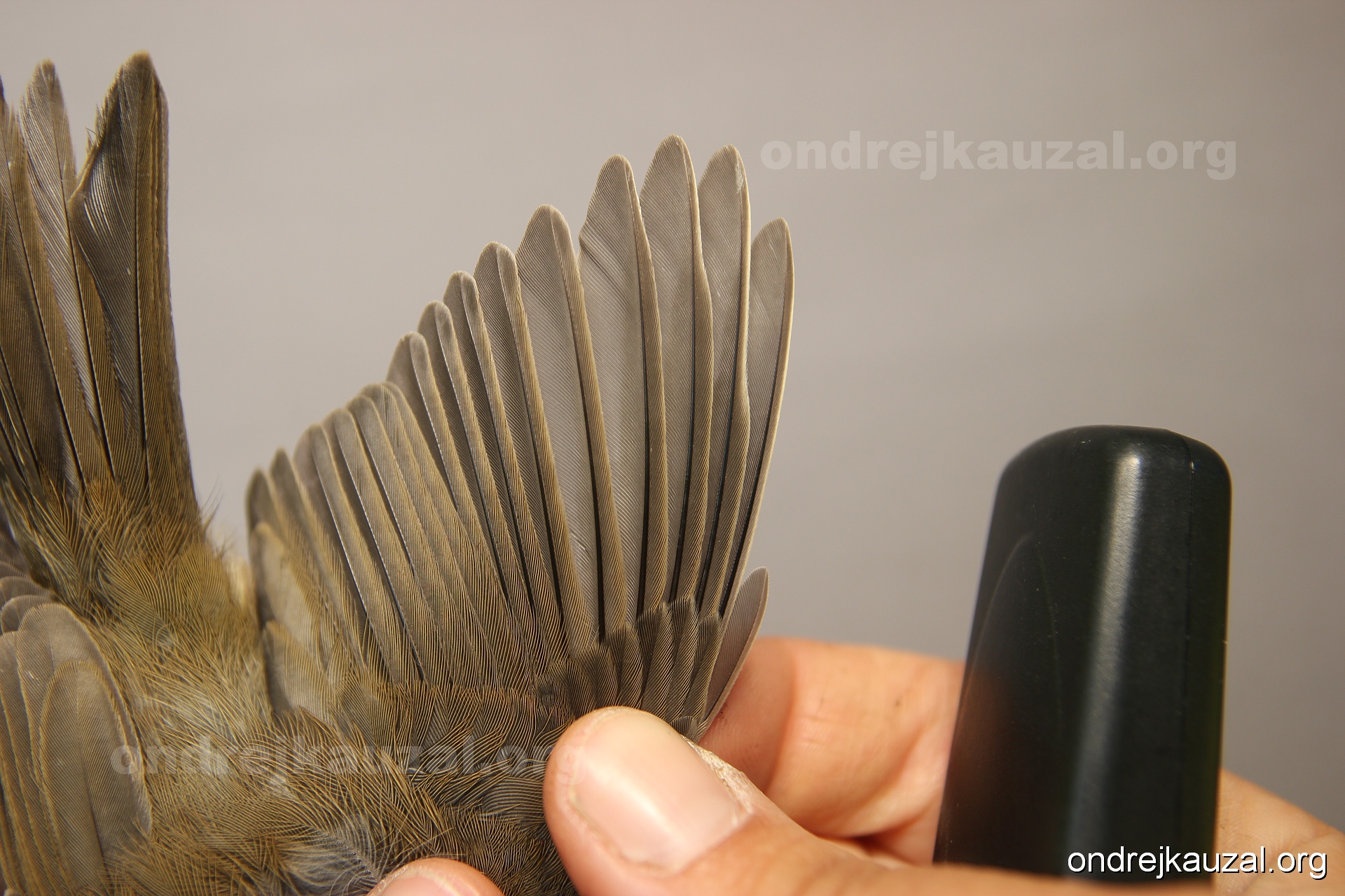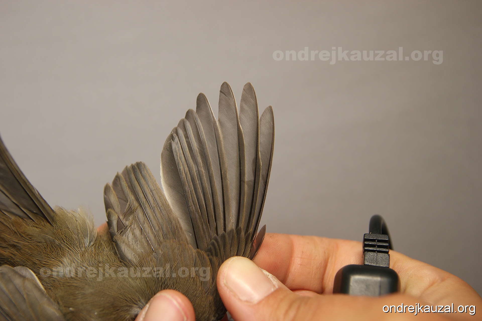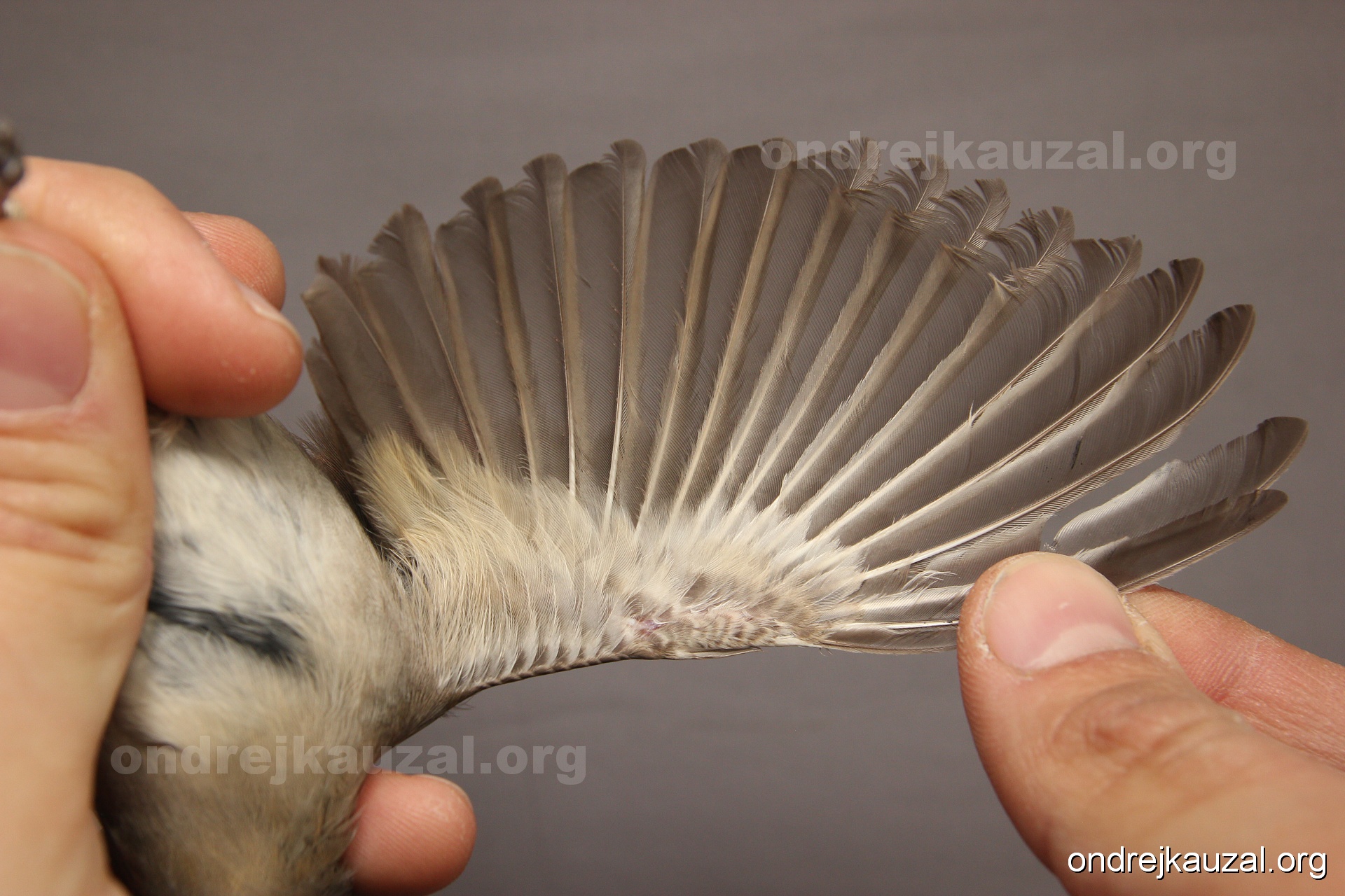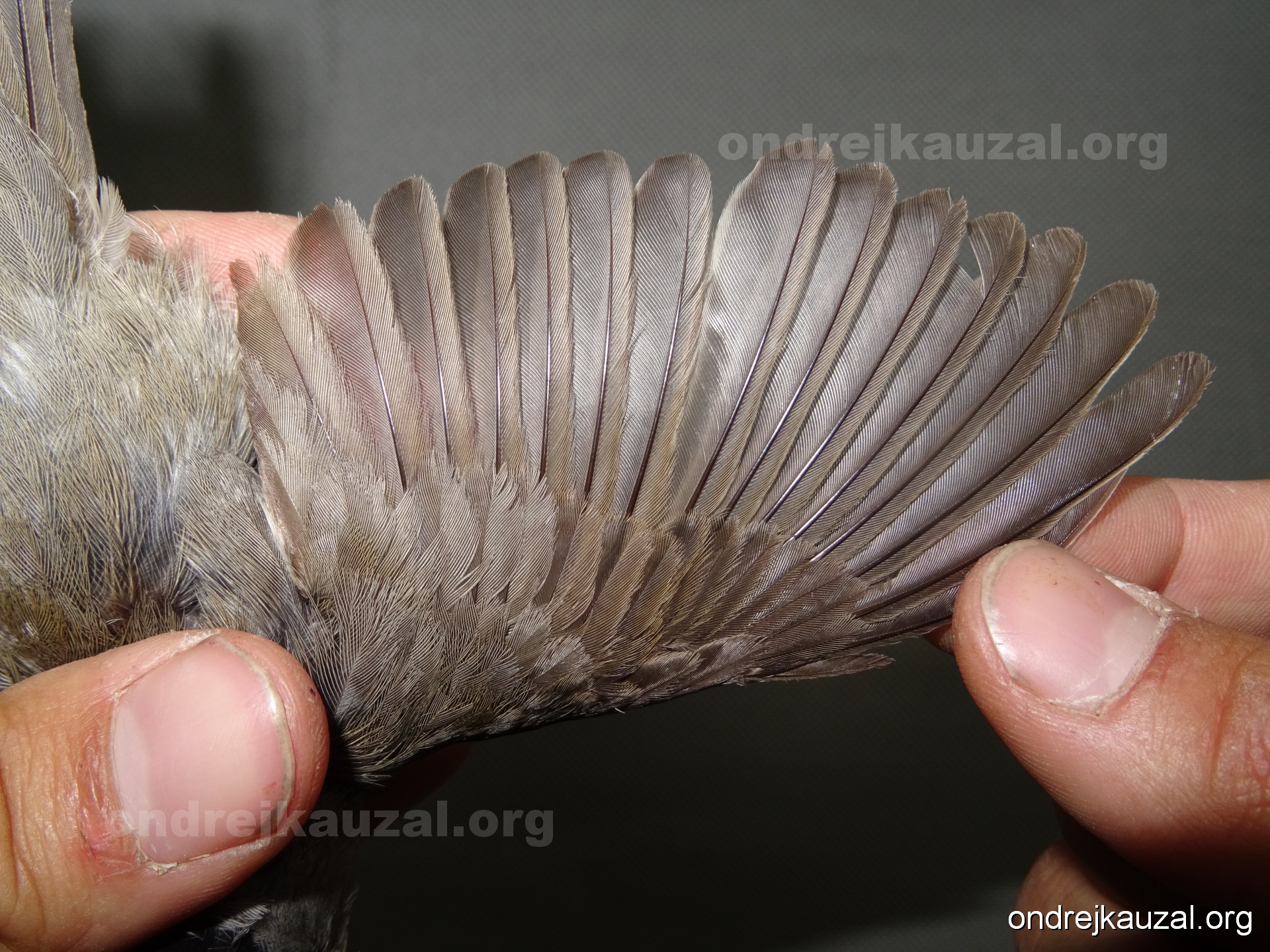 A bird showing nice fault bar across its remiges. While definitely not a good thing for the bird itself, such phenonema can aid in ageing. The uniform position of this bar from the wing indicates the wing feathers grew at the same time, i.e. on nest suggesting this bird is a young individual.