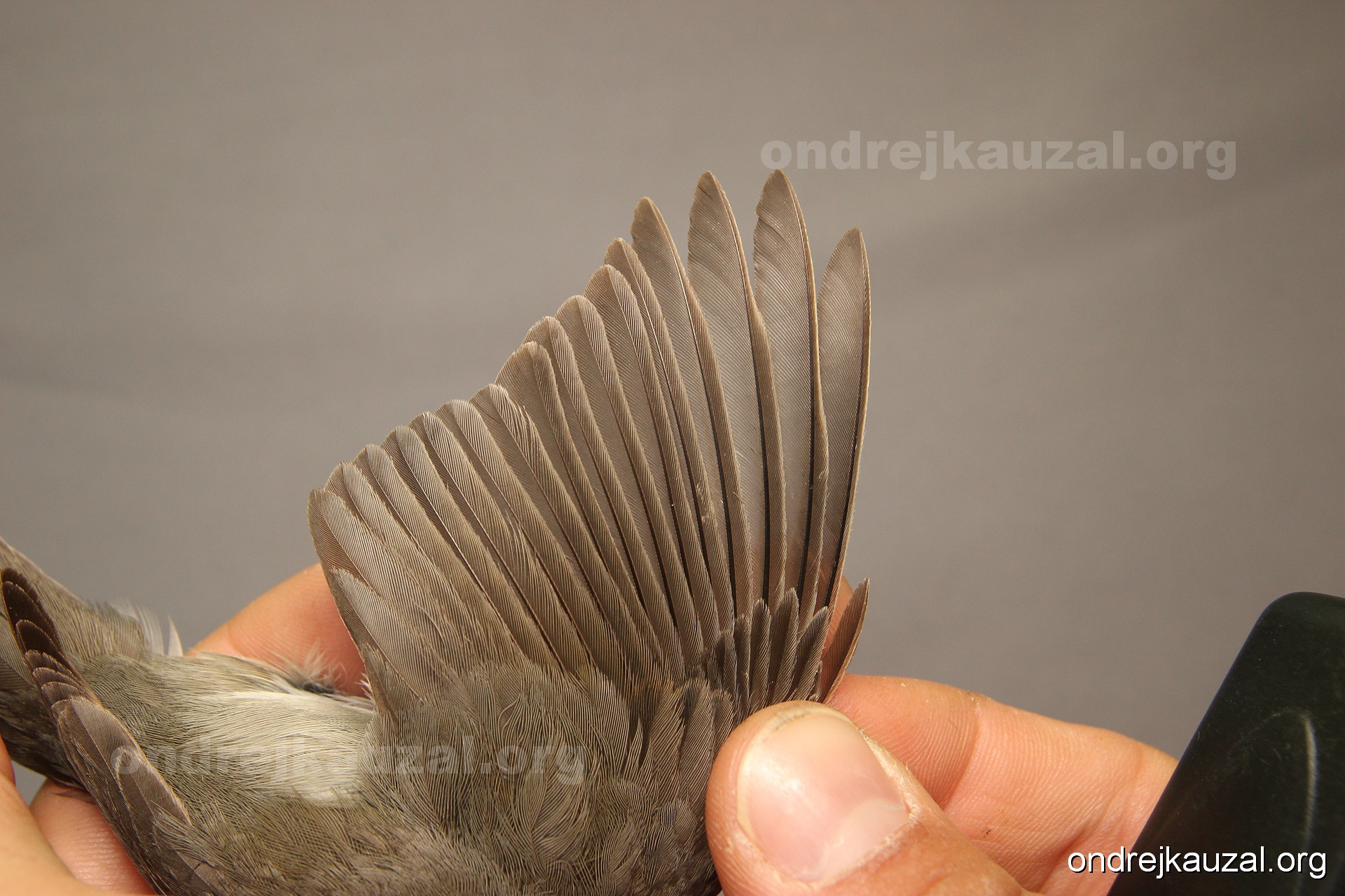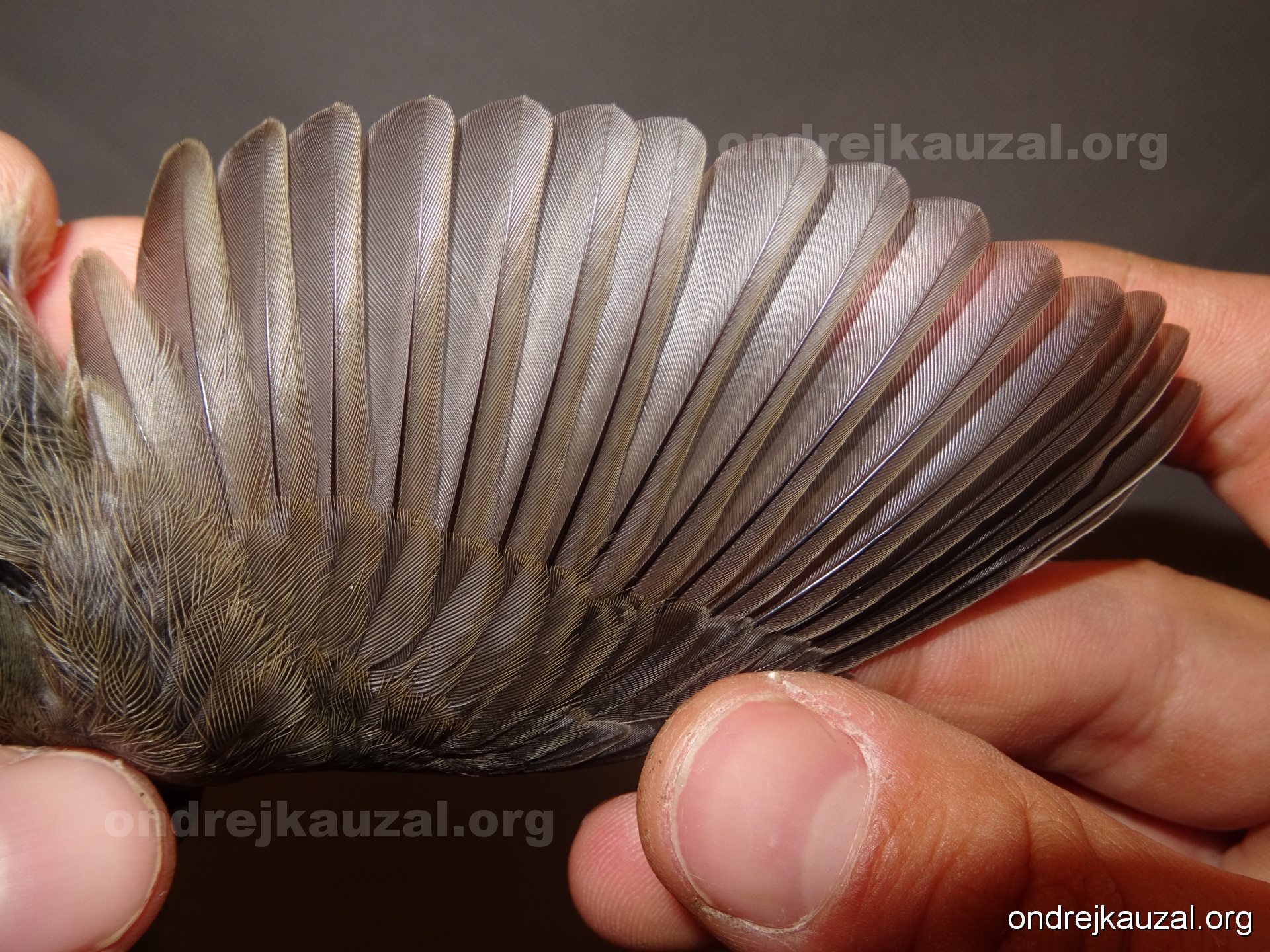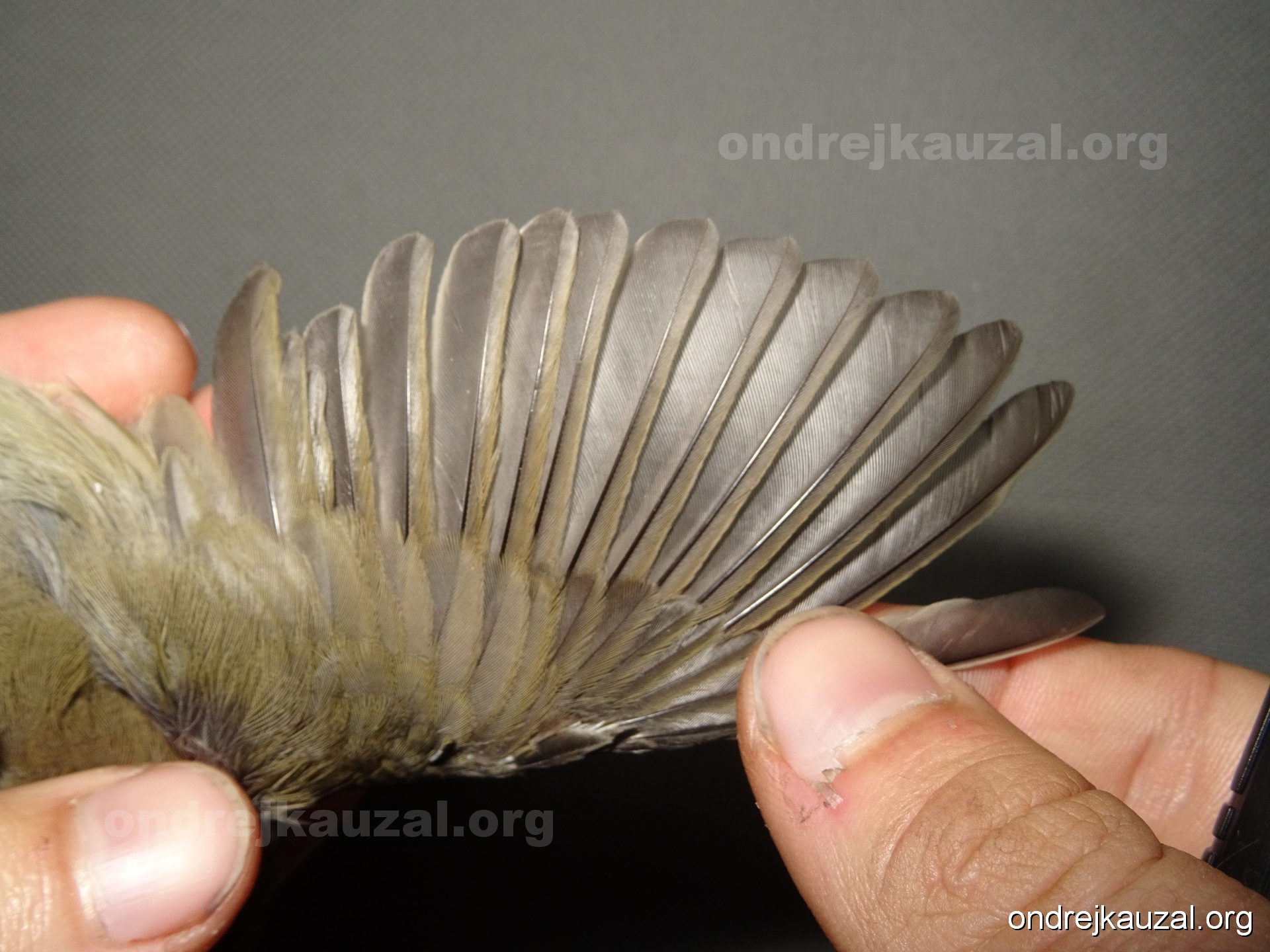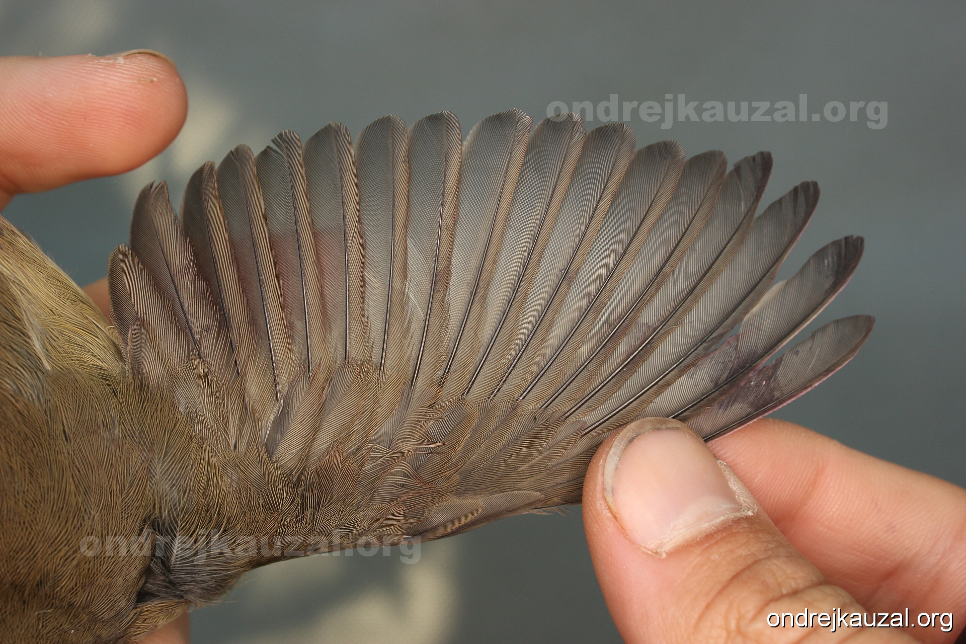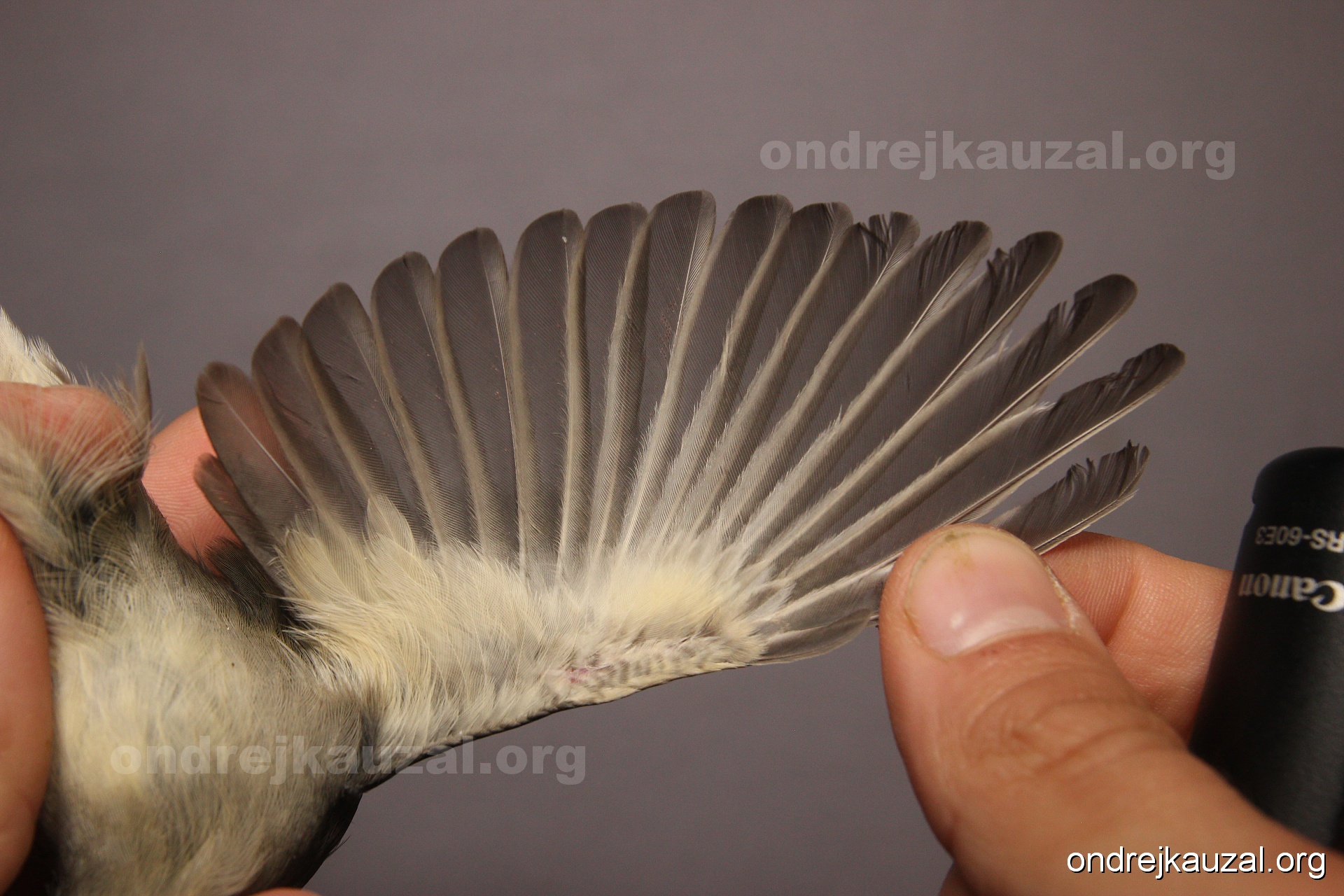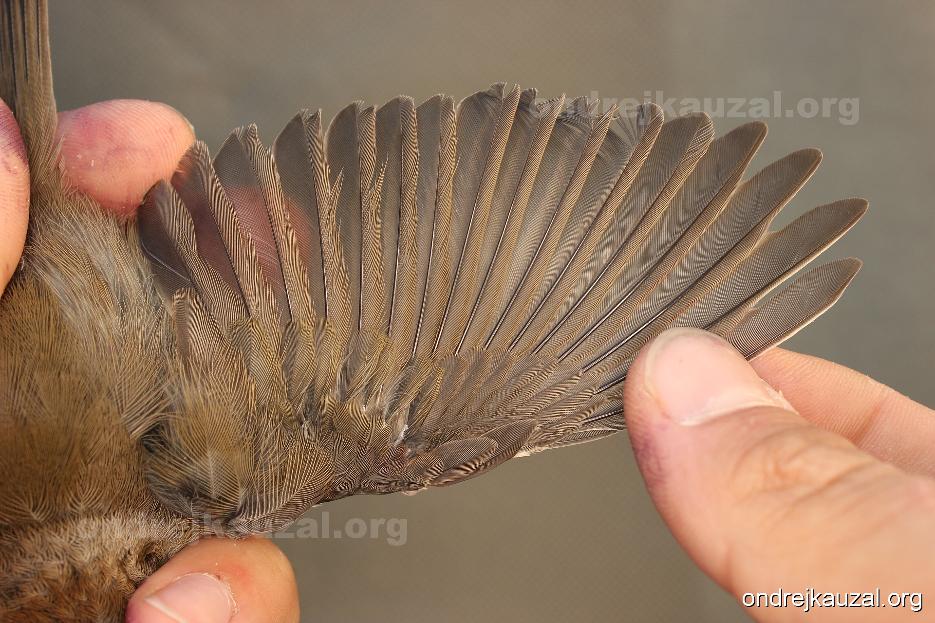 A bird showing nice fault bar across its remiges. While definitely not a good thing for the bird itself, such phenonema can aid in ageing. The uniform position of this bar from the wing indicates the wing feathers grew at the same time, i.e. on nest suggesting this bird is a young individual.