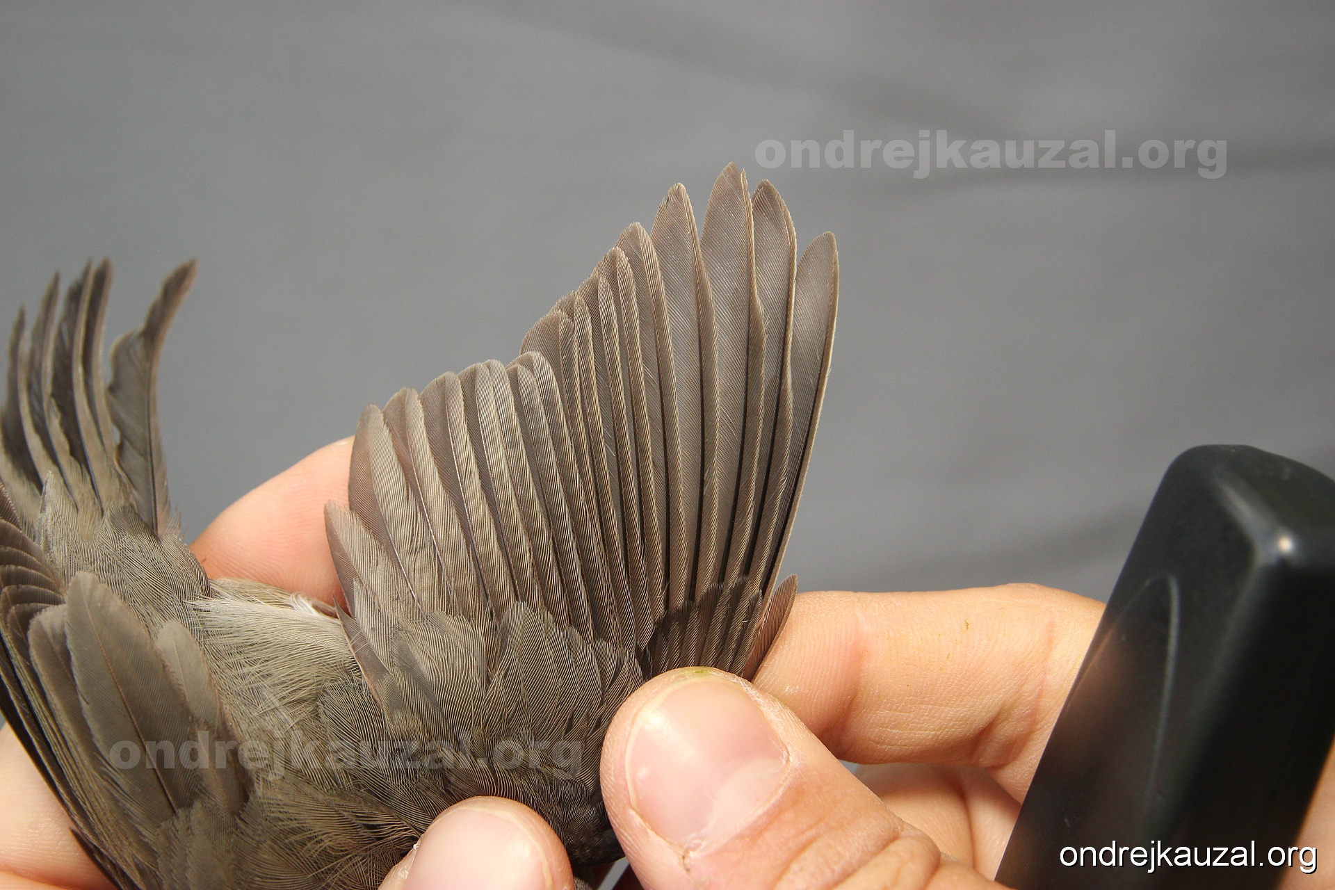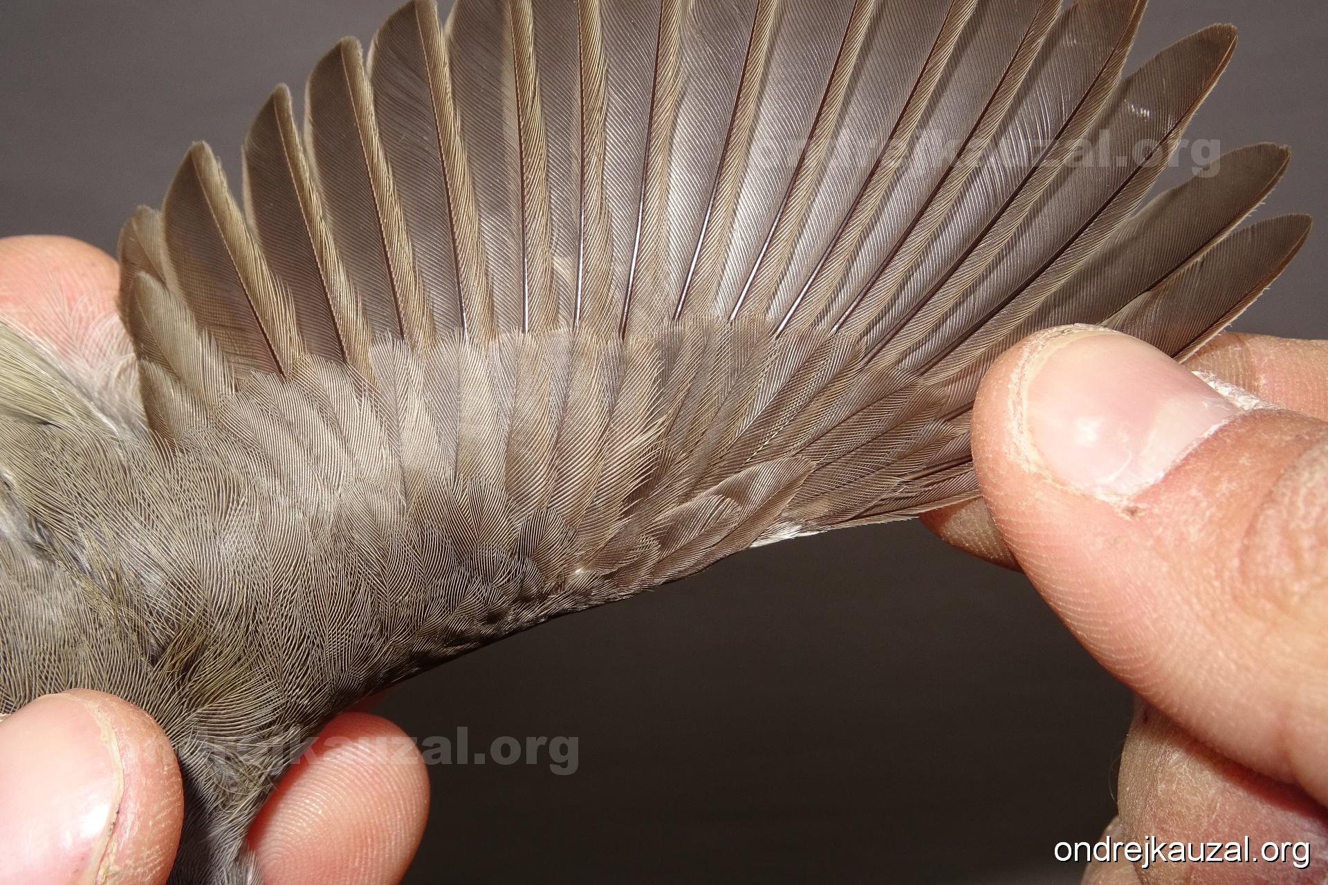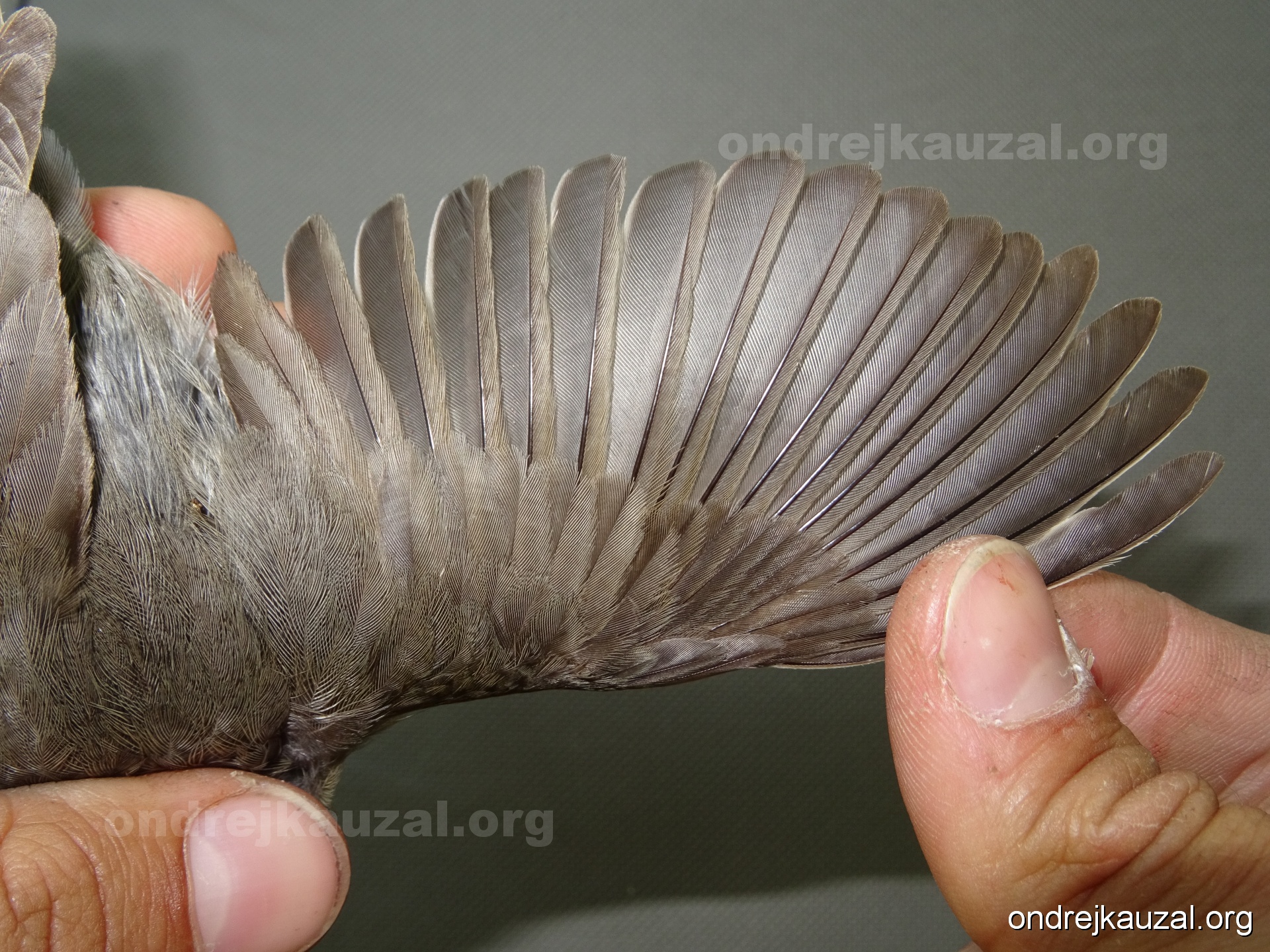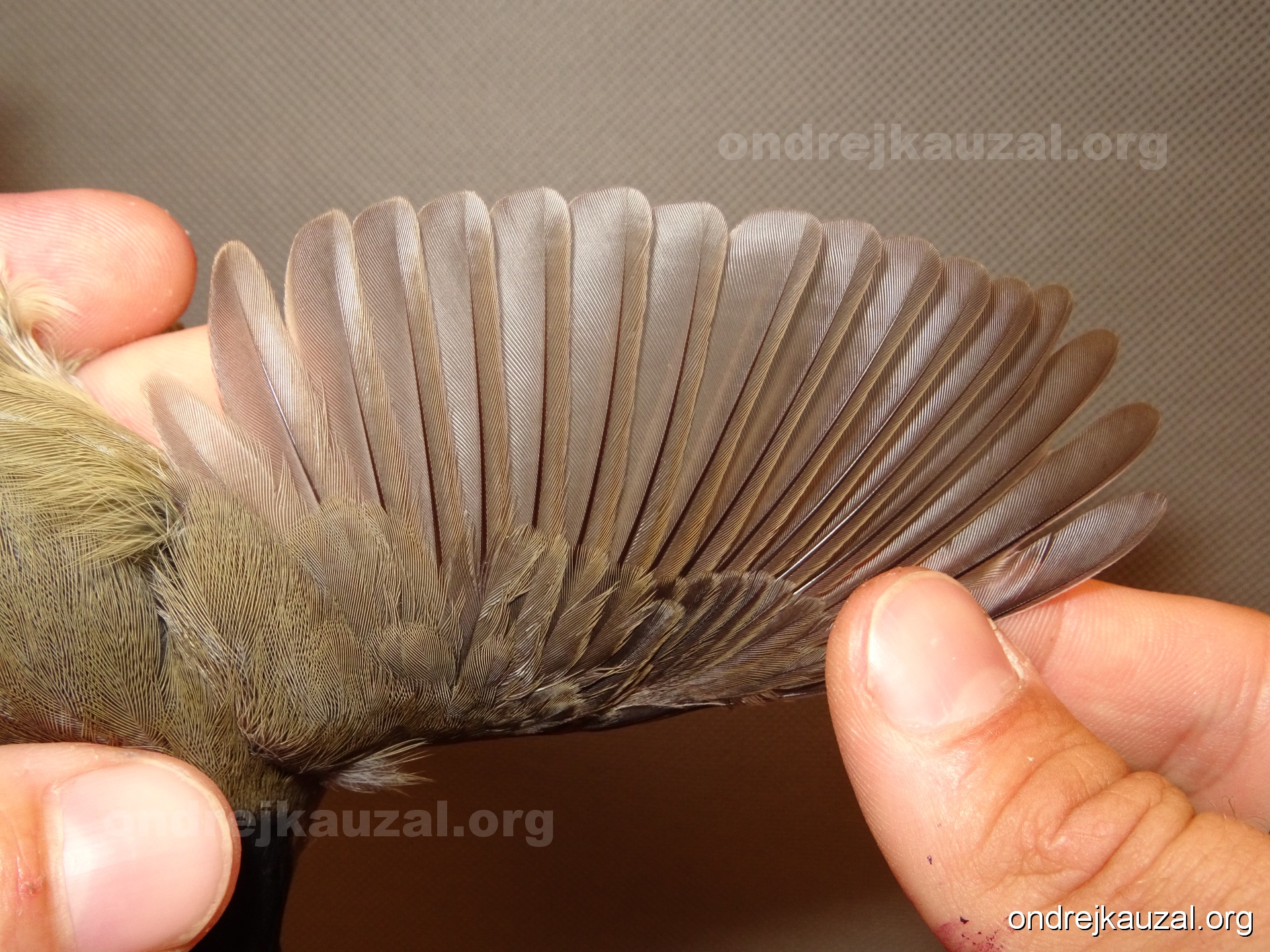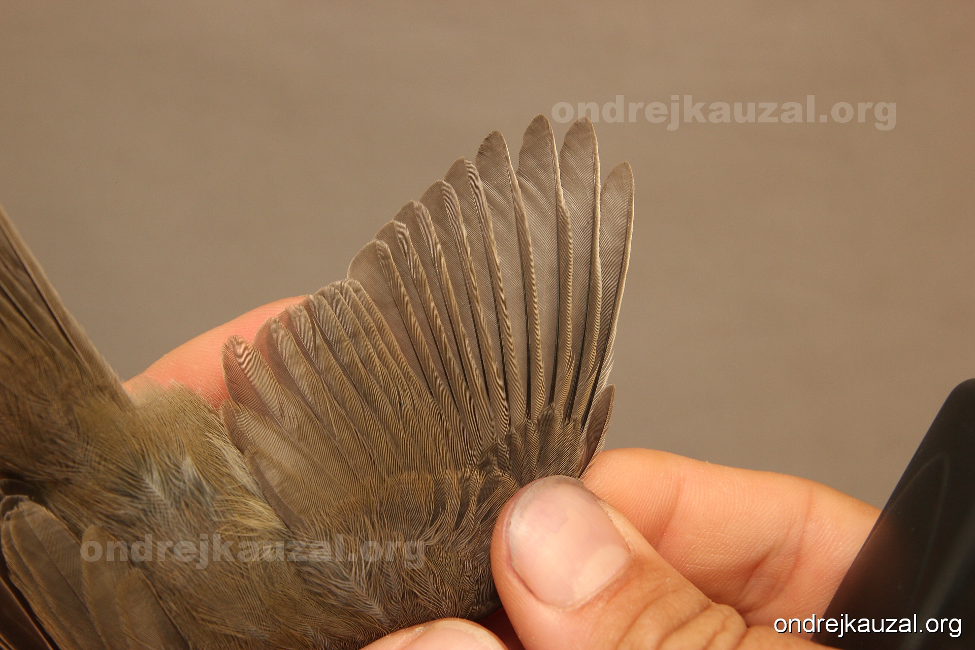 A bird showing nice fault bar across its remiges. While definitely not a good thing for the bird itself, such phenonema can aid in ageing. The uniform position of this bar from the wing indicates the wing feathers grew at the same time, i.e. on nest suggesting this bird is a young individual.