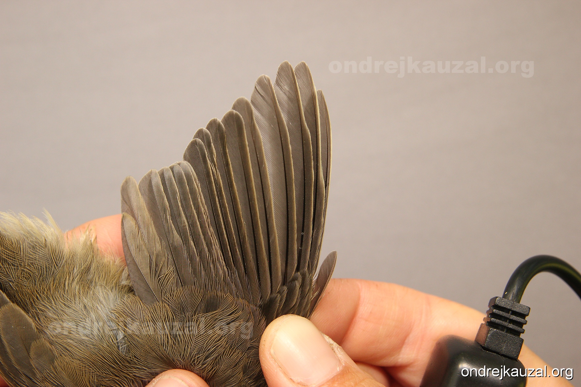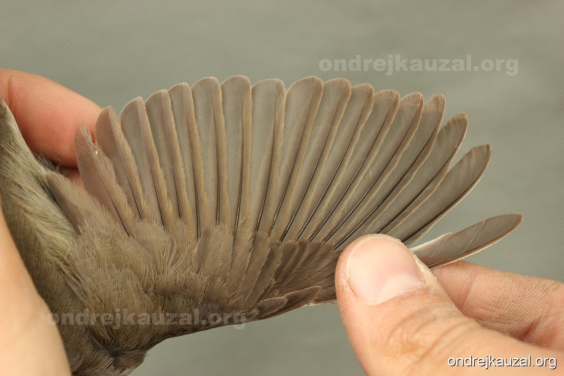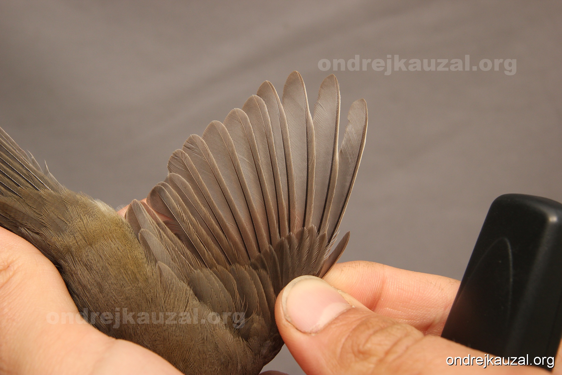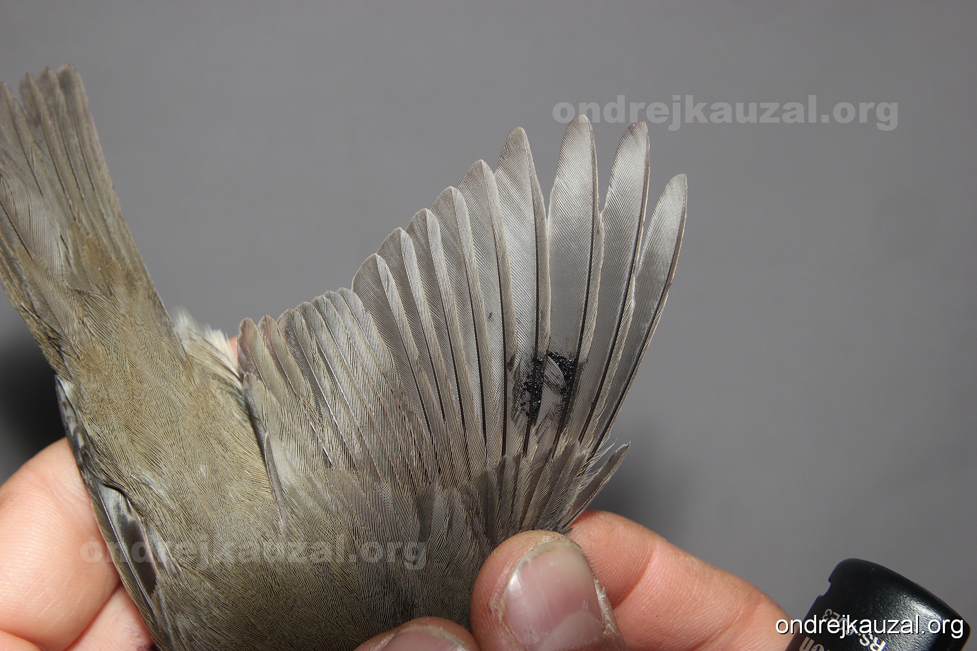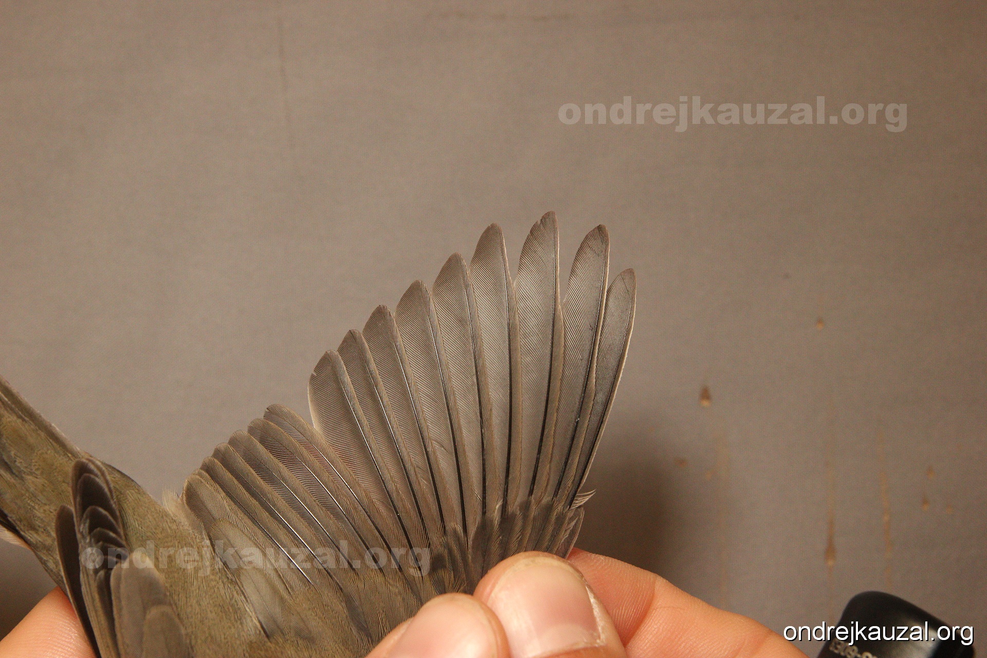 A bird showing nice fault bar across its remiges. While definitely not a good thing for the bird itself, such phenonema can aid in ageing. The uniform position of this bar from the wing indicates the wing feathers grew at the same time, i.e. on nest suggesting this bird is a young individual.