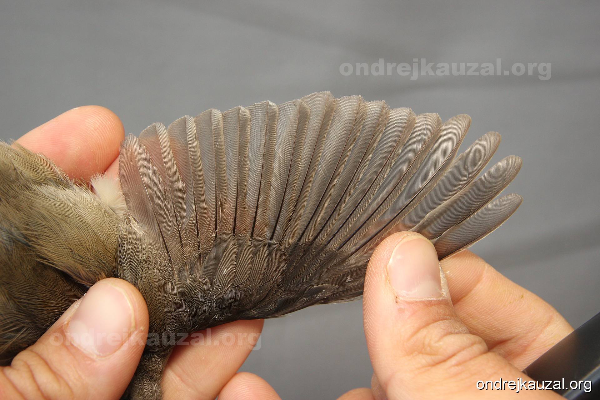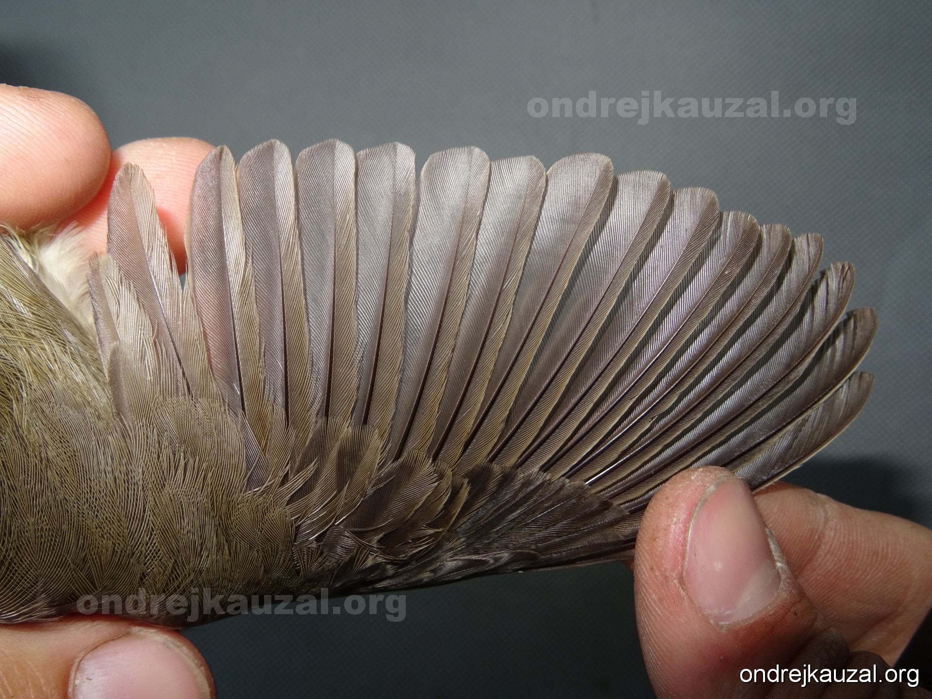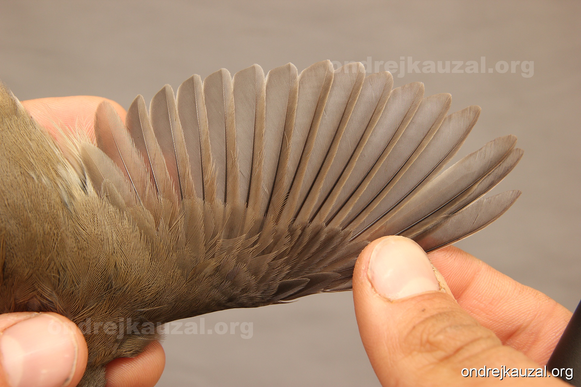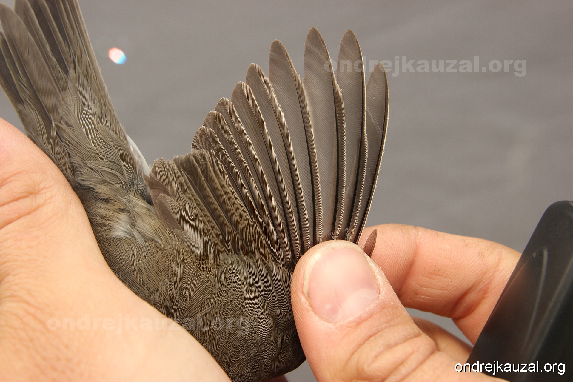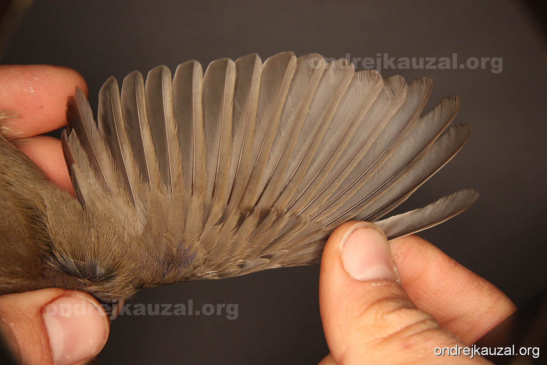 A bird showing nice fault bar across its remiges. While definitely not a good thing for the bird itself, such phenonema can aid in ageing. The uniform position of this bar from the wing indicates the wing feathers grew at the same time, i.e. on nest suggesting this bird is a young individual.