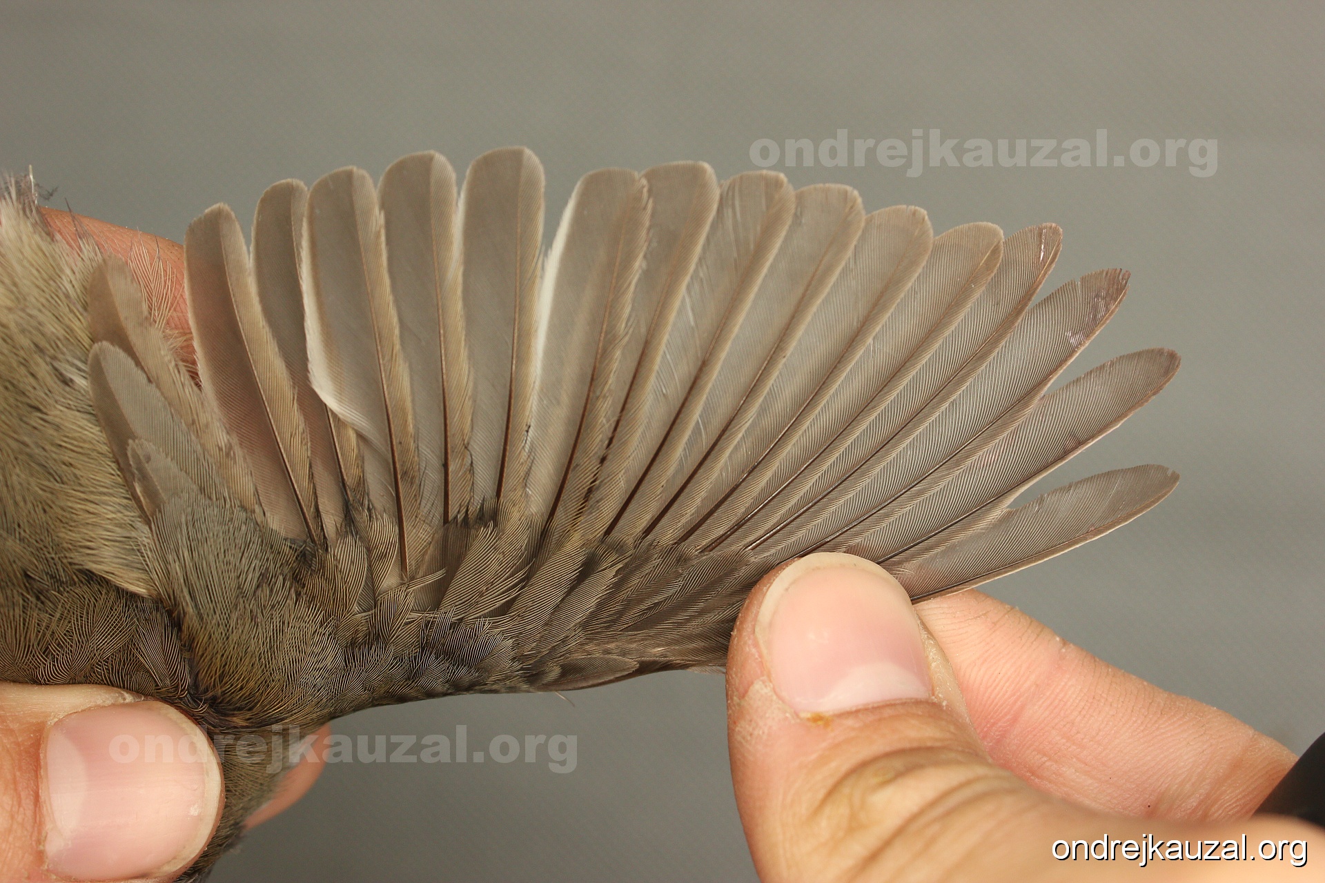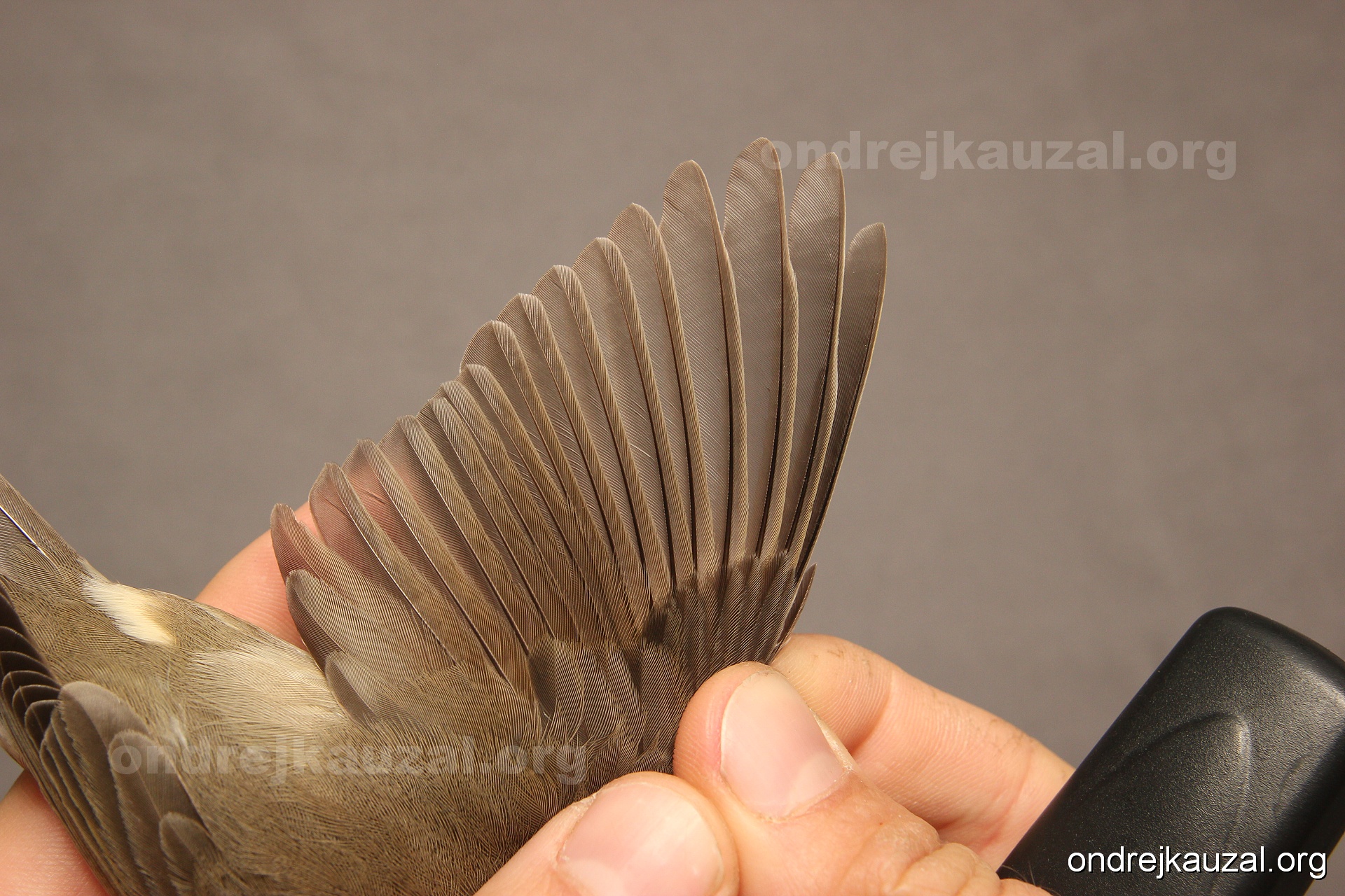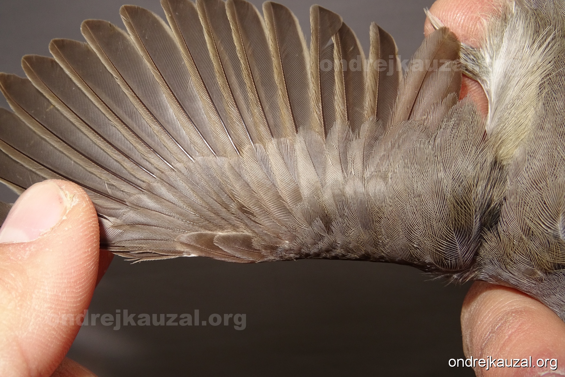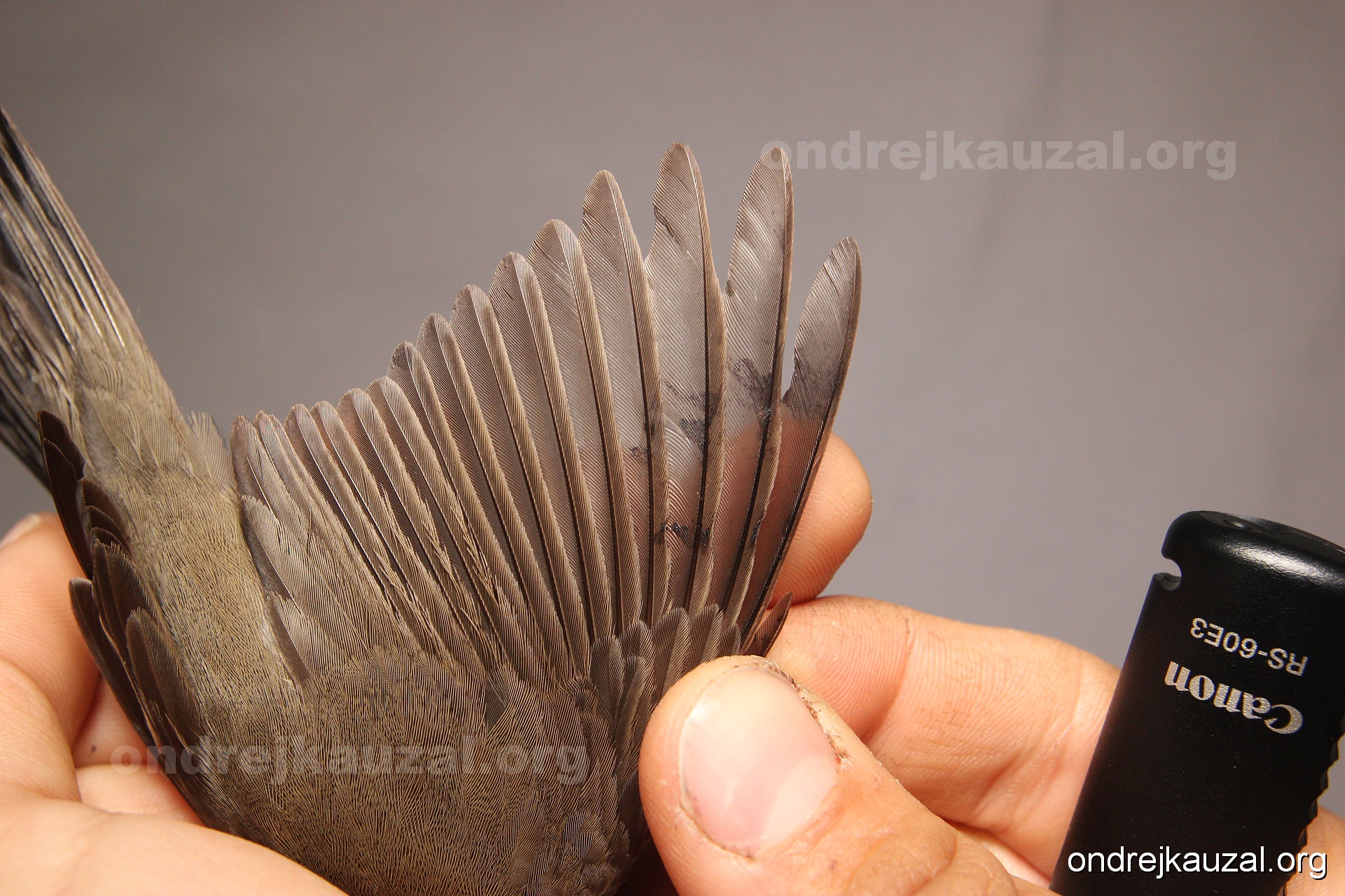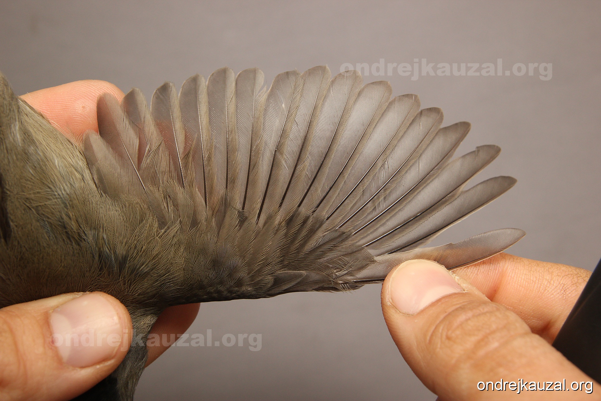 A bird showing nice fault bar across its remiges. While definitely not a good thing for the bird itself, such phenonema can aid in ageing. The uniform position of this bar from the wing indicates the wing feathers grew at the same time, i.e. on nest suggesting this bird is a young individual.