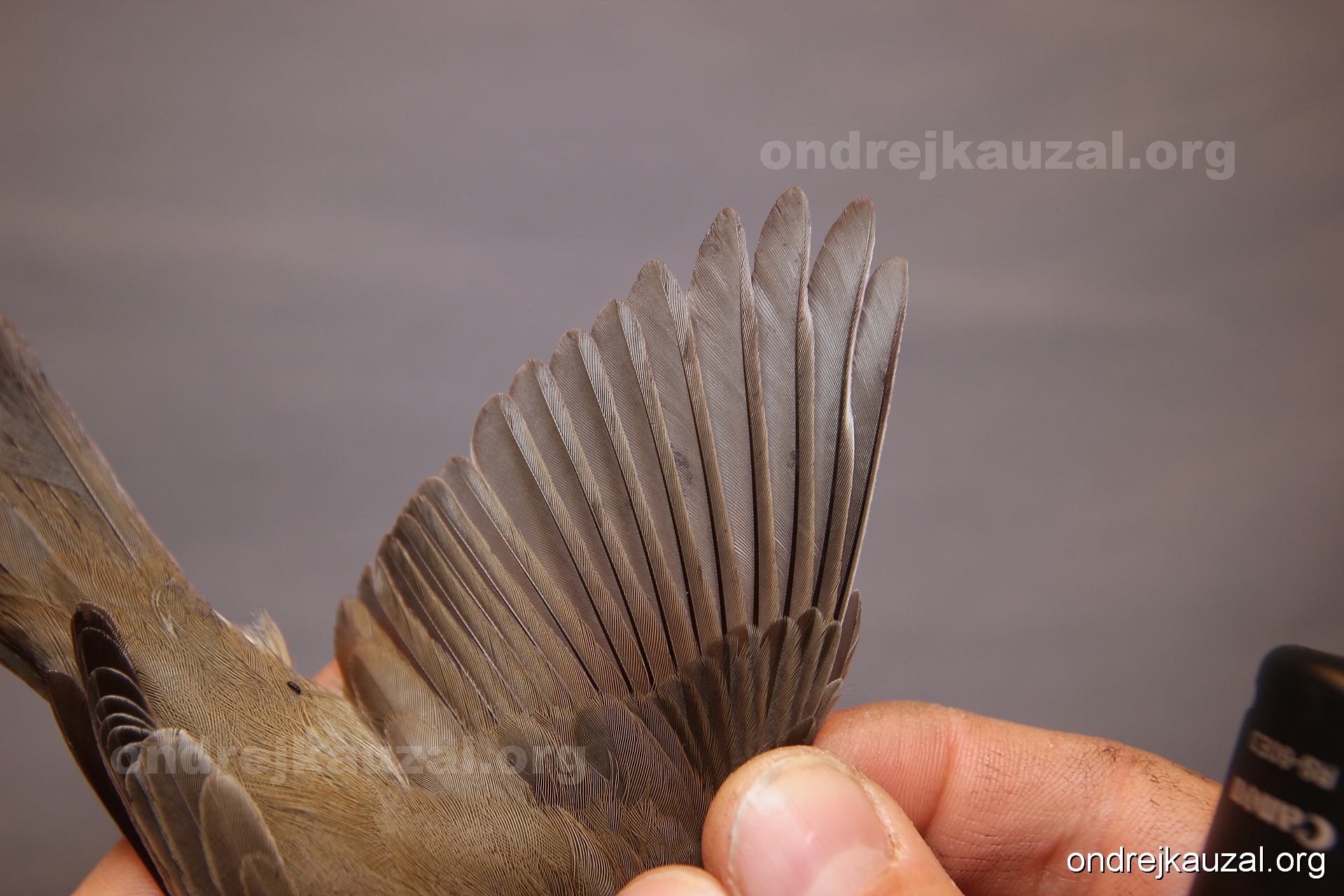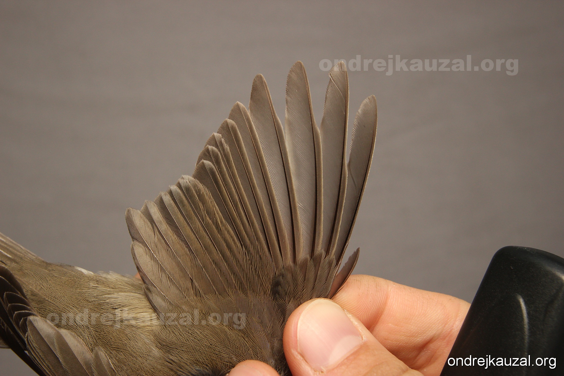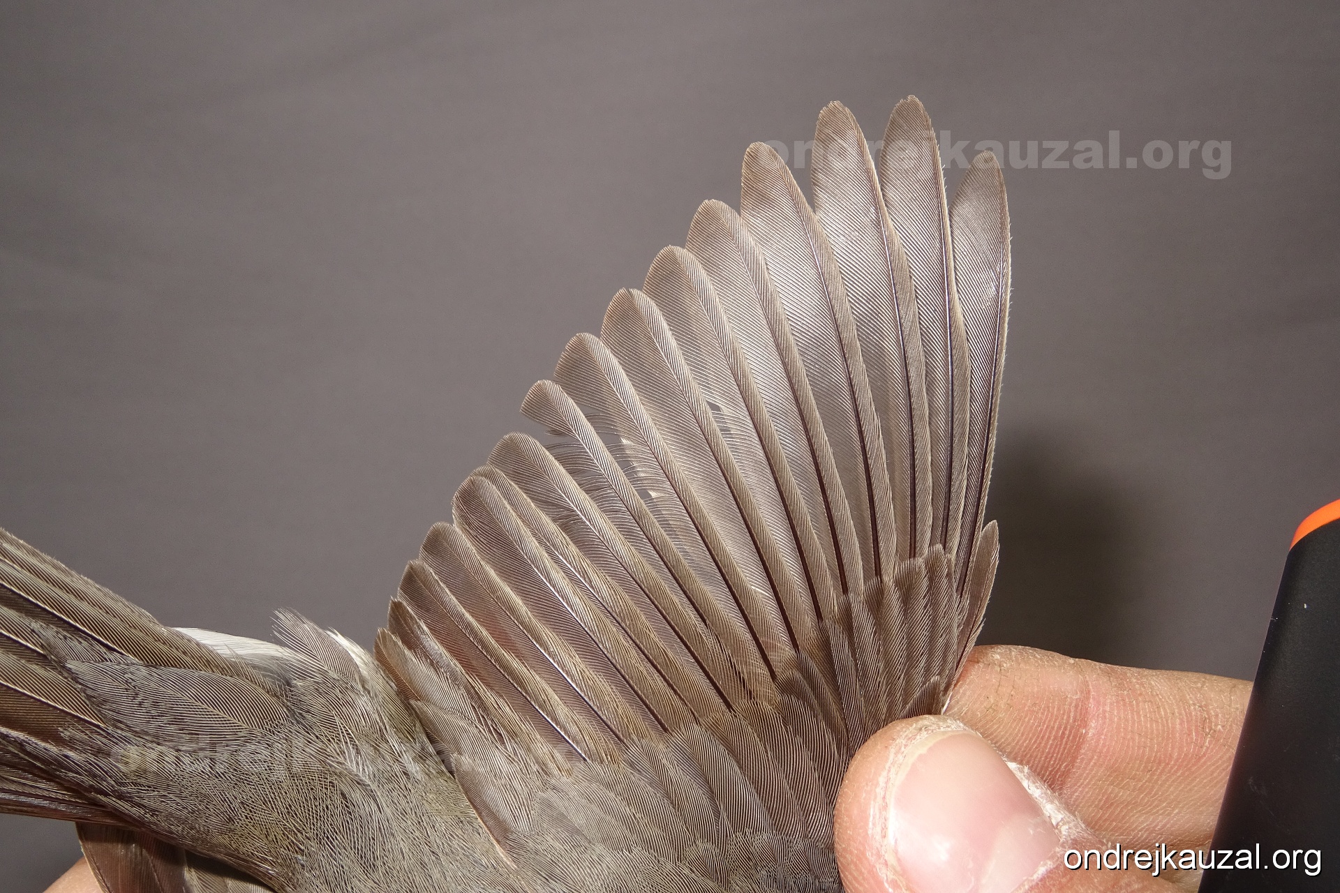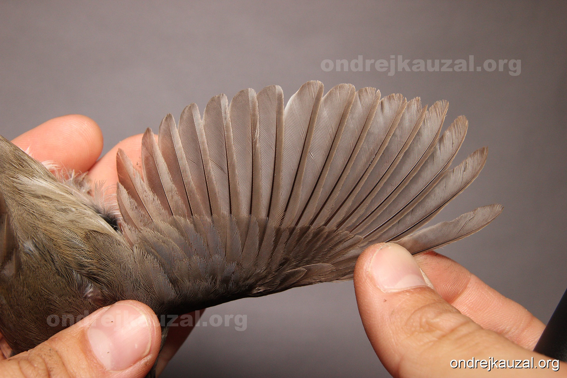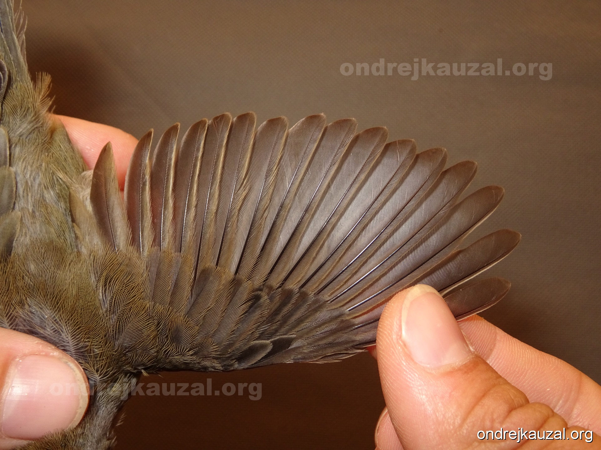 A bird showing nice fault bar across its remiges. While definitely not a good thing for the bird itself, such phenonema can aid in ageing. The uniform position of this bar from the wing indicates the wing feathers grew at the same time, i.e. on nest suggesting this bird is a young individual.
