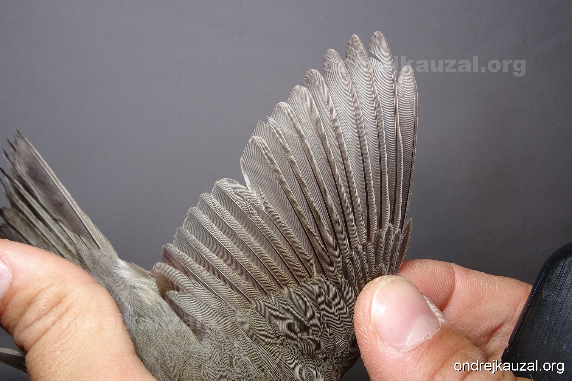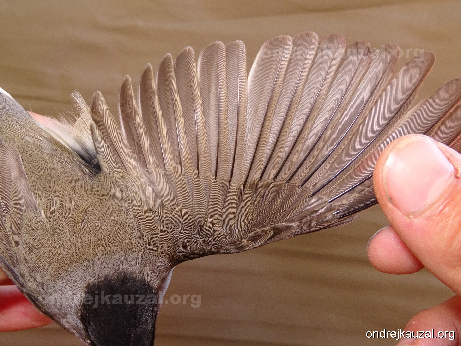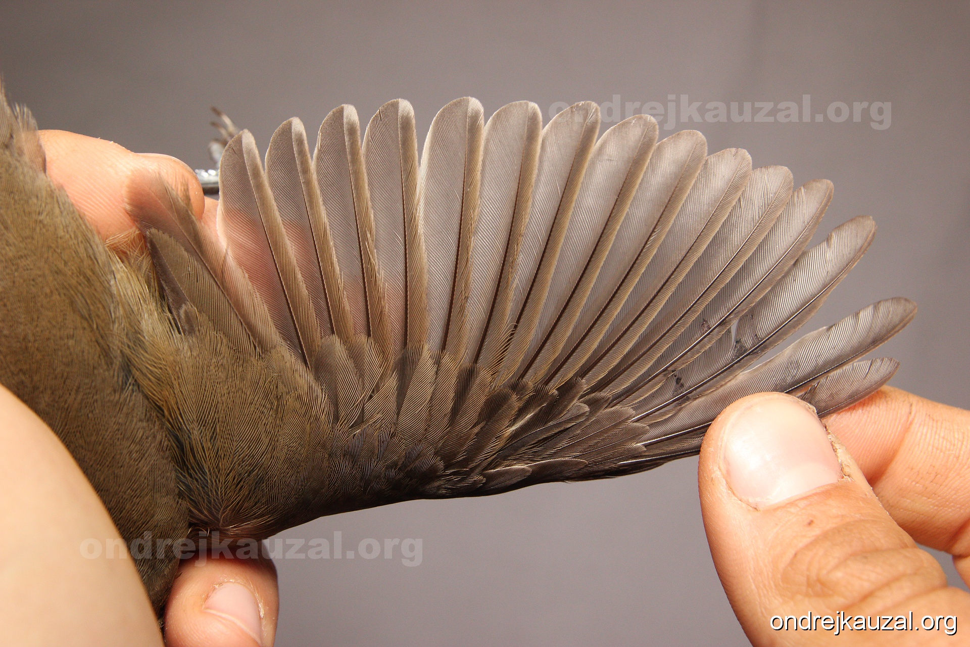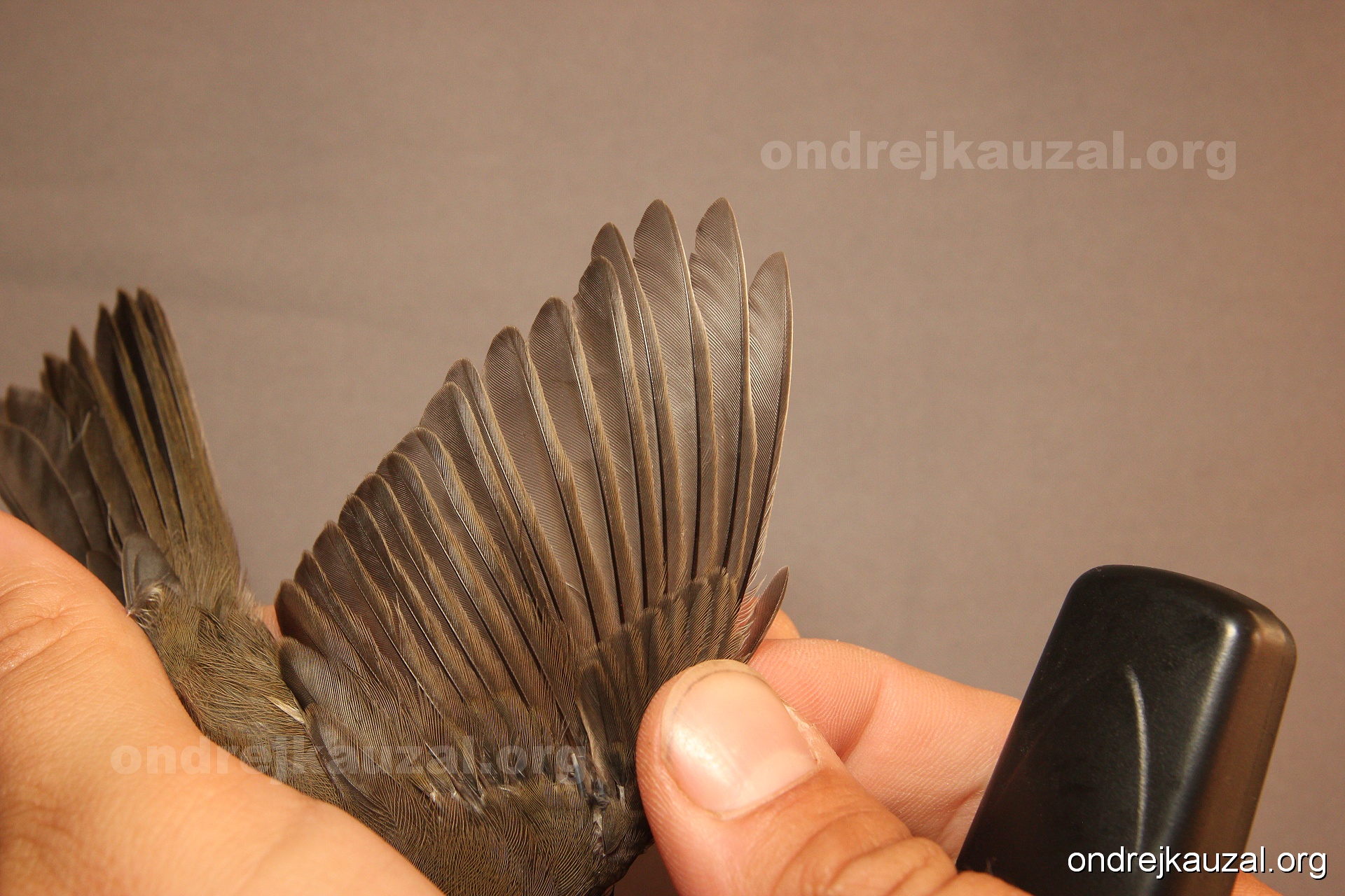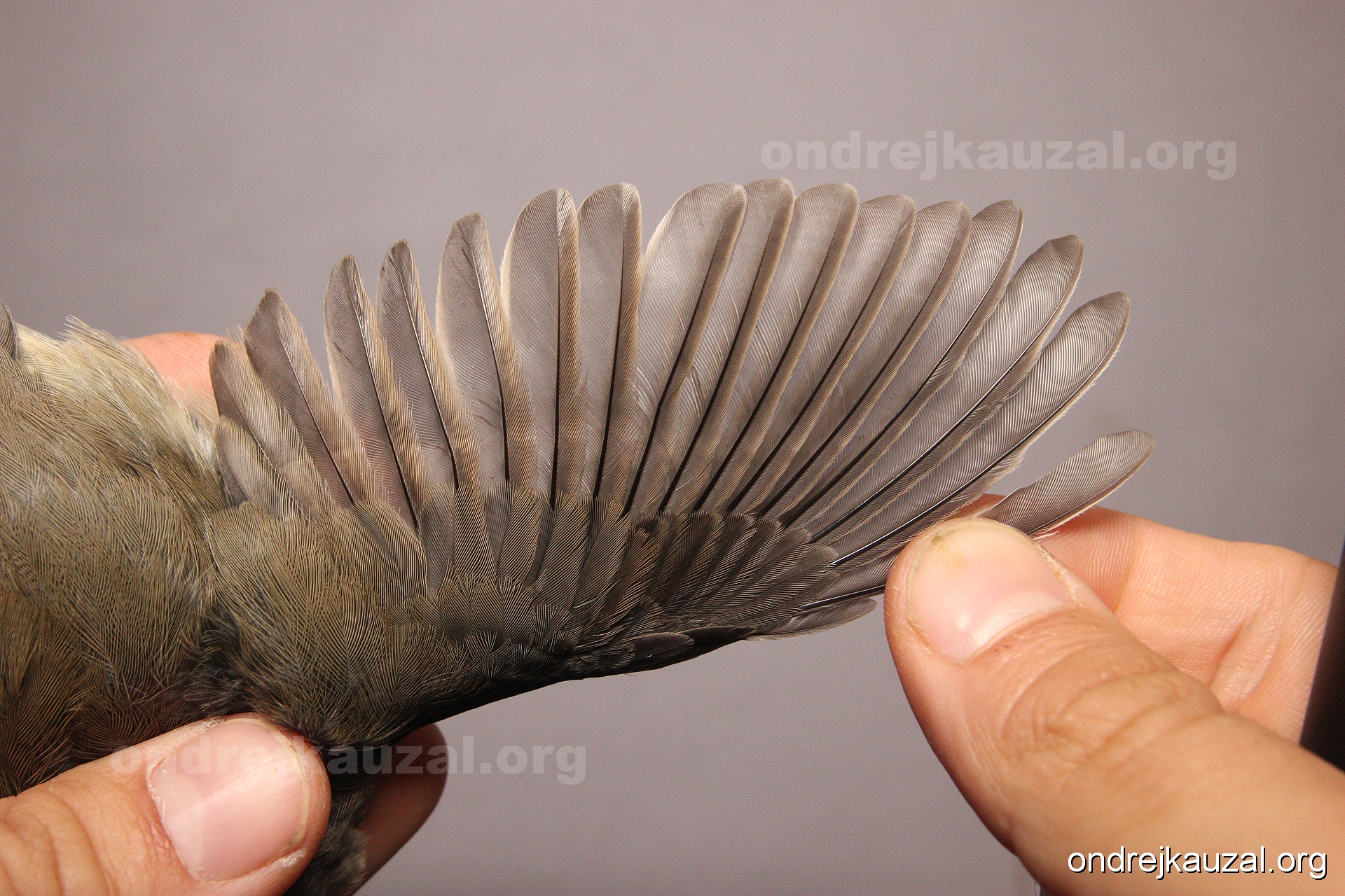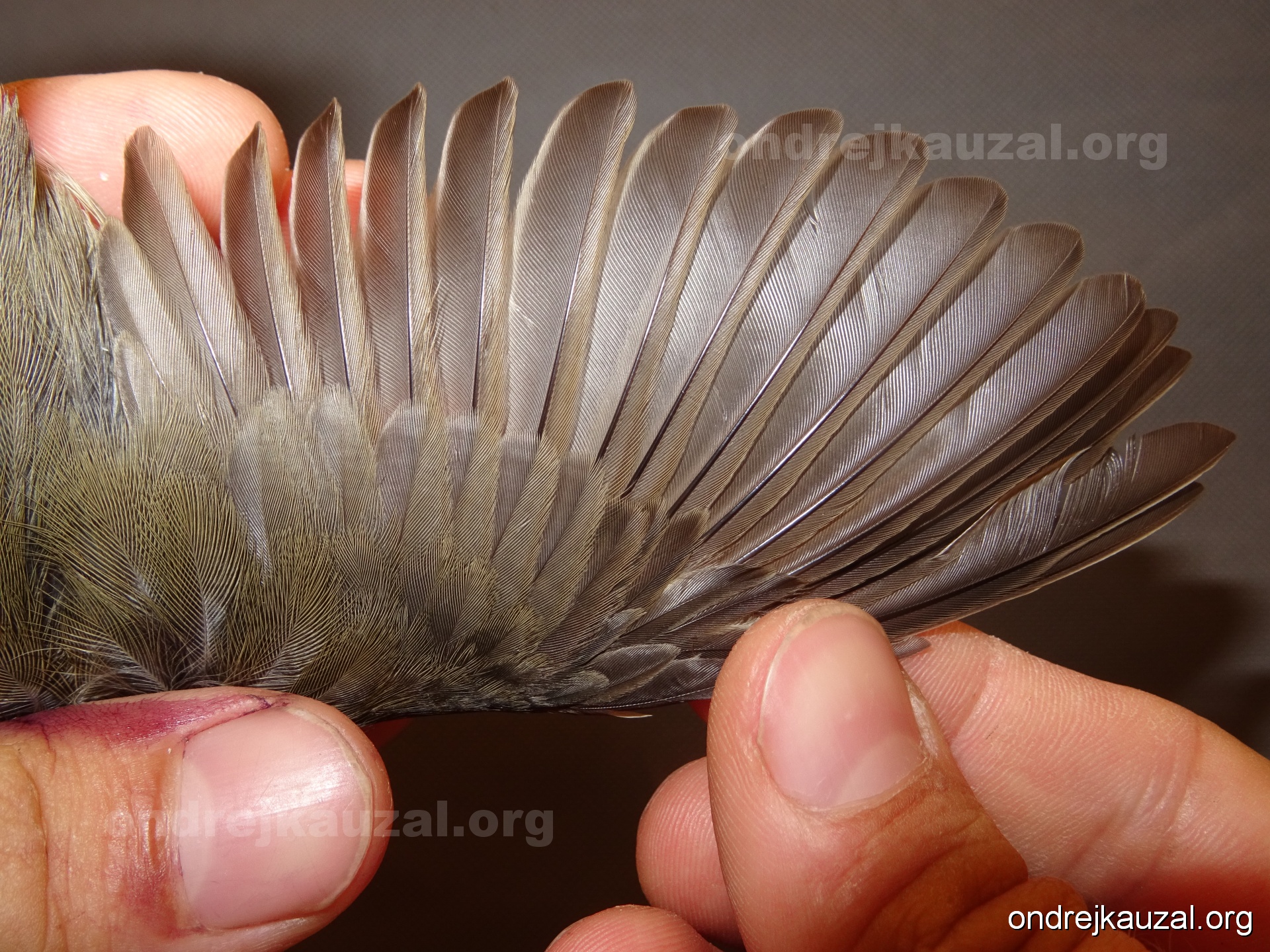 A bird showing nice fault bar across its remiges. While definitely not a good thing for the bird itself, such phenonema can aid in ageing. The uniform position of this bar from the wing indicates the wing feathers grew at the same time, i.e. on nest suggesting this bird is a young individual.