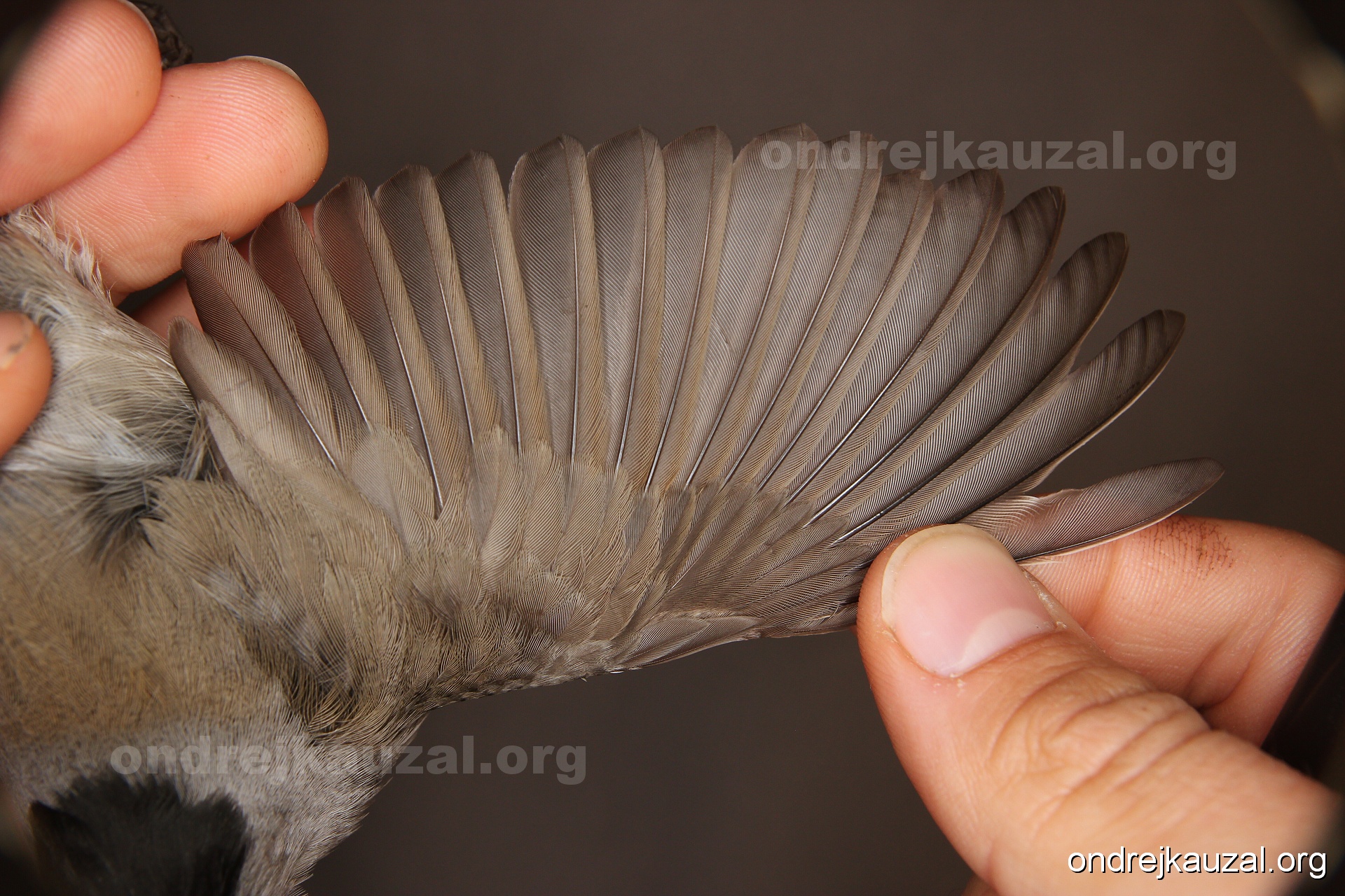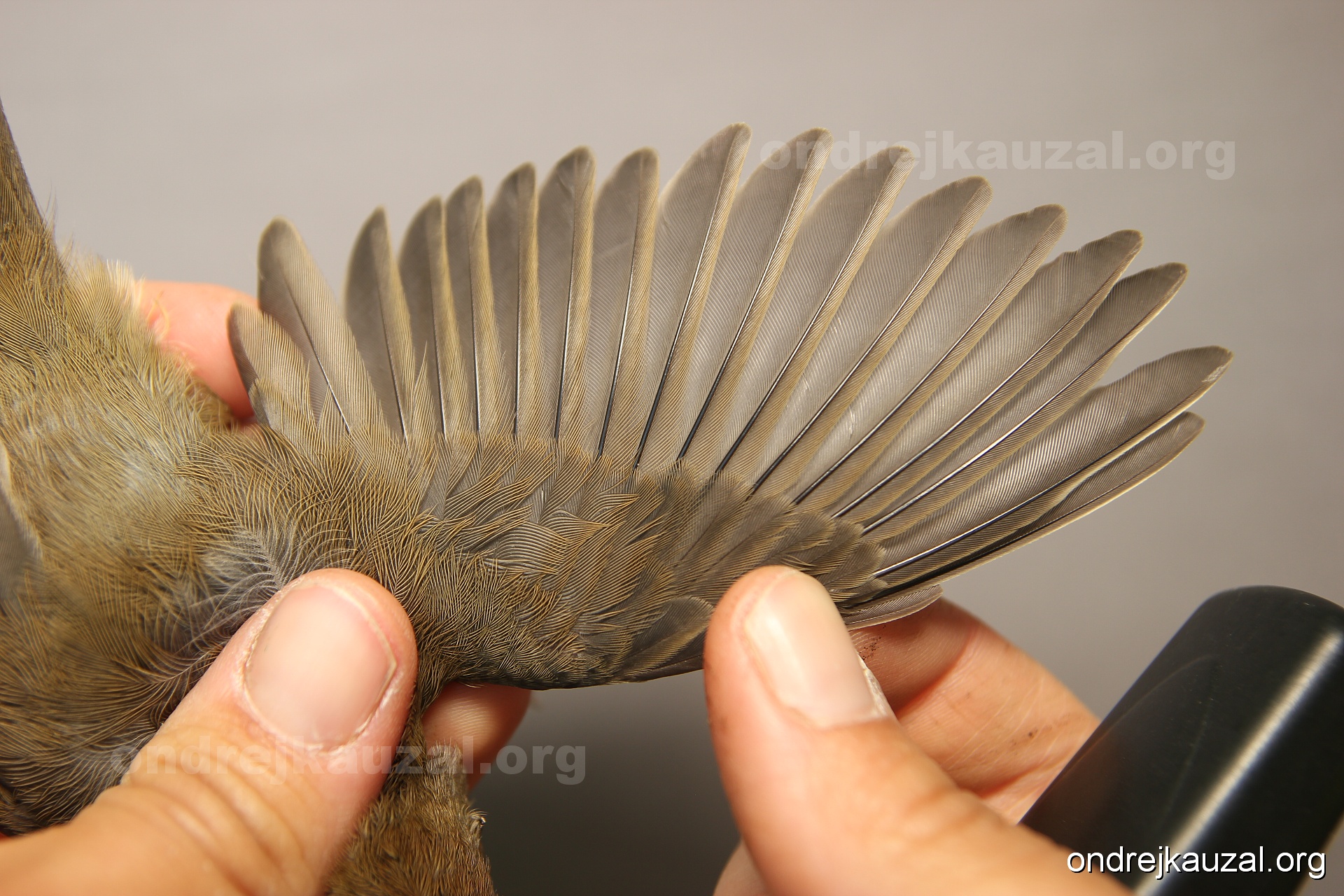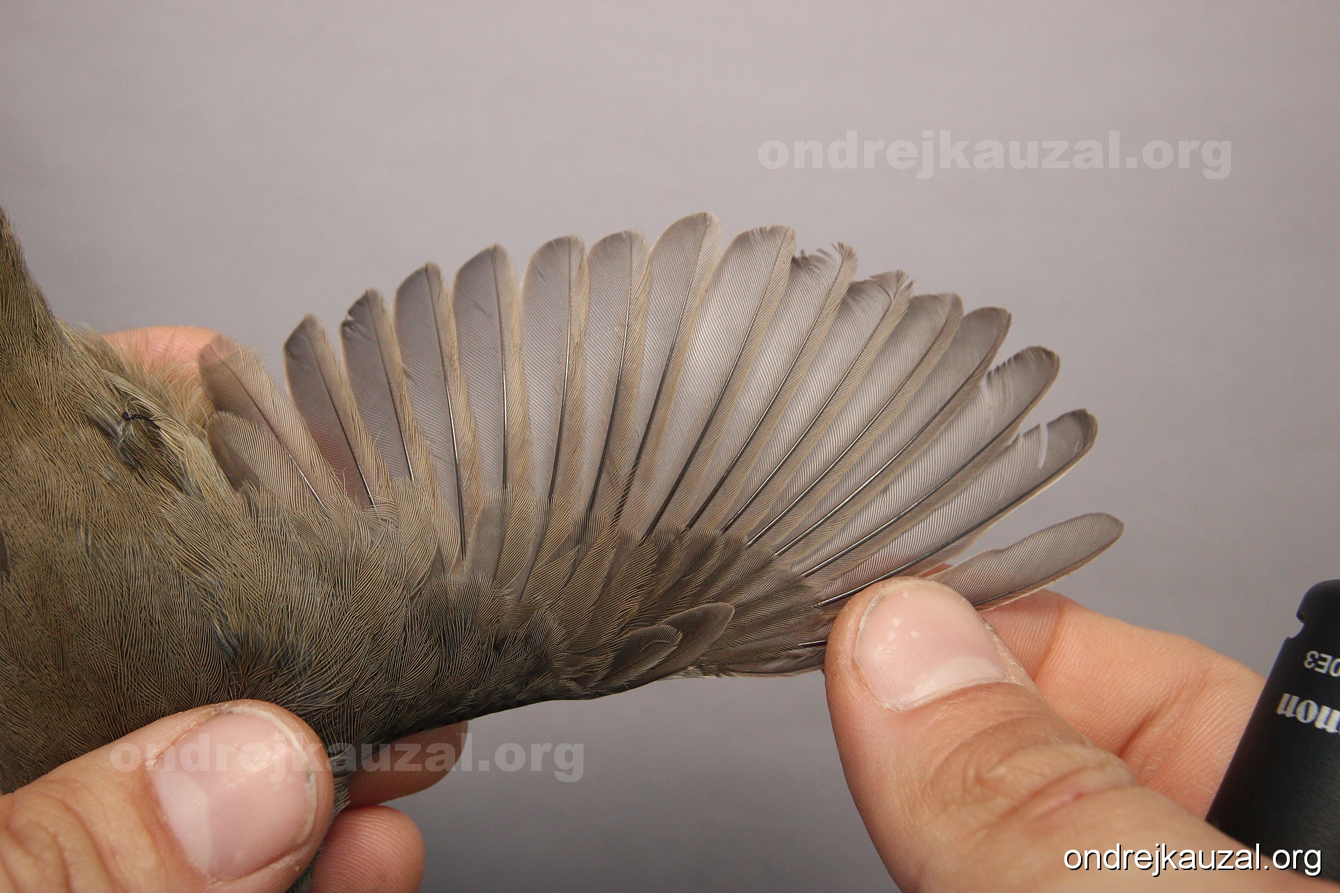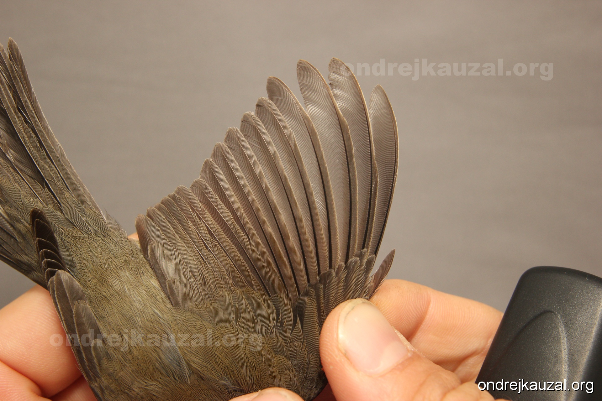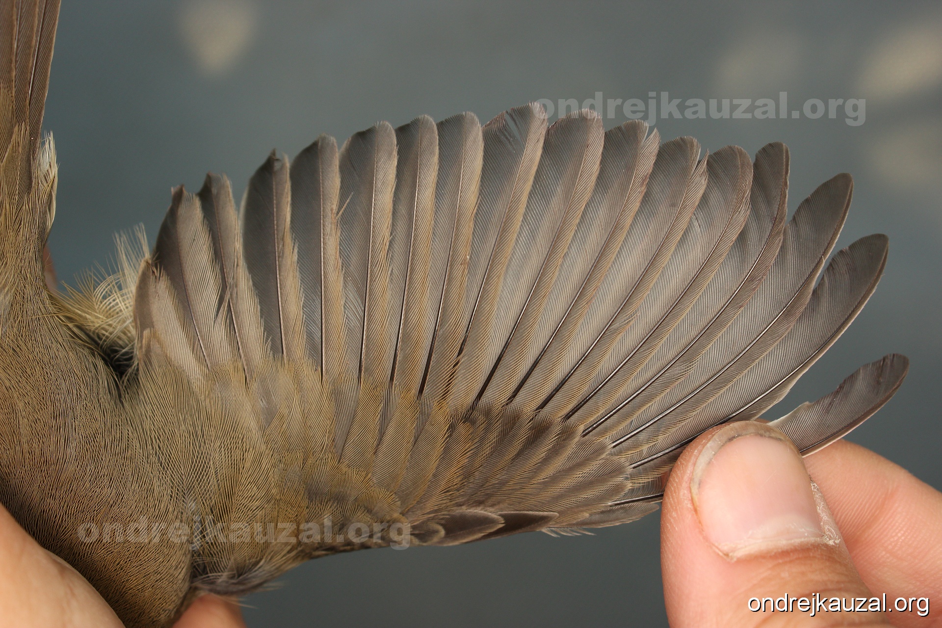A bird showing nice fault bar across its remiges. While definitely not a good thing for the bird itself, such phenonema can aid in ageing. The uniform position of this bar from the wing indicates the wing feathers grew at the same time, i.e. on nest suggesting this bird is a young individual.