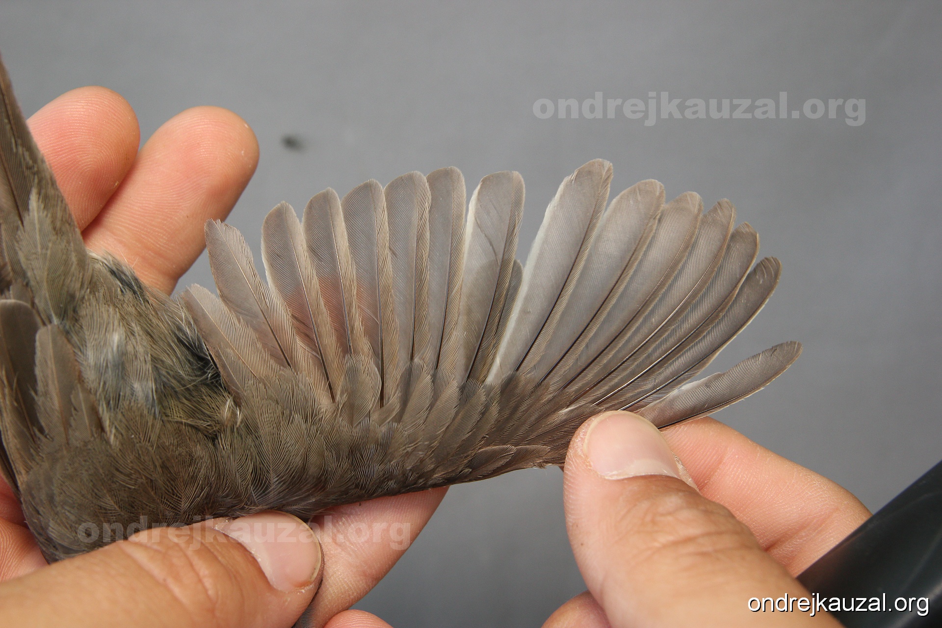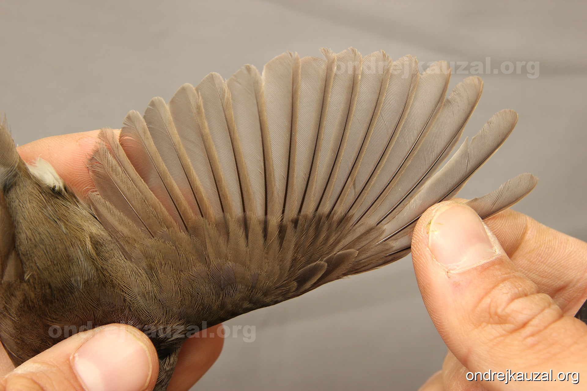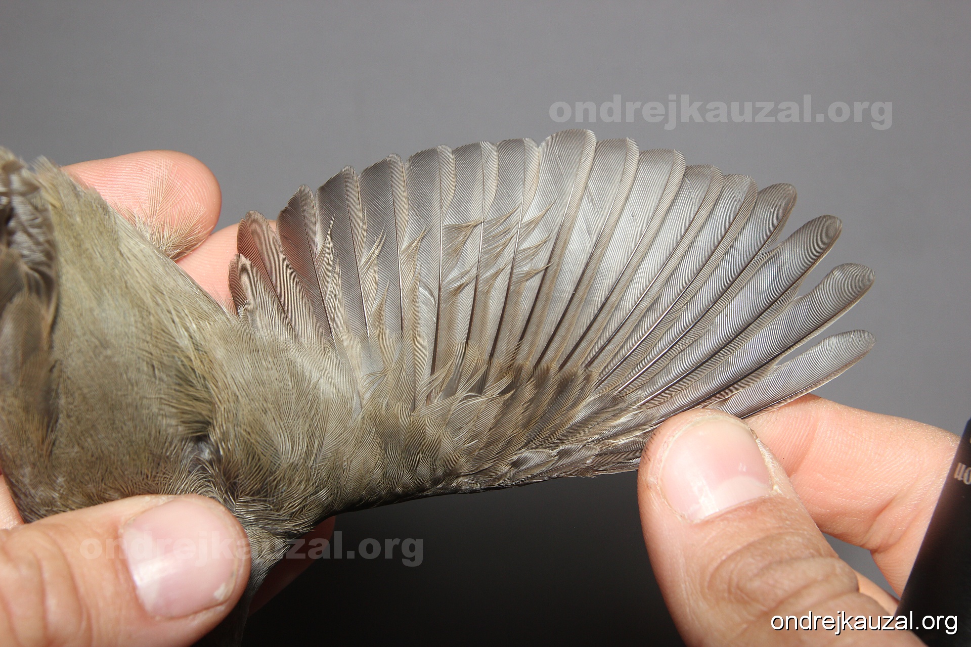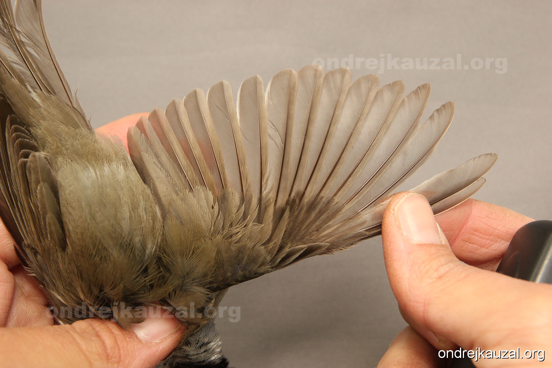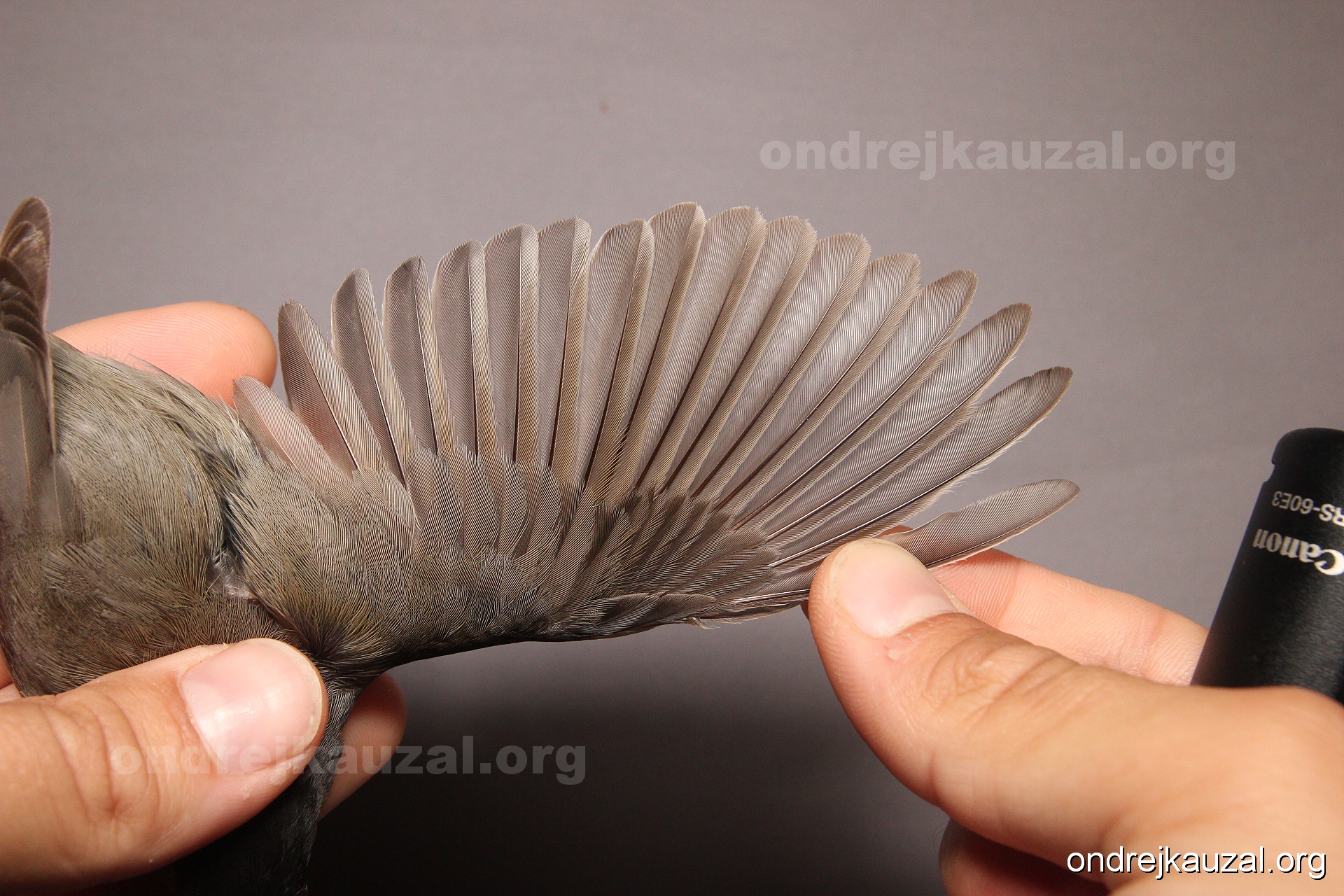 A bird showing nice fault bar across its remiges. While definitely not a good thing for the bird itself, such phenonema can aid in ageing. The uniform position of this bar from the wing indicates the wing feathers grew at the same time, i.e. on nest suggesting this bird is a young individual.