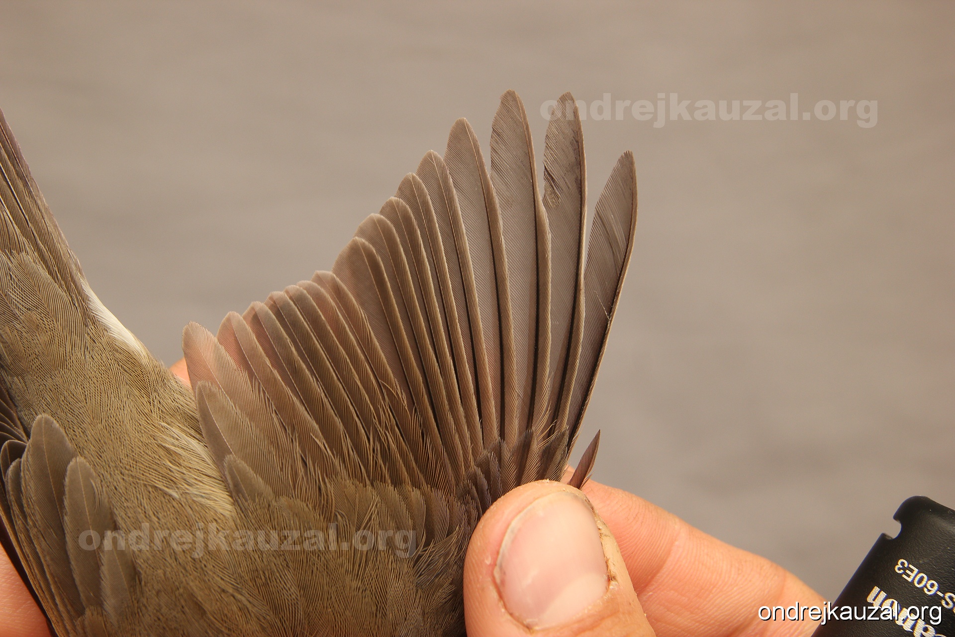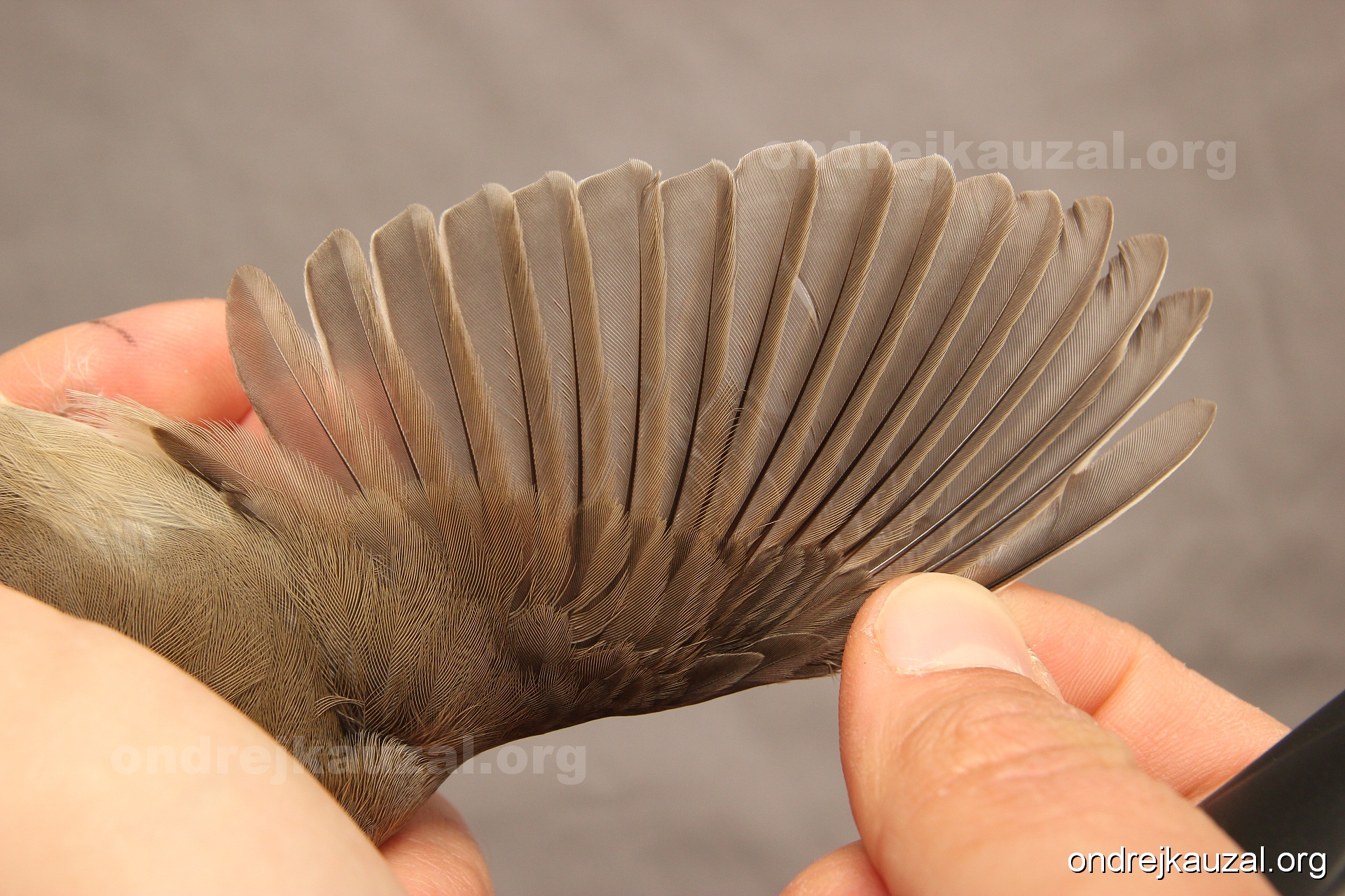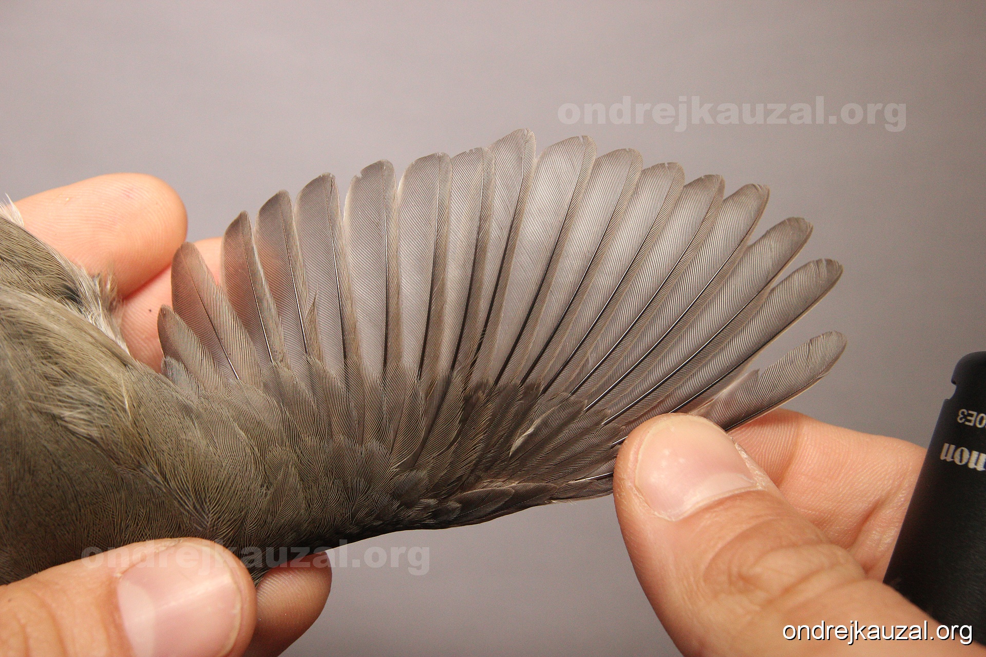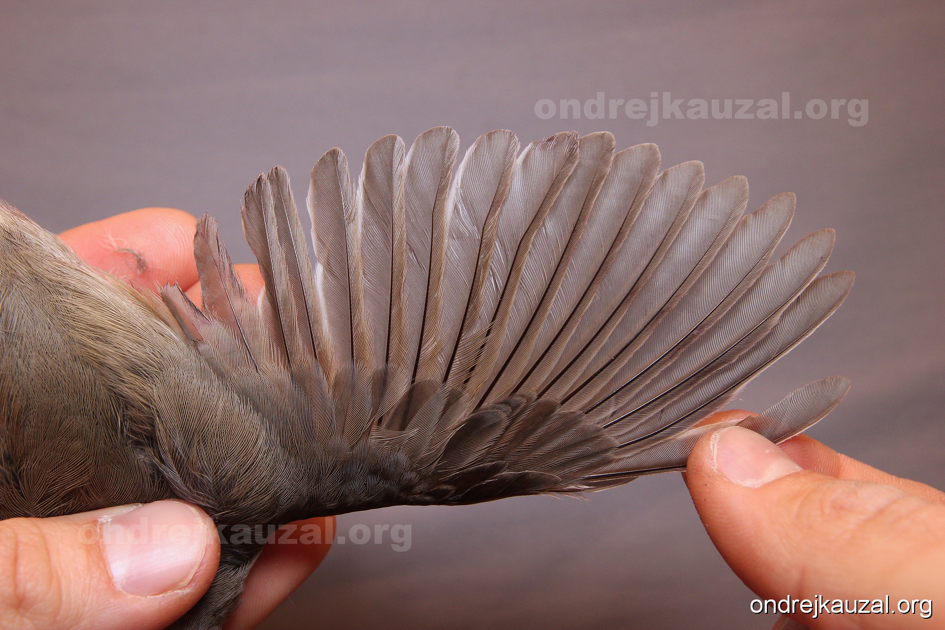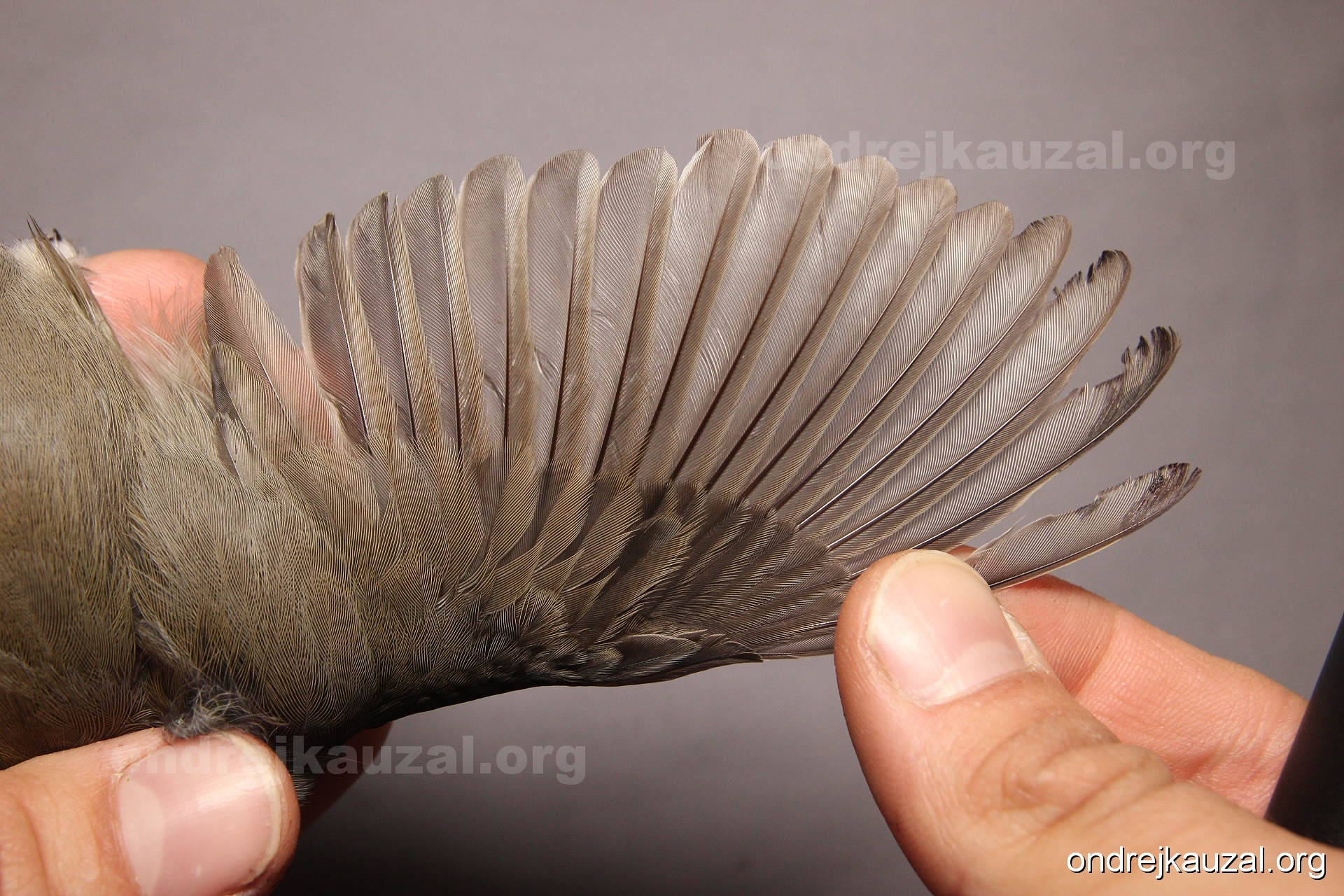 A bird showing nice fault bar across its remiges. While definitely not a good thing for the bird itself, such phenonema can aid in ageing. The uniform position of this bar from the wing indicates the wing feathers grew at the same time, i.e. on nest suggesting this bird is a young individual.