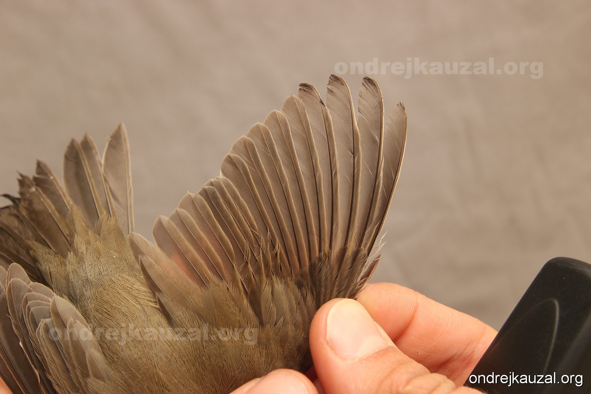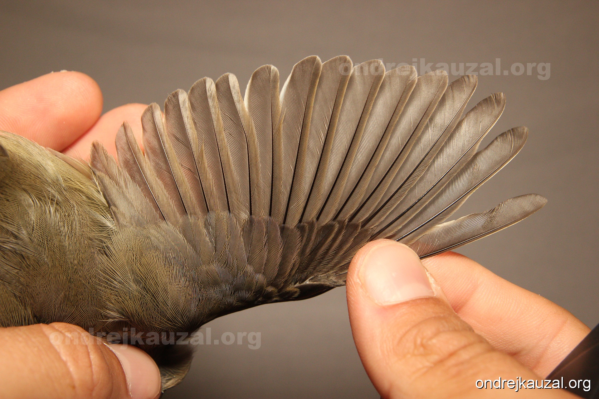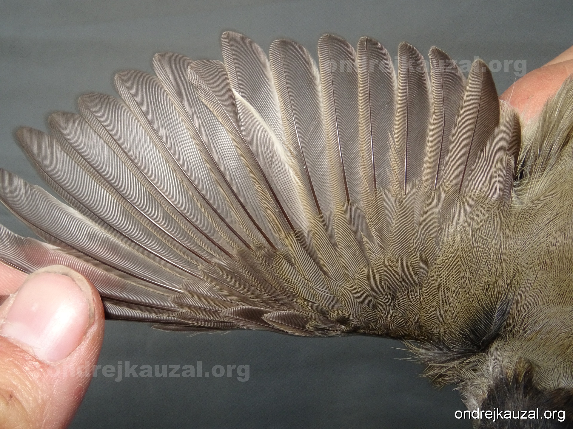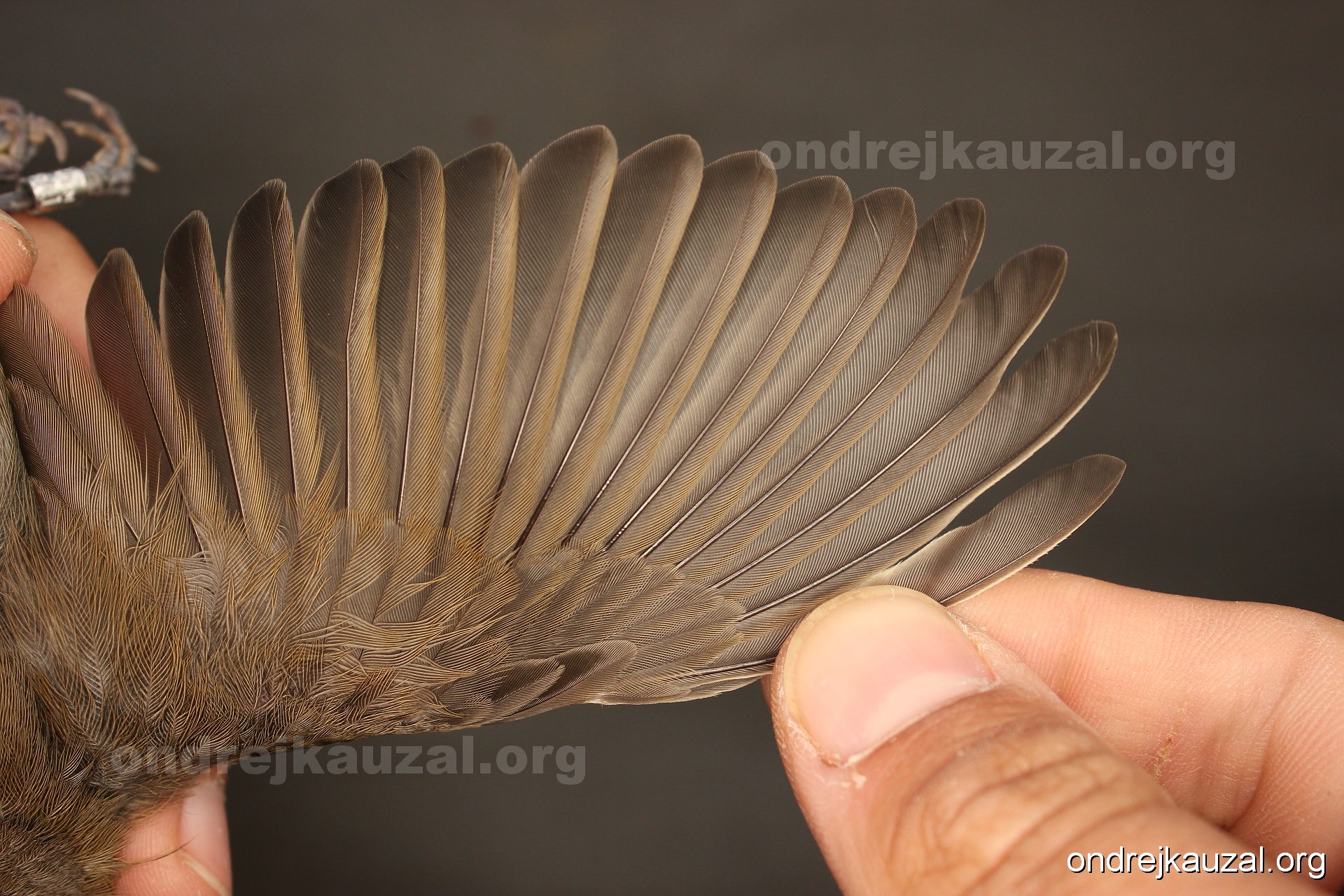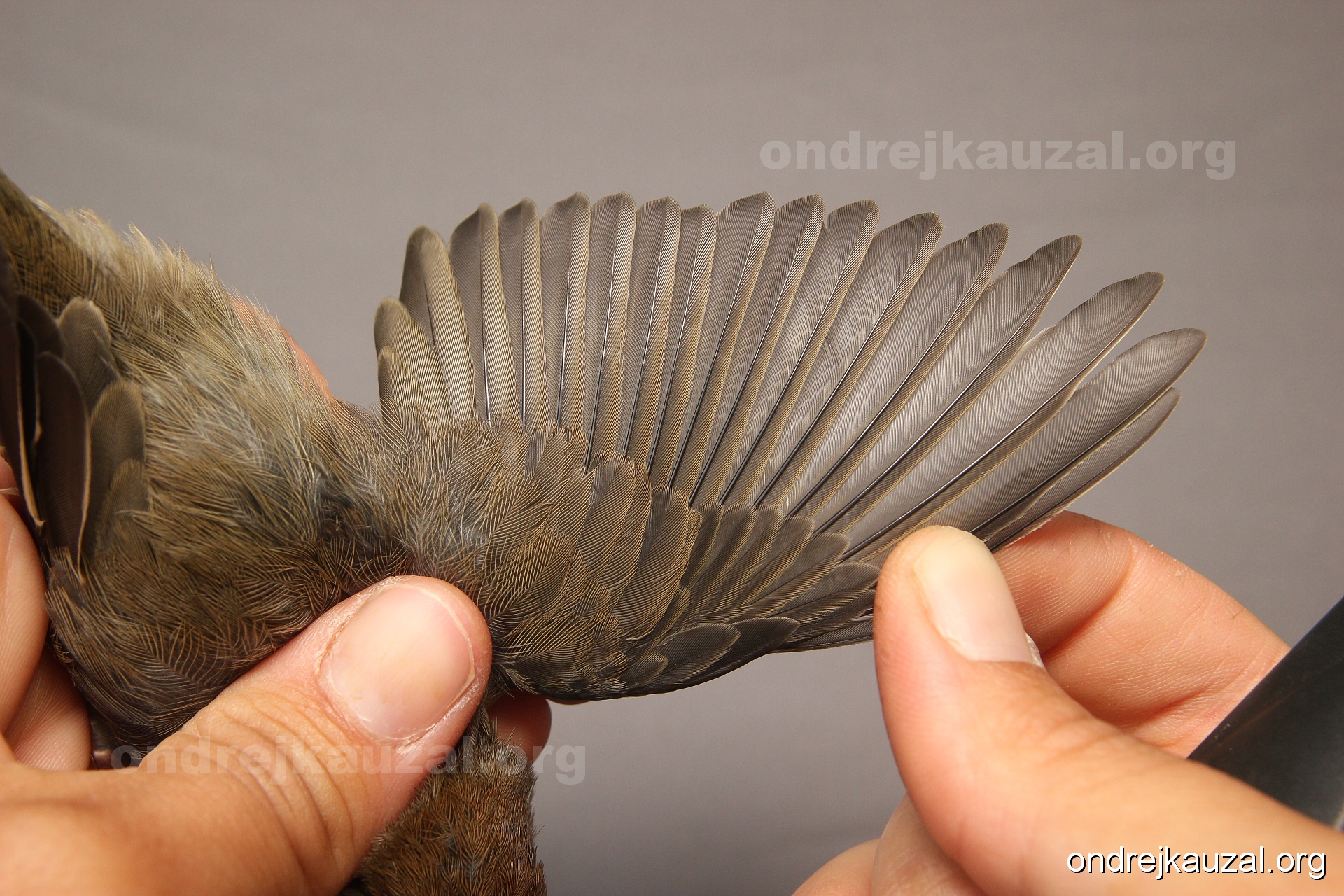 A bird showing nice fault bar across its remiges. While definitely not a good thing for the bird itself, such phenonema can aid in ageing. The uniform position of this bar from the wing indicates the wing feathers grew at the same time, i.e. on nest suggesting this bird is a young individual.