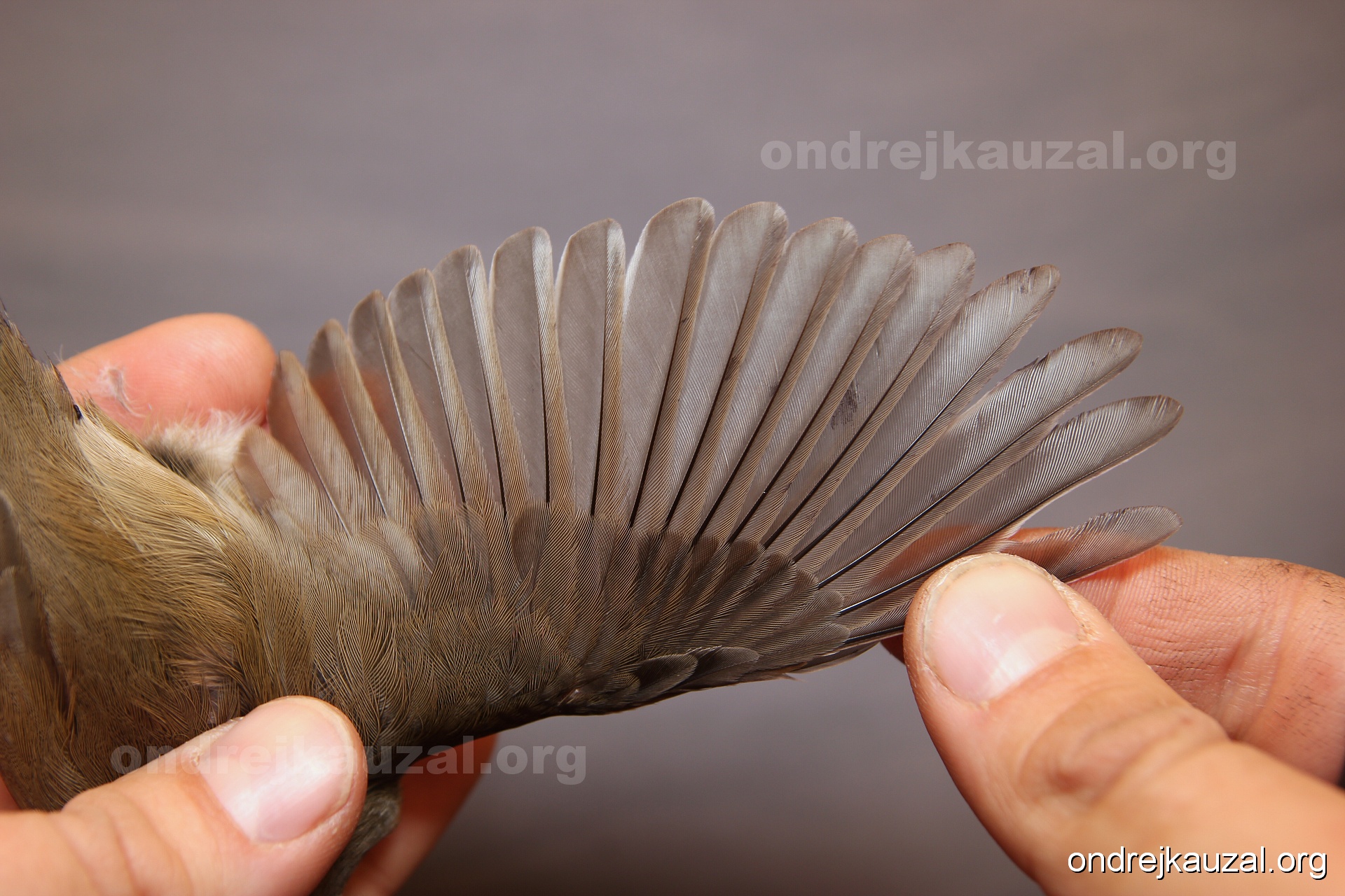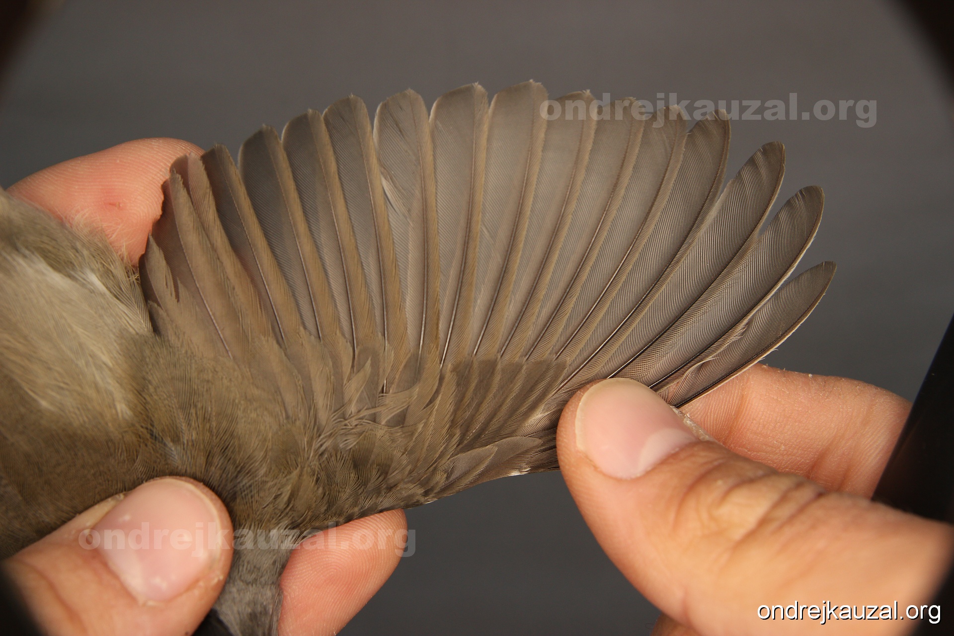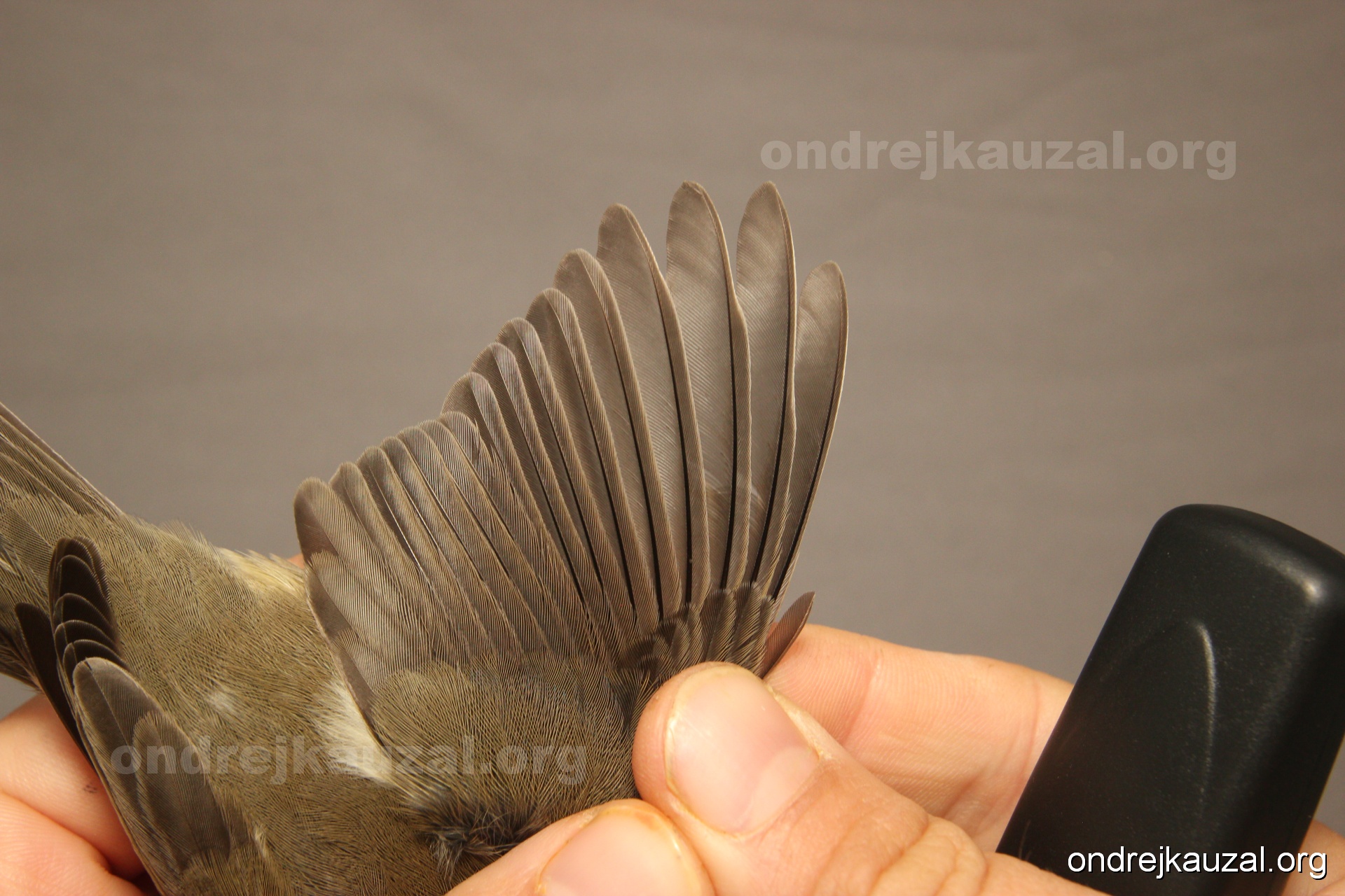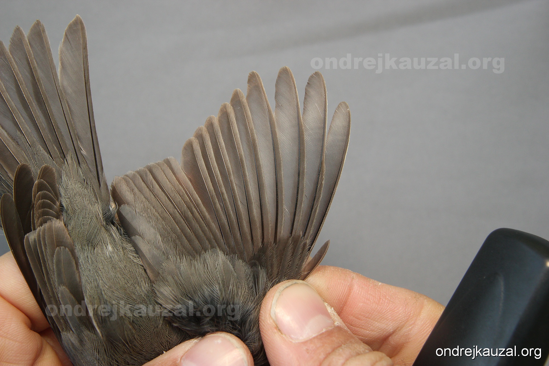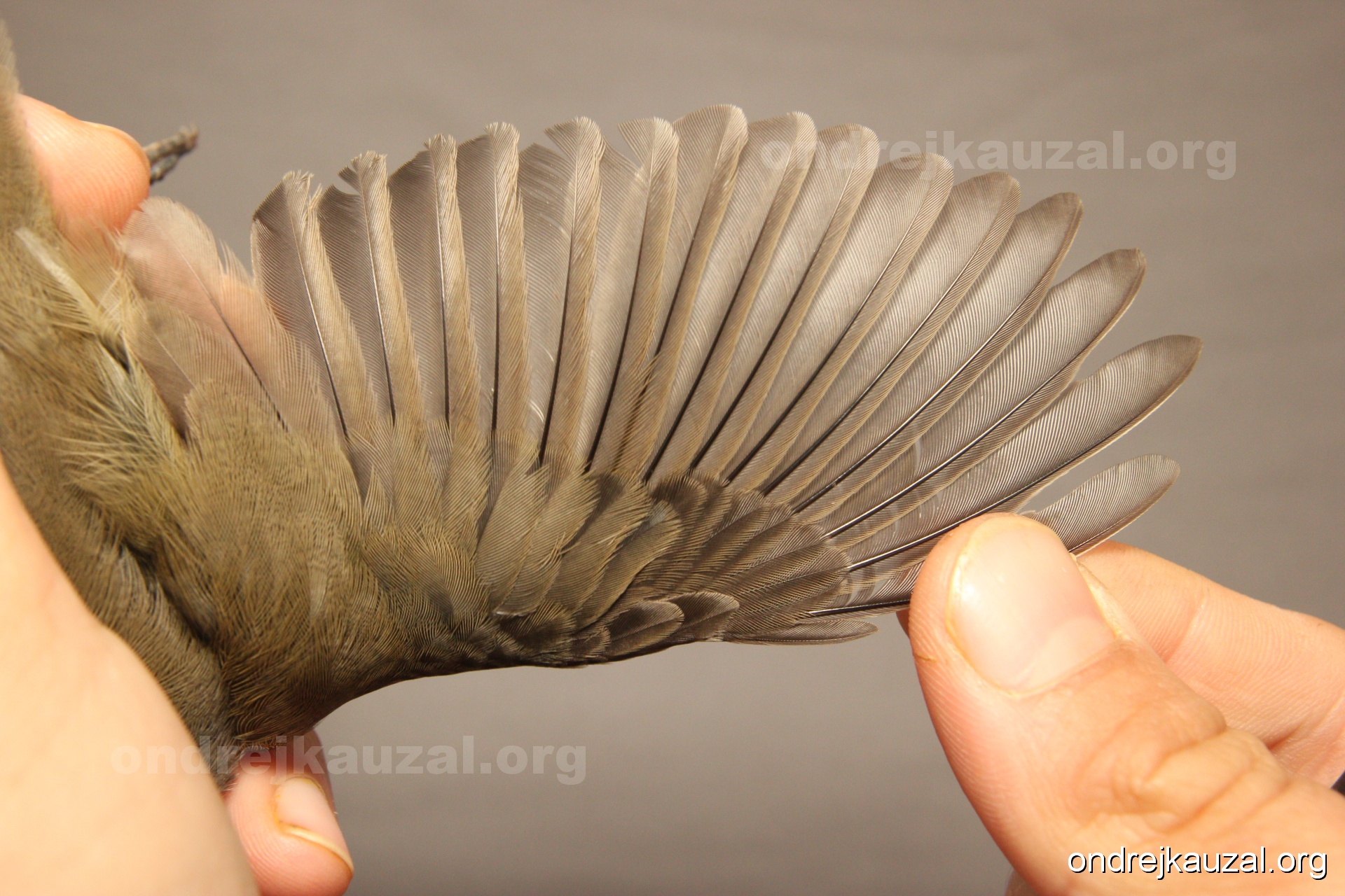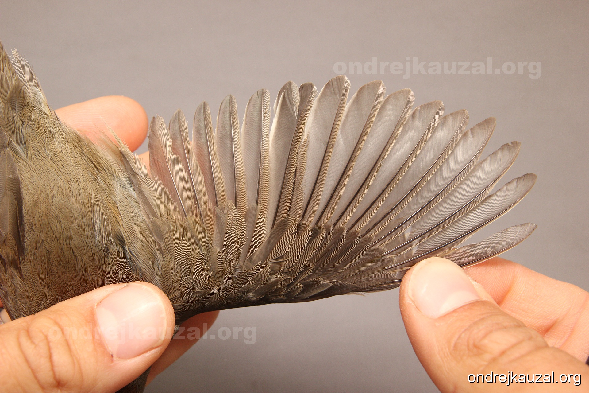A bird showing nice fault bar across its remiges. While definitely not a good thing for the bird itself, such phenonema can aid in ageing. The uniform position of this bar from the wing indicates the wing feathers grew at the same time, i.e. on nest suggesting this bird is a young individual.