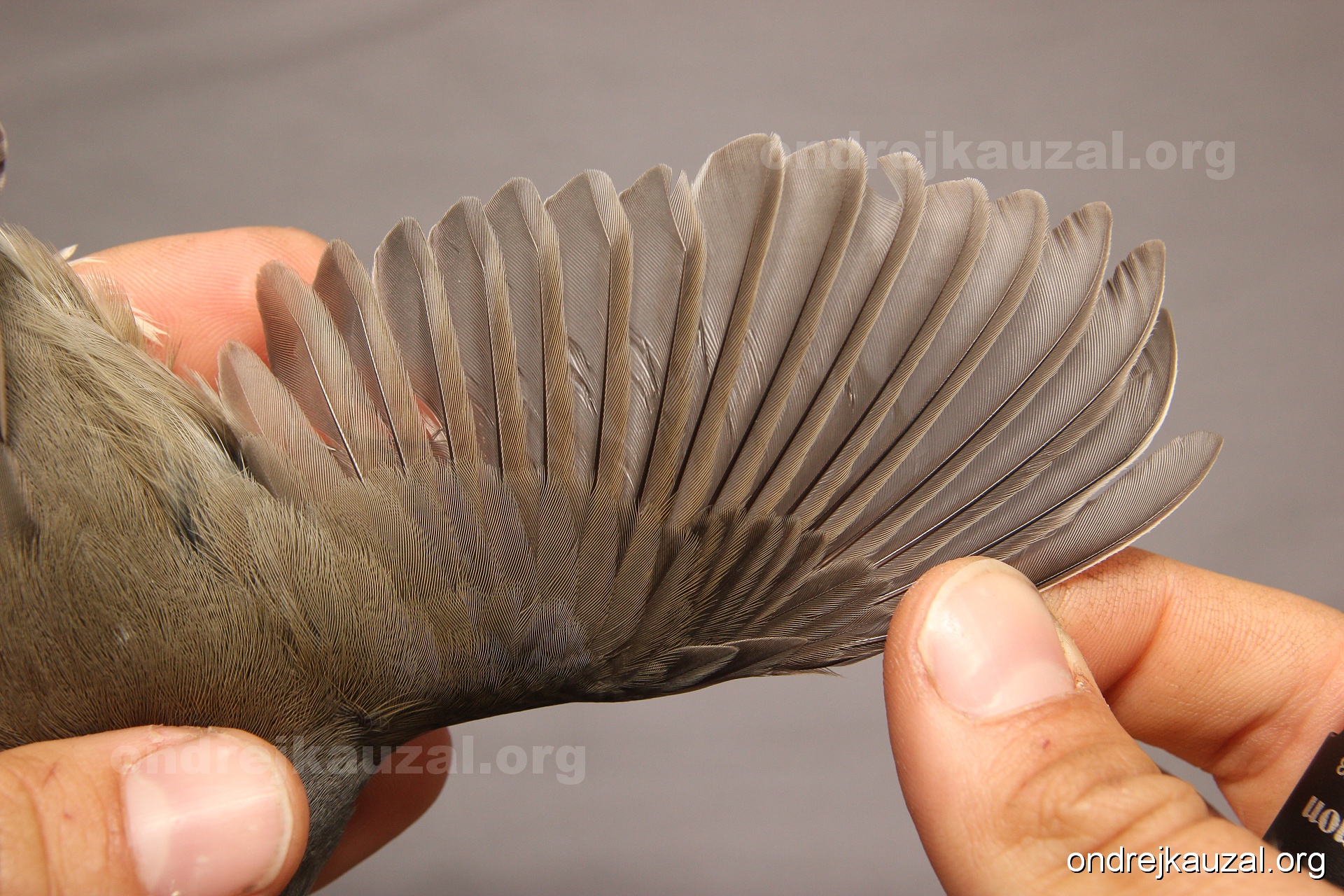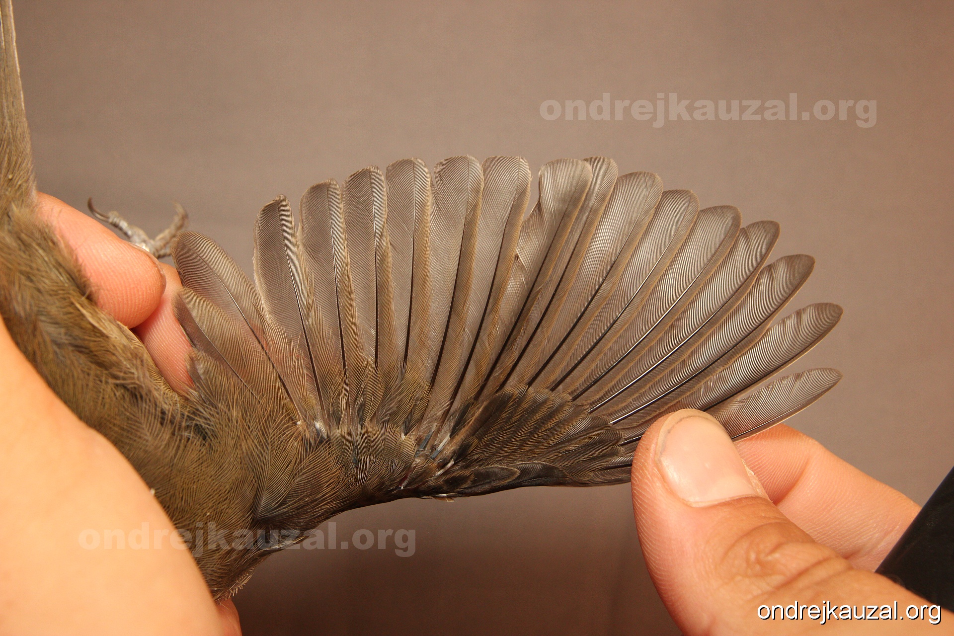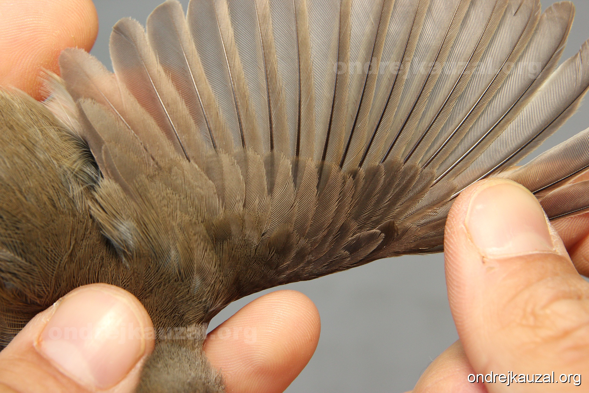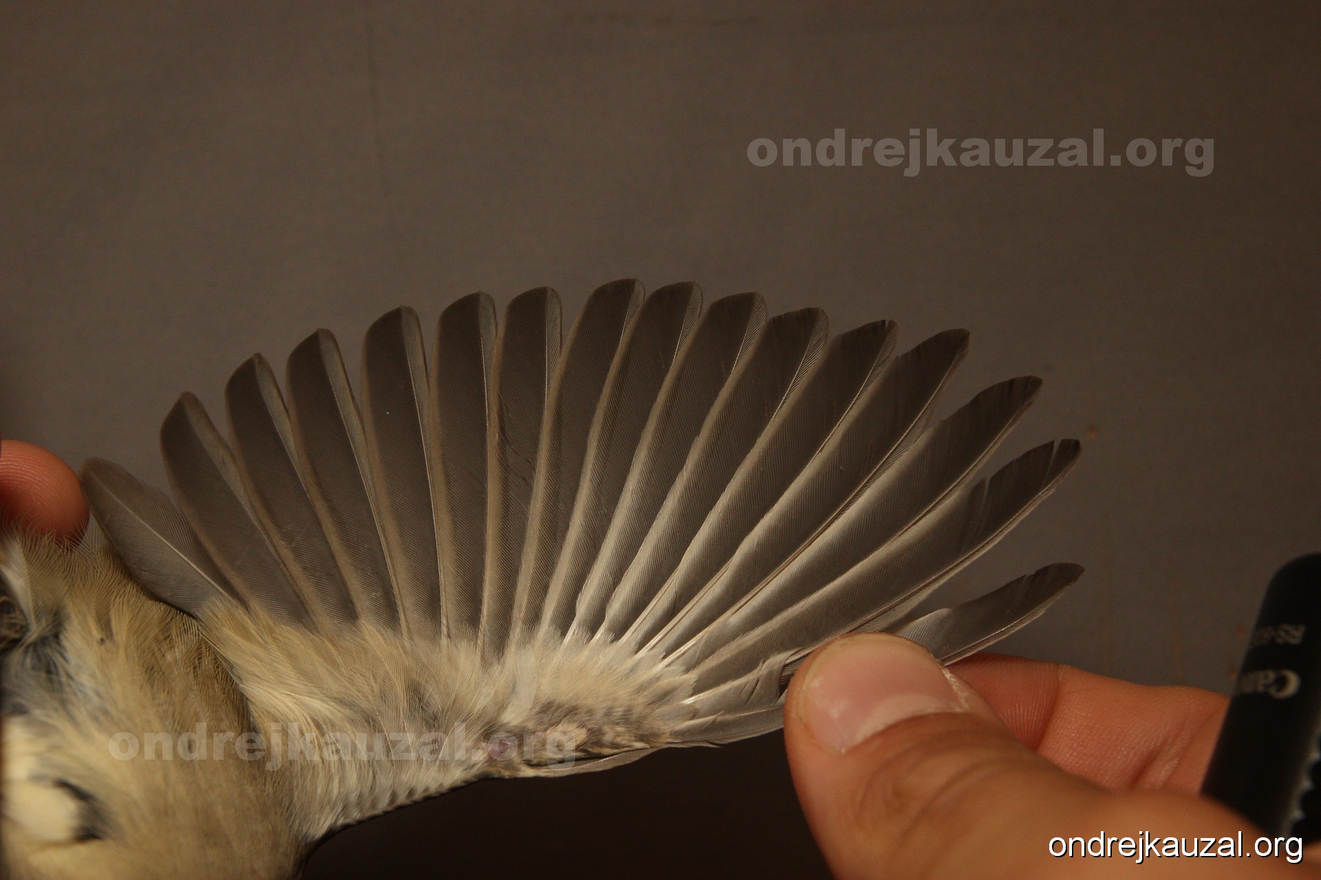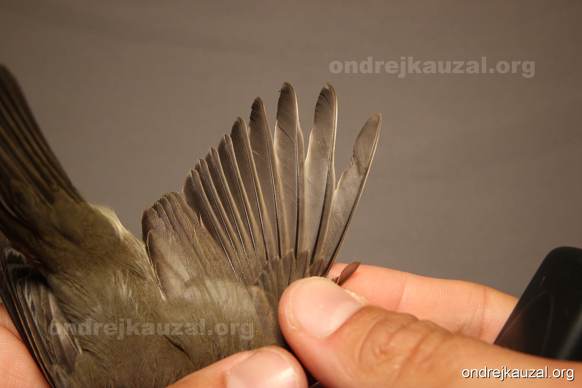 A bird showing nice fault bar across its remiges. While definitely not a good thing for the bird itself, such phenonema can aid in ageing. The uniform position of this bar from the wing indicates the wing feathers grew at the same time, i.e. on nest suggesting this bird is a young individual.