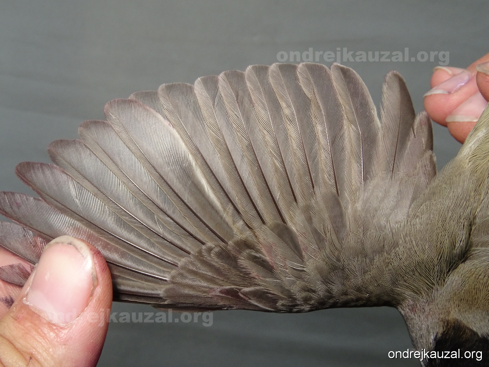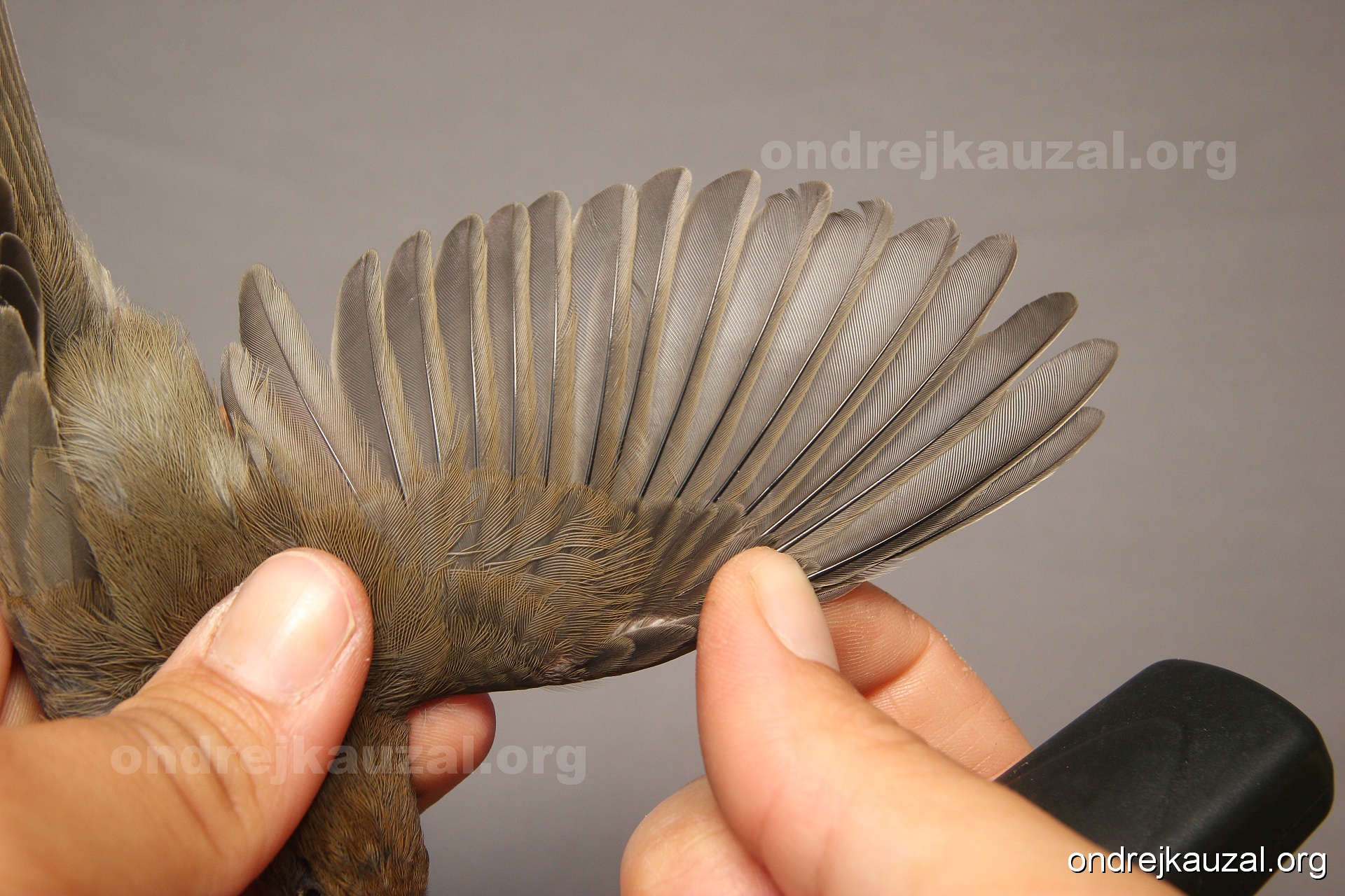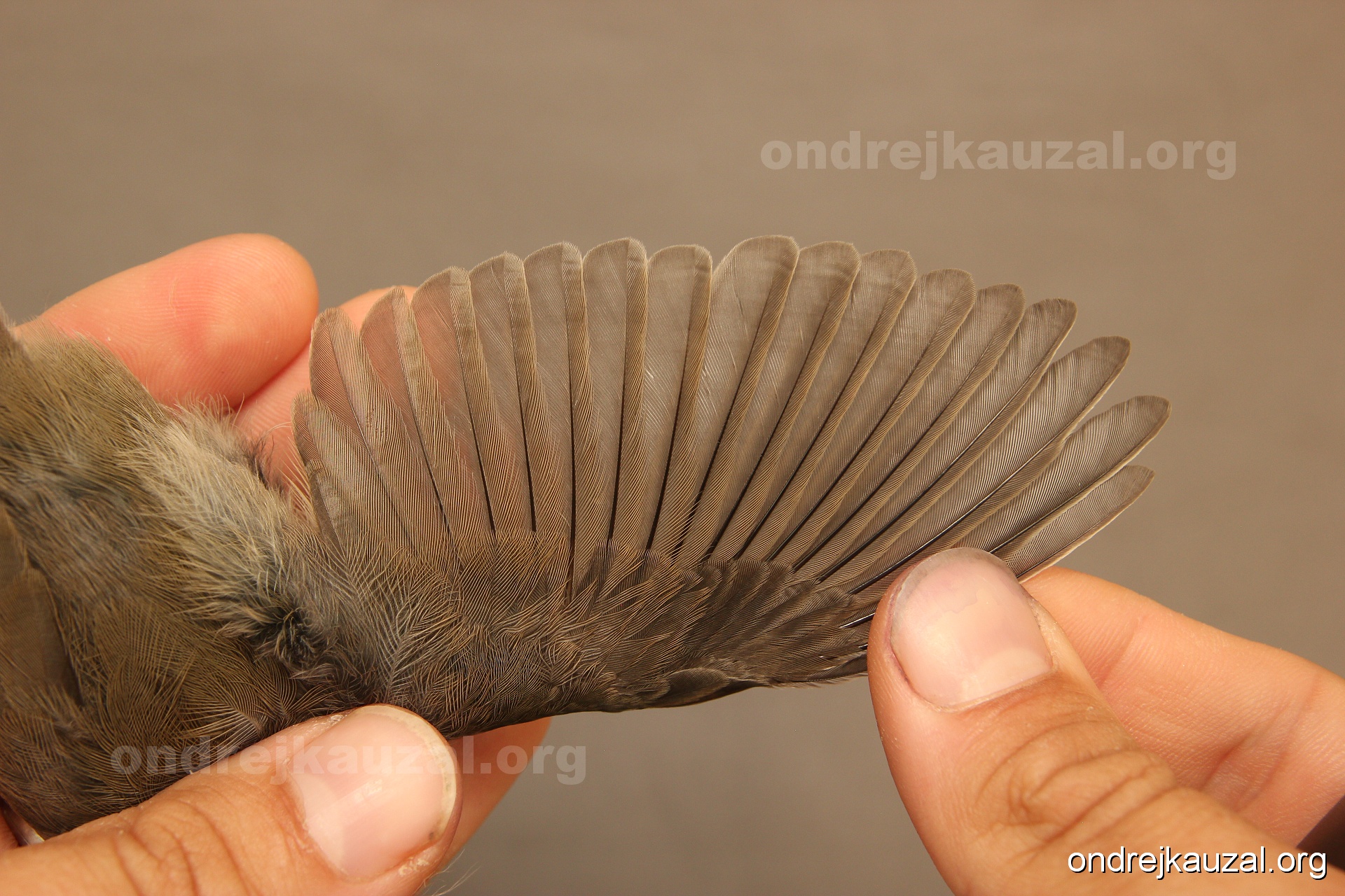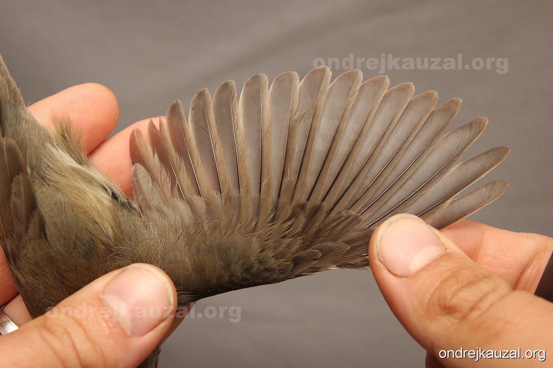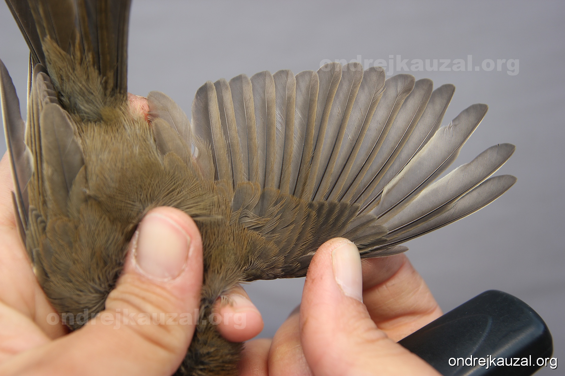 A bird showing nice fault bar across its remiges. While definitely not a good thing for the bird itself, such phenonema can aid in ageing. The uniform position of this bar from the wing indicates the wing feathers grew at the same time, i.e. on nest suggesting this bird is a young individual.