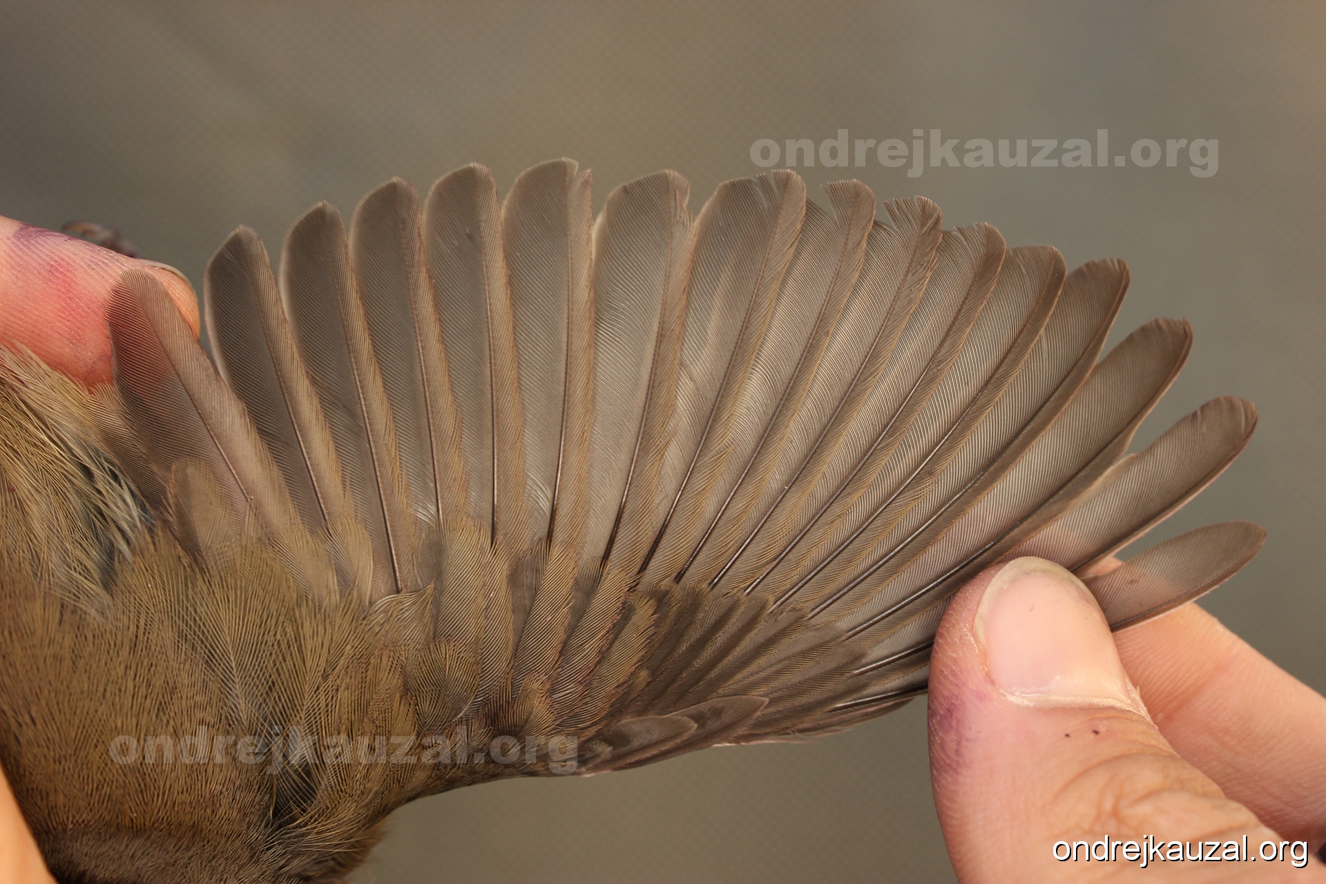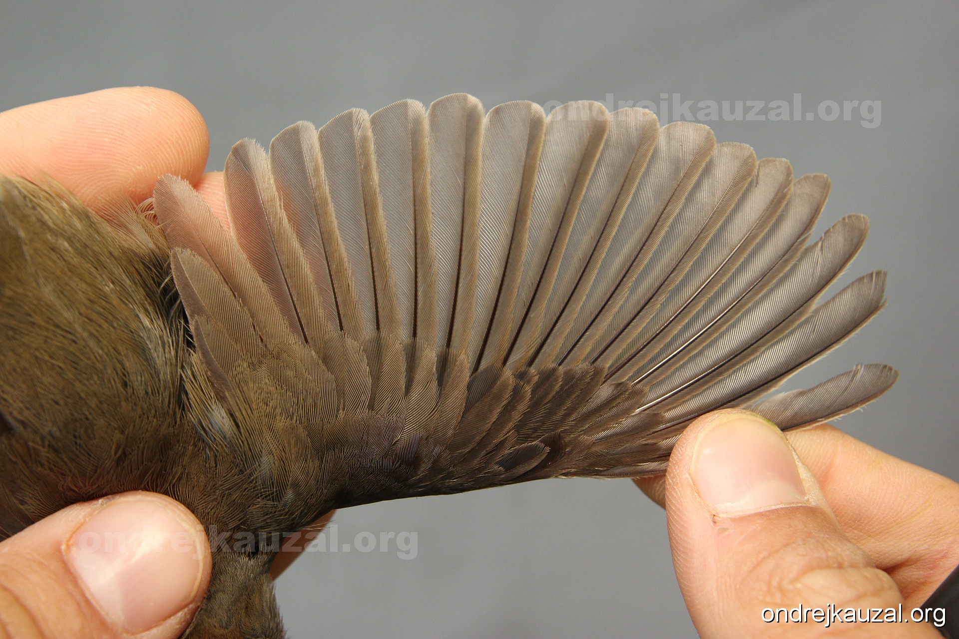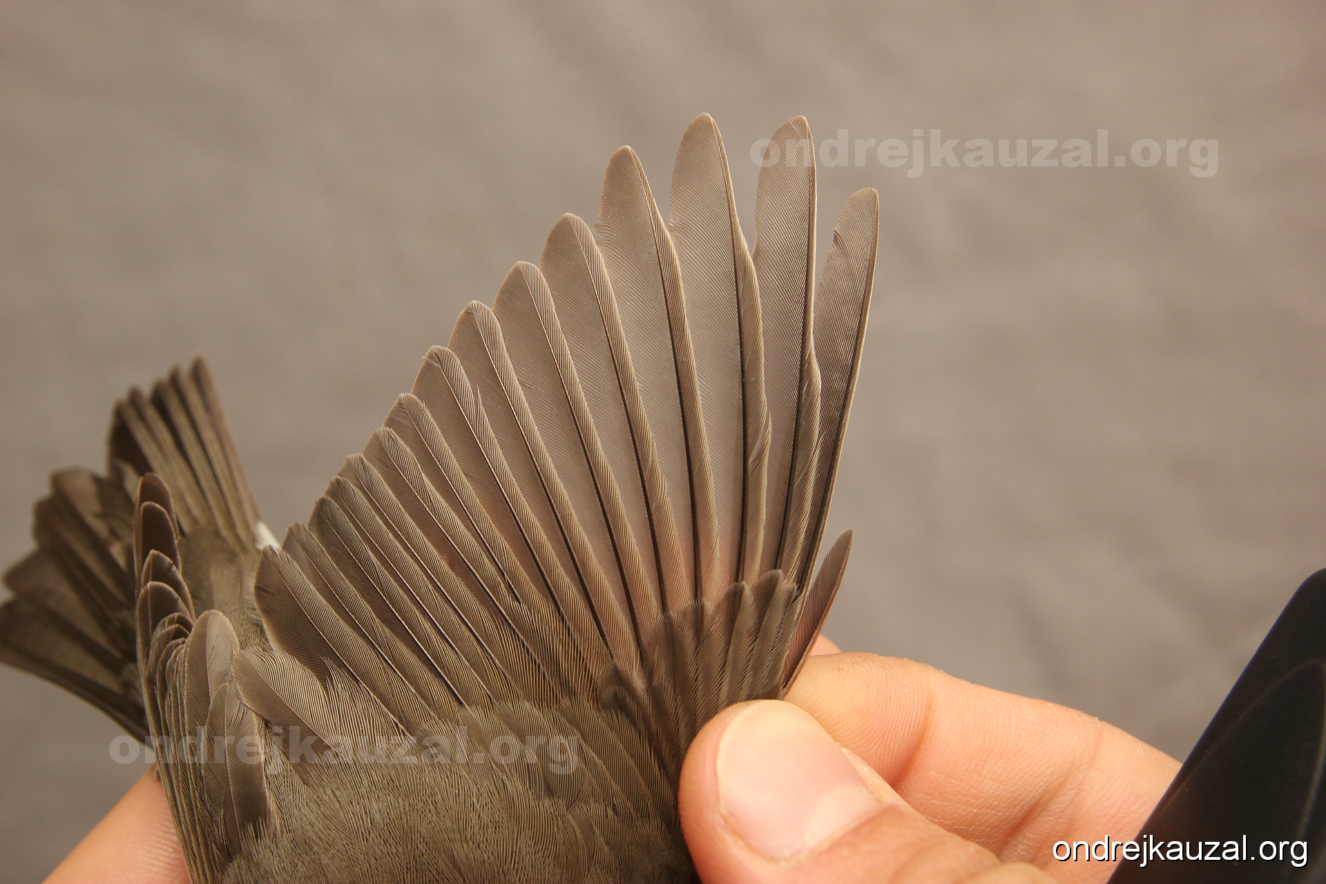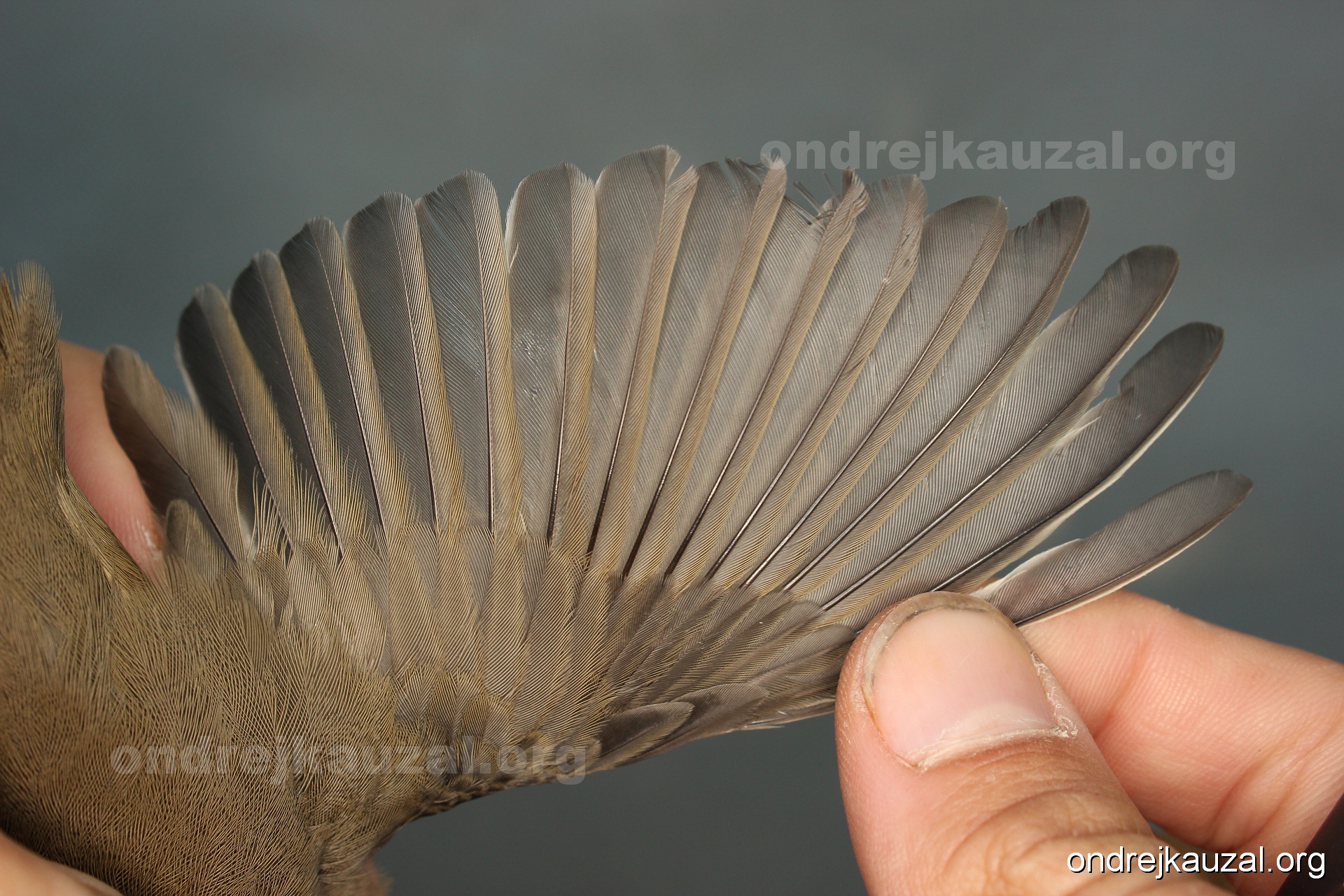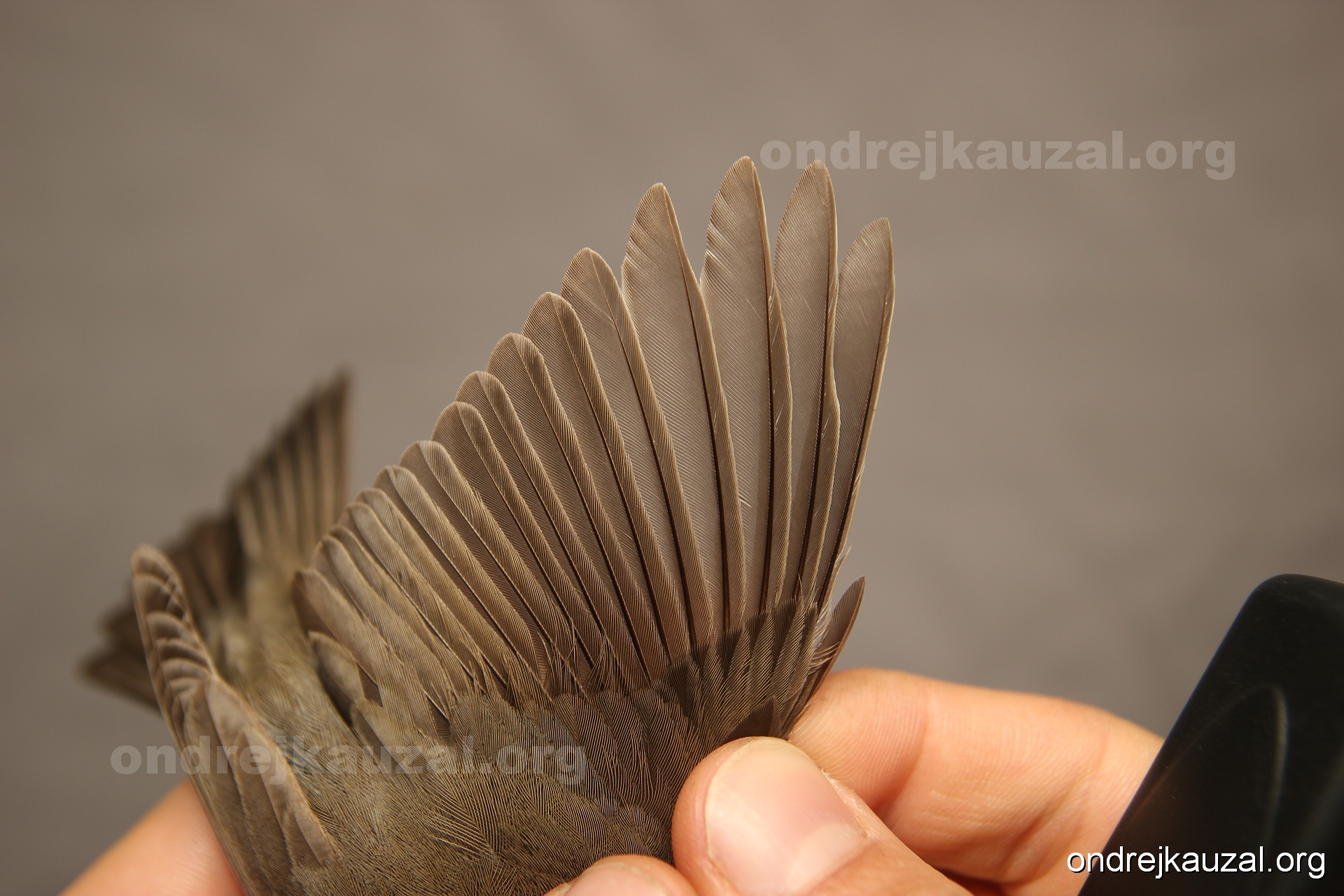 A bird showing nice fault bar across its remiges. While definitely not a good thing for the bird itself, such phenonema can aid in ageing. The uniform position of this bar from the wing indicates the wing feathers grew at the same time, i.e. on nest suggesting this bird is a young individual.
