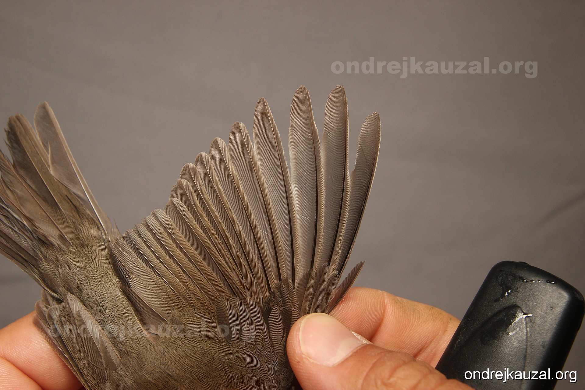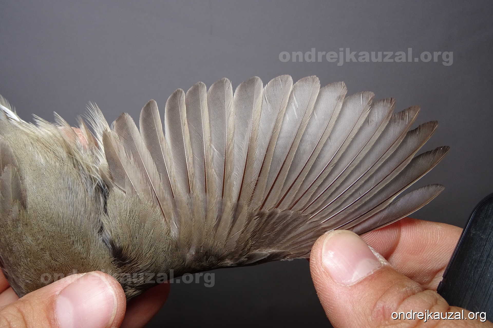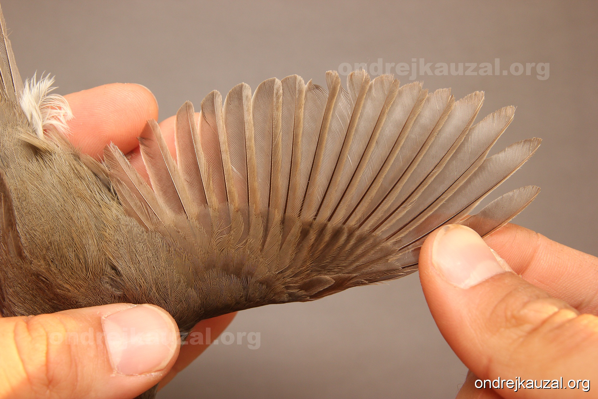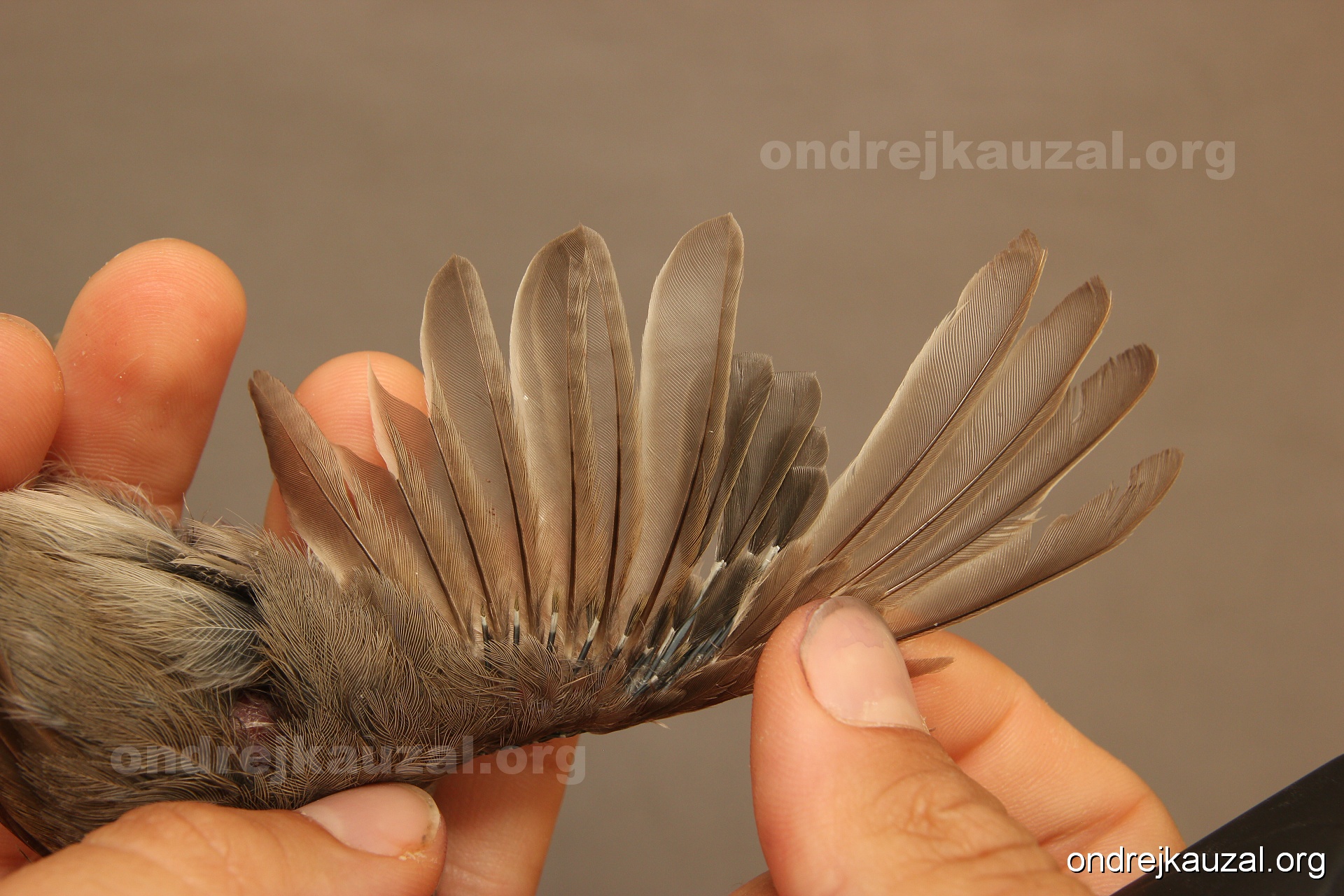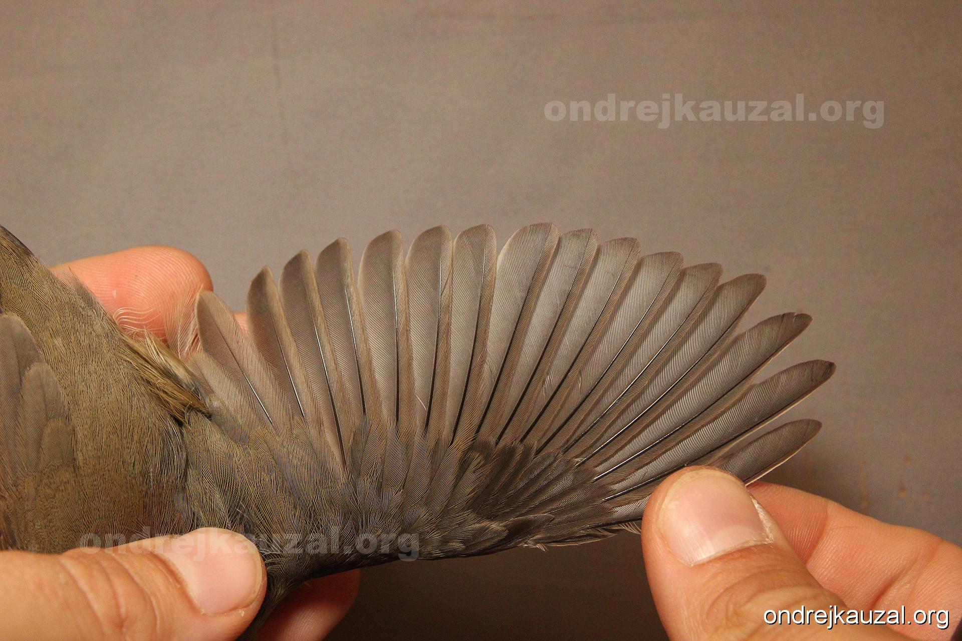 A bird showing nice fault bar across its remiges. While definitely not a good thing for the bird itself, such phenonema can aid in ageing. The uniform position of this bar from the wing indicates the wing feathers grew at the same time, i.e. on nest suggesting this bird is a young individual.