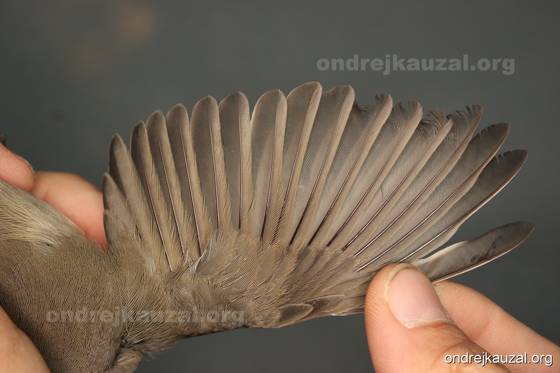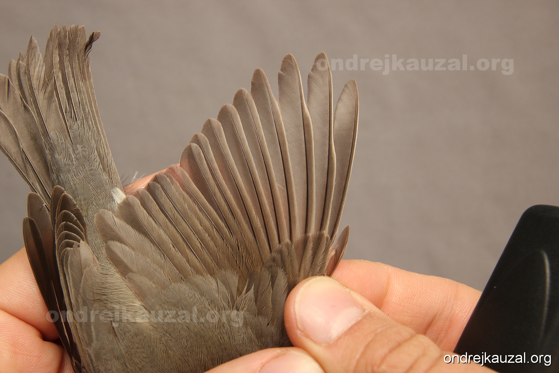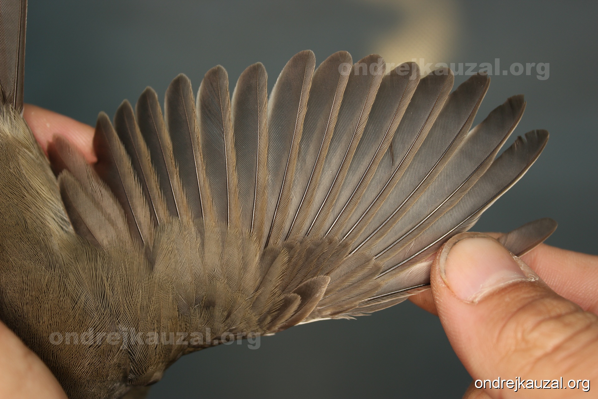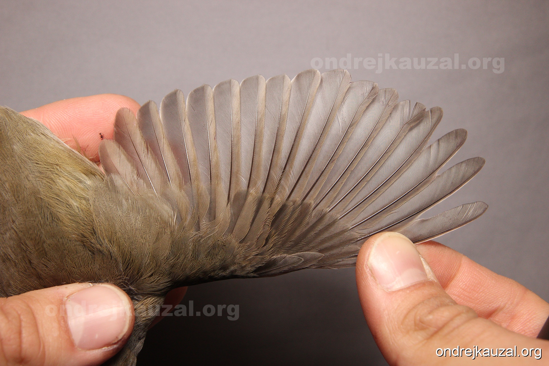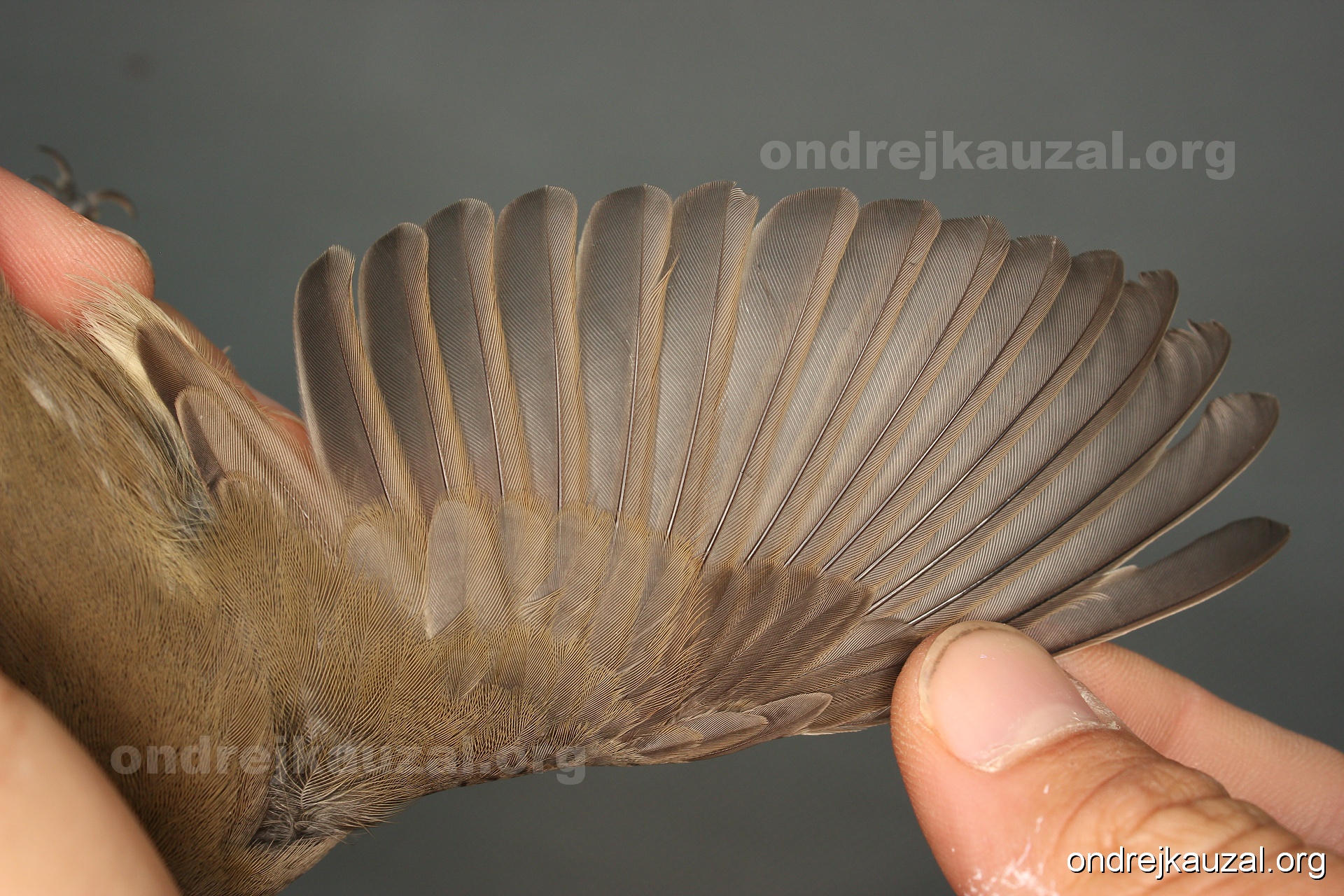 A bird showing nice fault bar across its remiges. While definitely not a good thing for the bird itself, such phenonema can aid in ageing. The uniform position of this bar from the wing indicates the wing feathers grew at the same time, i.e. on nest suggesting this bird is a young individual.