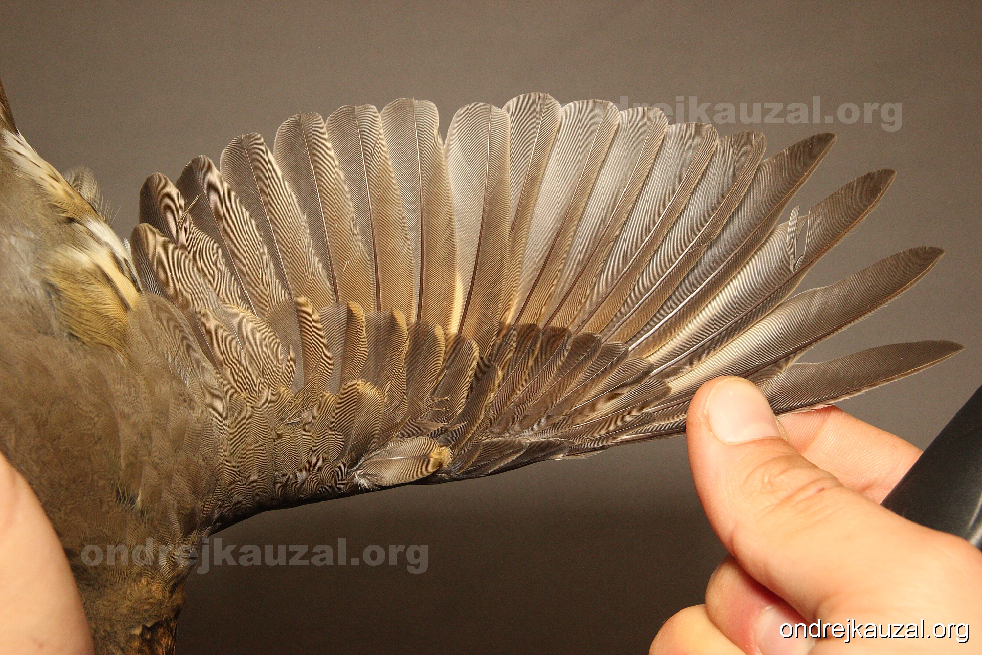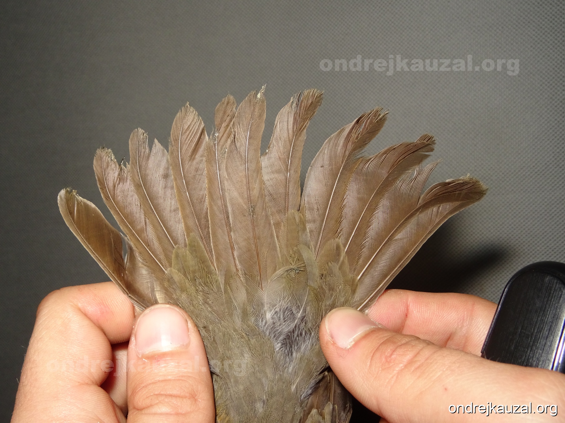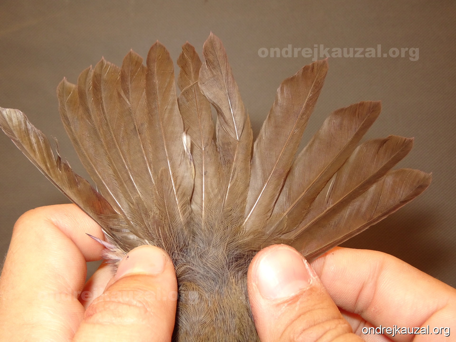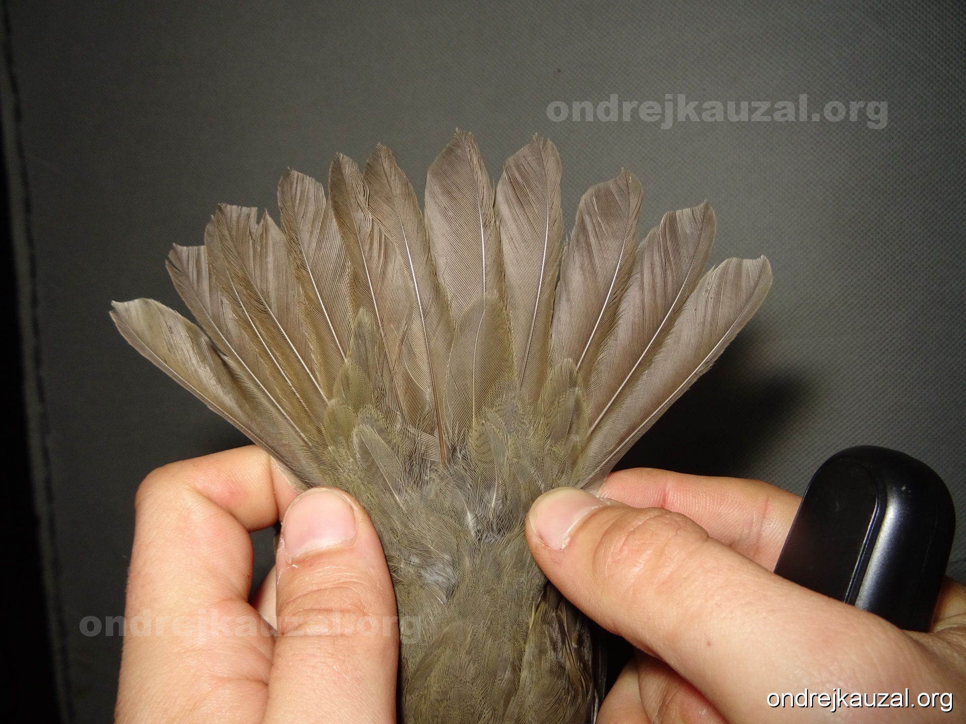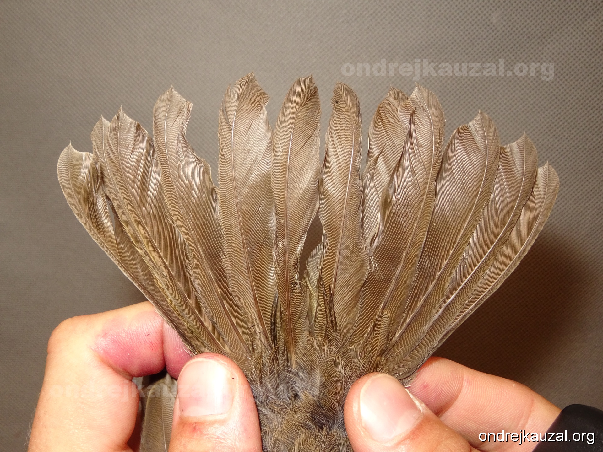 There is a nice fault bar visible in its tail. Its position suggest a simultaneous growth and shape suggest juvenile feathers. The visible moult-limit in the greater coverts furthermore supports ageing as 2CY (euring: 5).